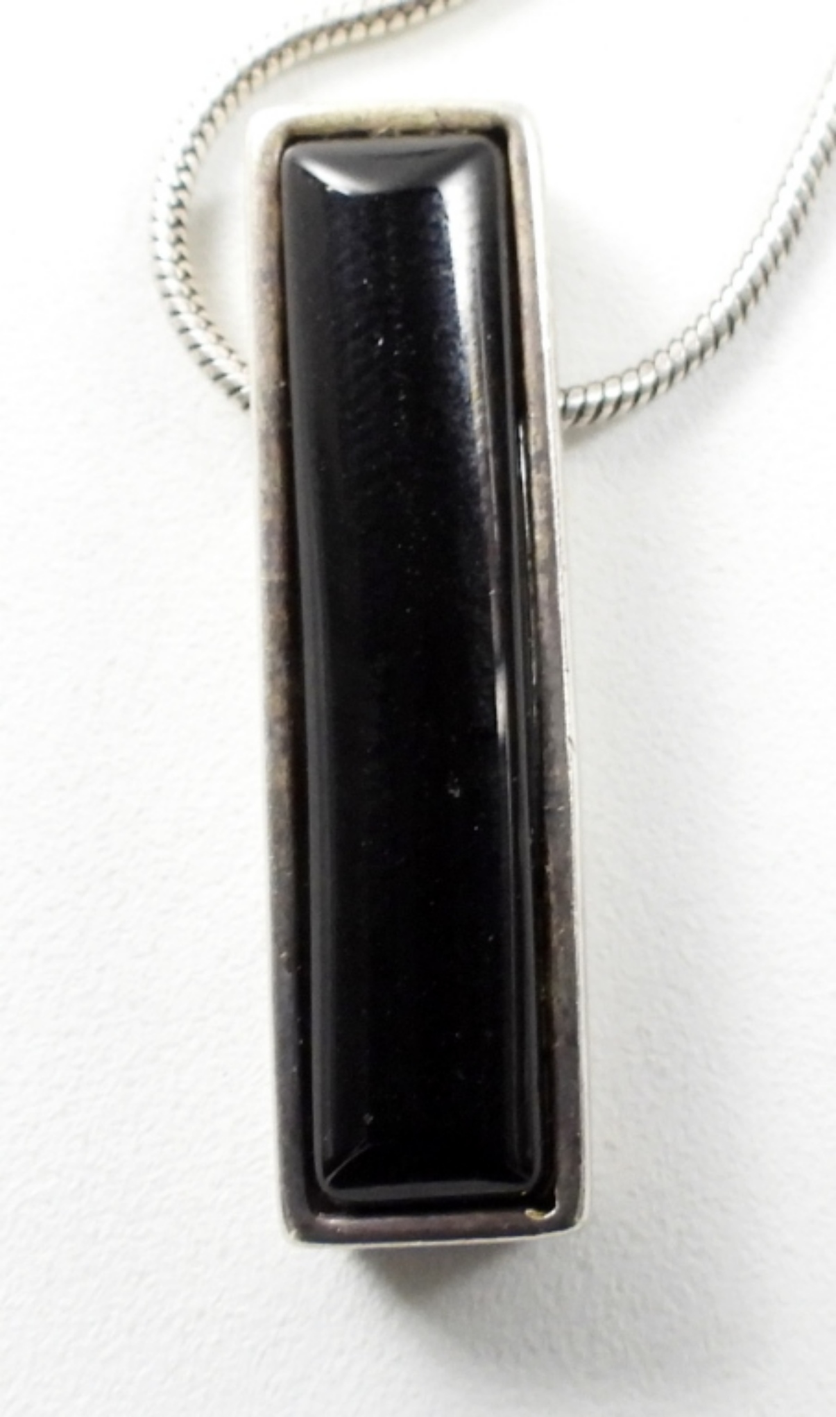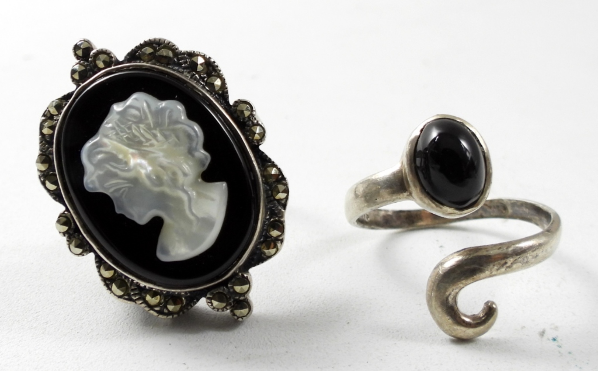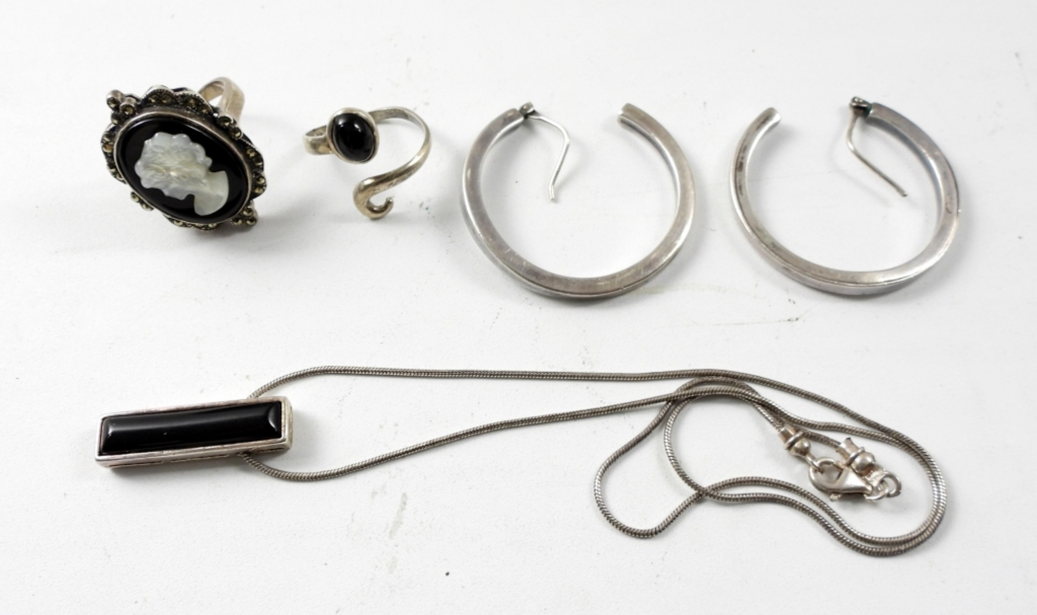 16″ STERLING NECKLACE WITH A BLACK ONIX PENDANT, SIZE 6.5 CAMEO RING, SIZE 6 RING WITH BLACK GEMSTONE AND A PAIR OF EARRINGS (17.3 DWT)