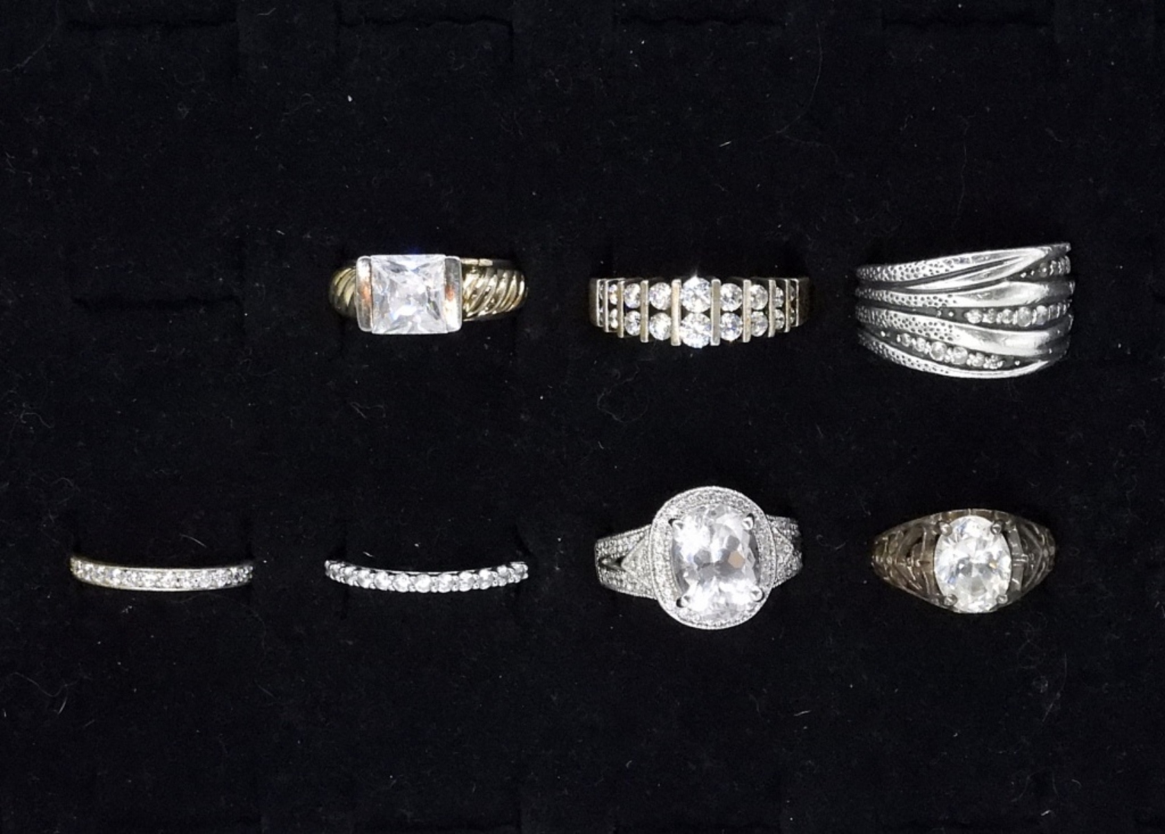 SIX STERLING BRIDAL STYLE RINGS. SIZES 7-11. SOME BANDS SLIGHTLY MISSHAPEN. 25.4 DWT