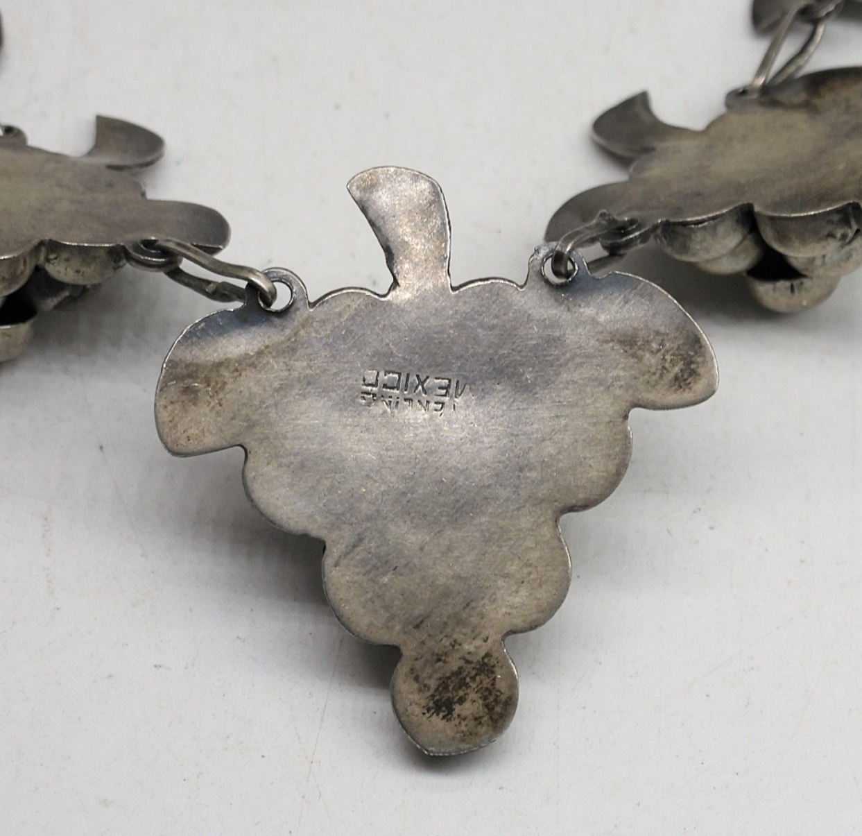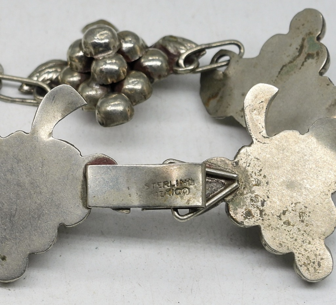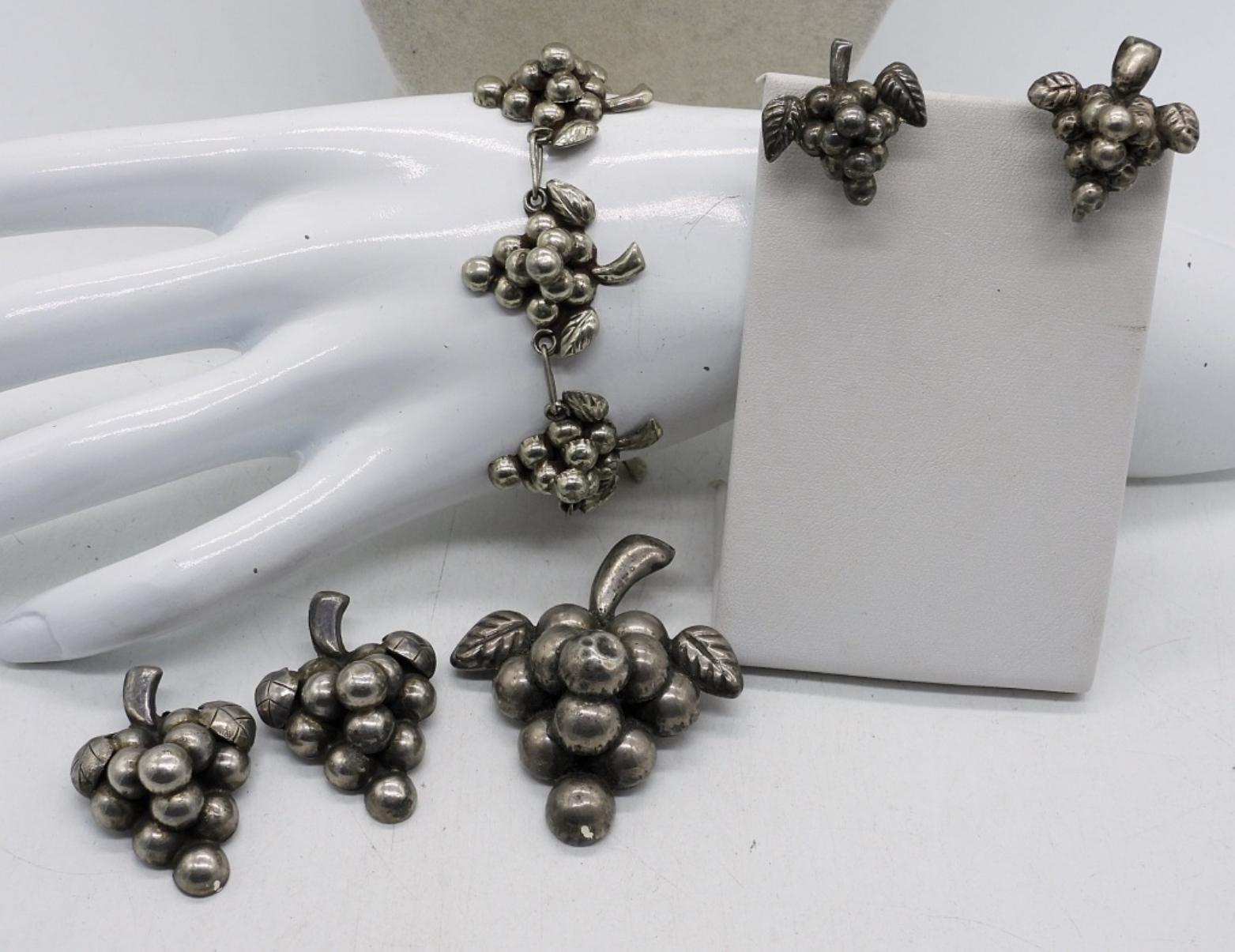 ALL MEXICO 925. NECKLACE 16″. BRACELET 8″. SCREW BACK EARRINGS. 3 BROOCHES. 39.3 DWT