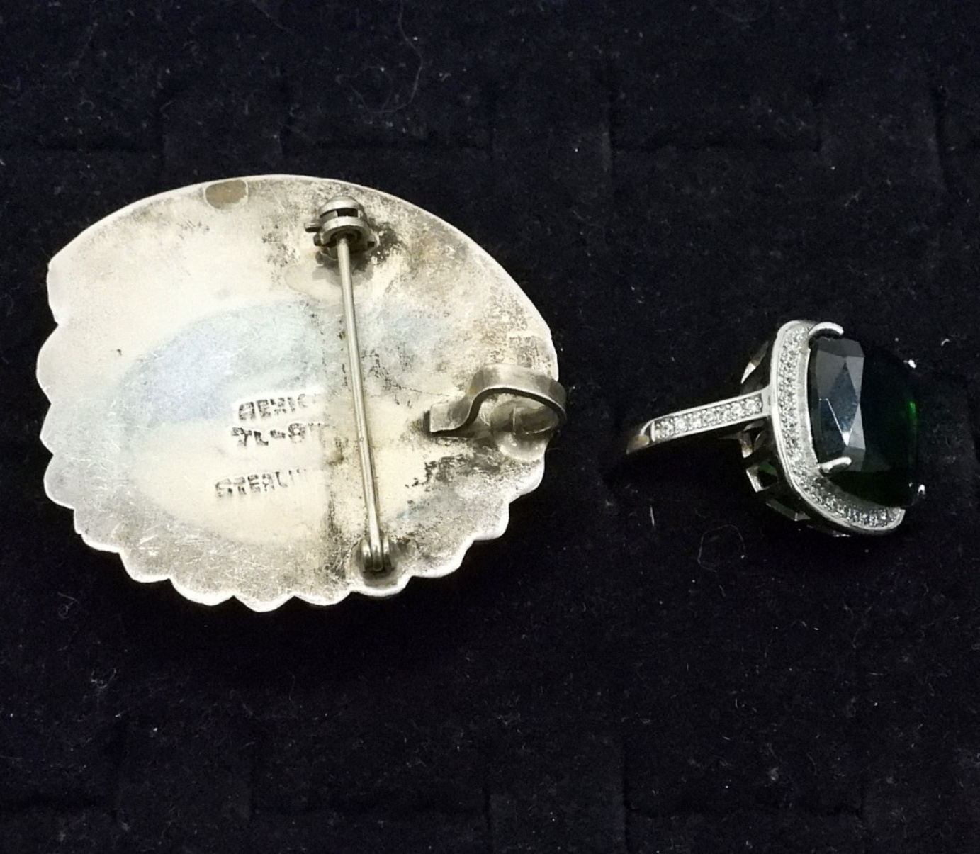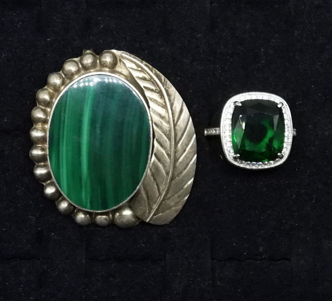 MEXICO 925 MALACHITE BROOCH, 2″. GORGEOUS STERLING RING WITH LARGE EMERALD COLORED GEMSTONE, SIZE 8. 16.9 DWT