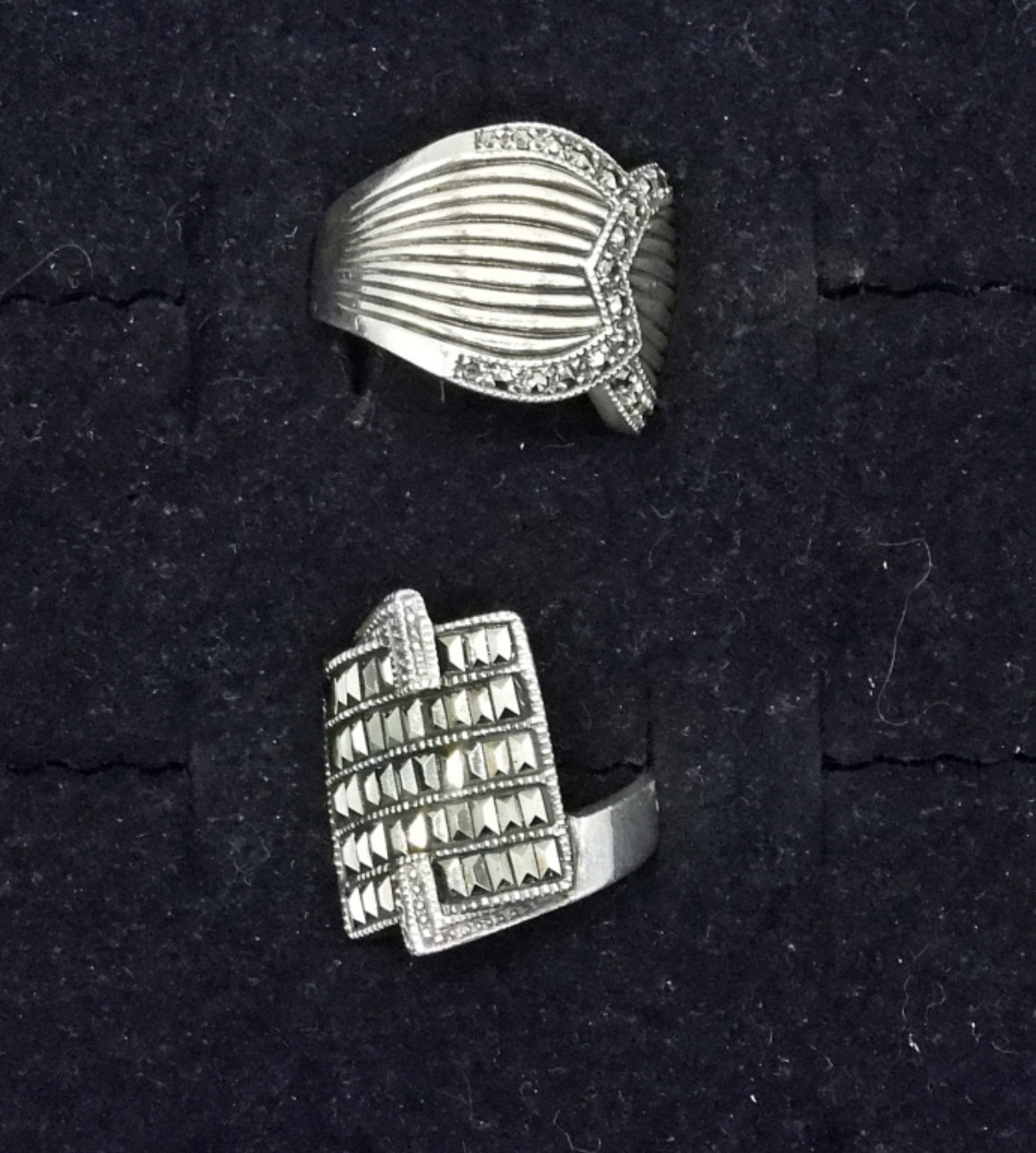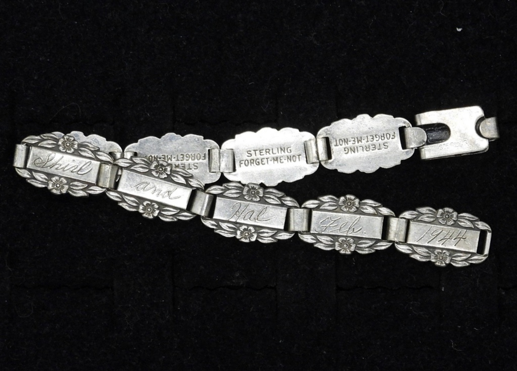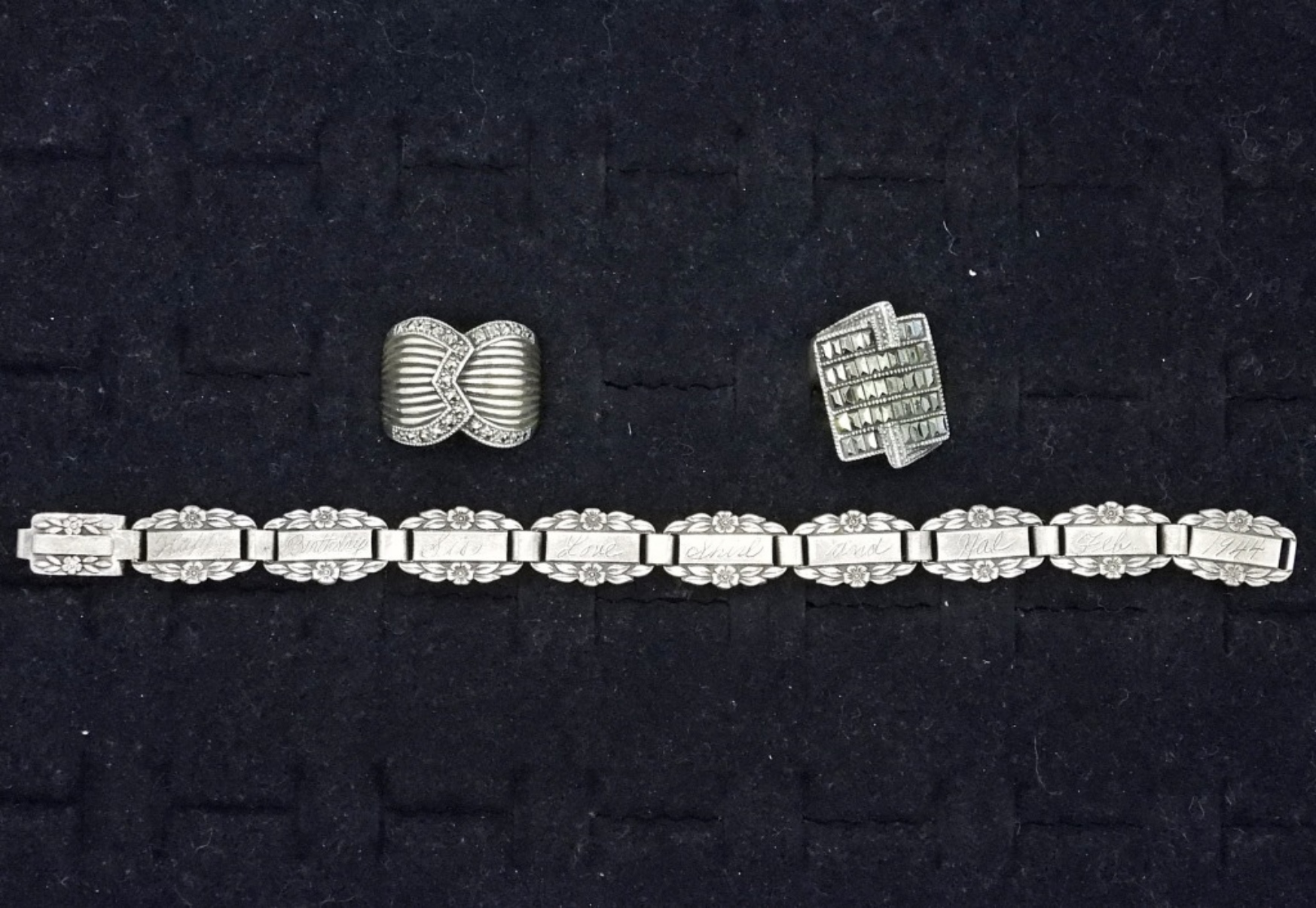 ANTIQUE STERLING BRACELET (FORGET ME NOT), ENGRAVED WITH “HAPPY BIRTHDAY SIS LOVE SHIRL AND HAL FEB 1944”. TWO STERLING MARCASITE RINGS, SIZES 6 & 8. 19 DWT