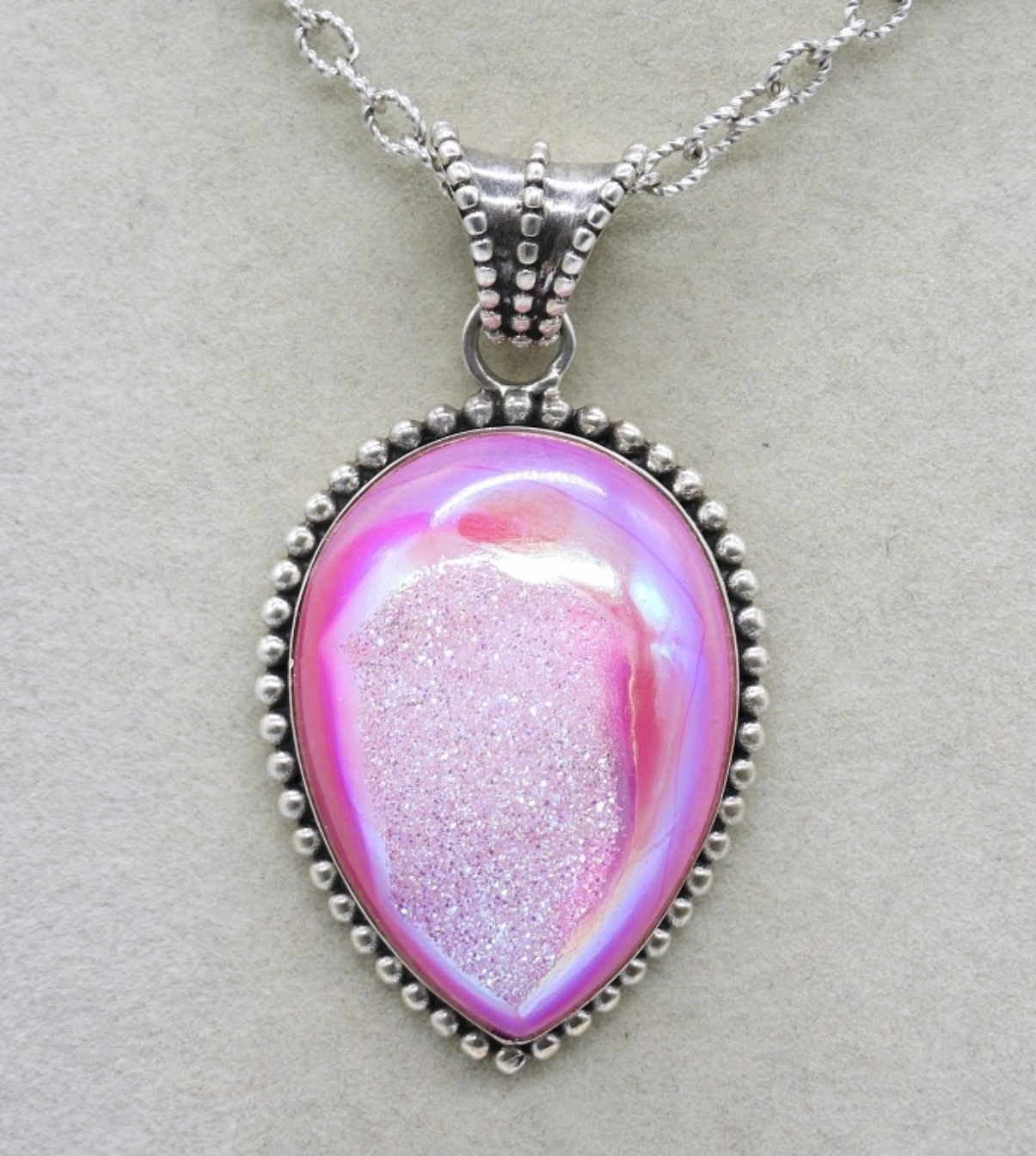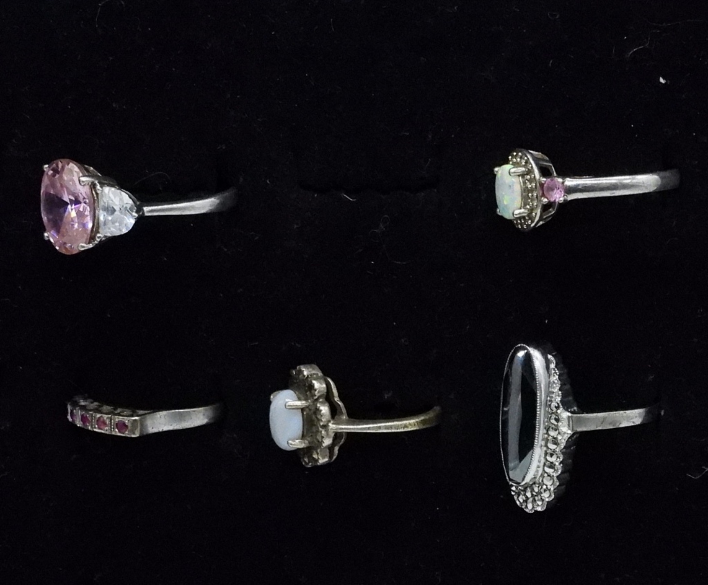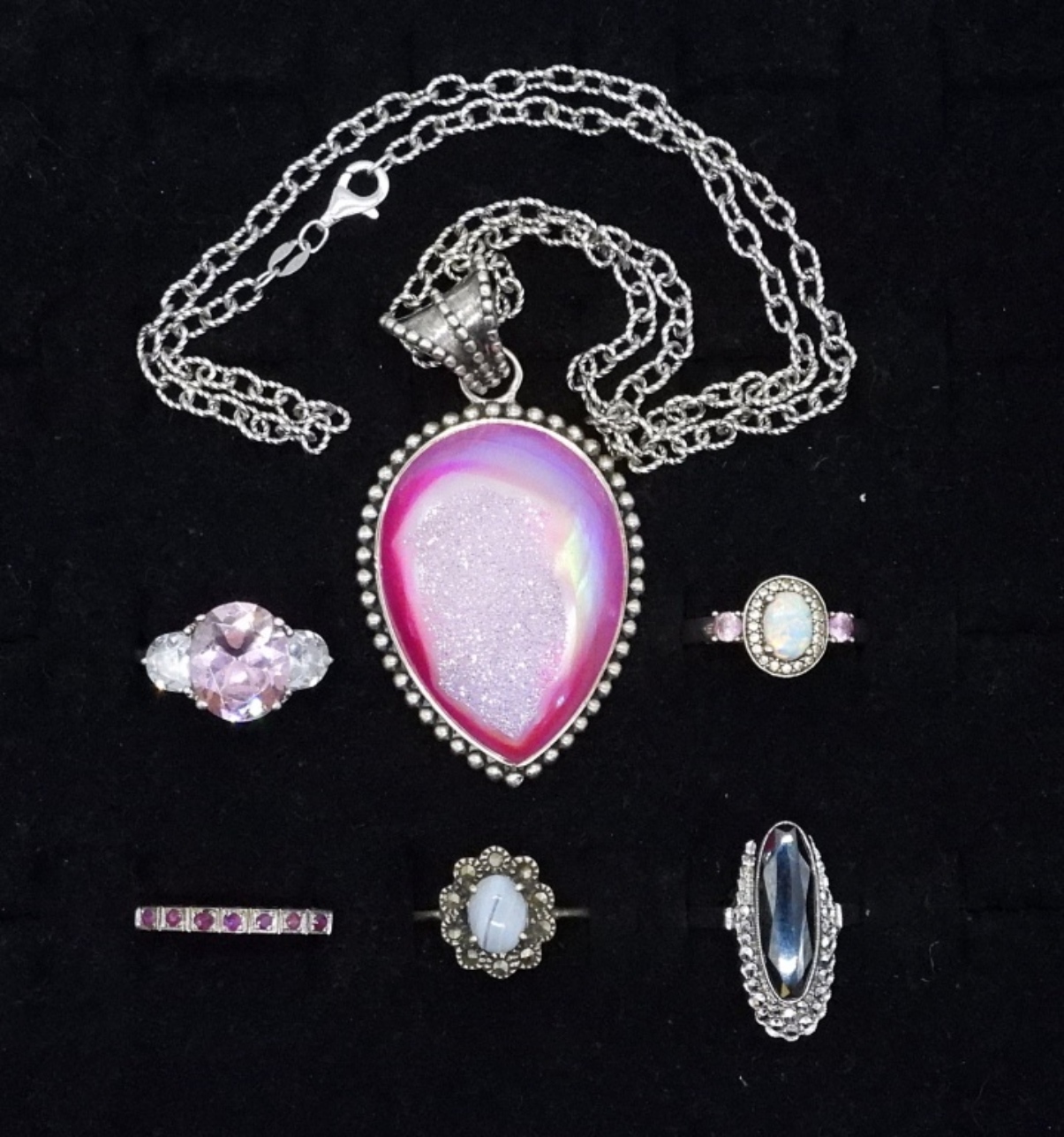 STERLING PINK DRUZY NECKLACE, 18″. FIVE STERLING FASHION GEMSTONE RINGS. SIZES 5-8.5. 28.2 DWT