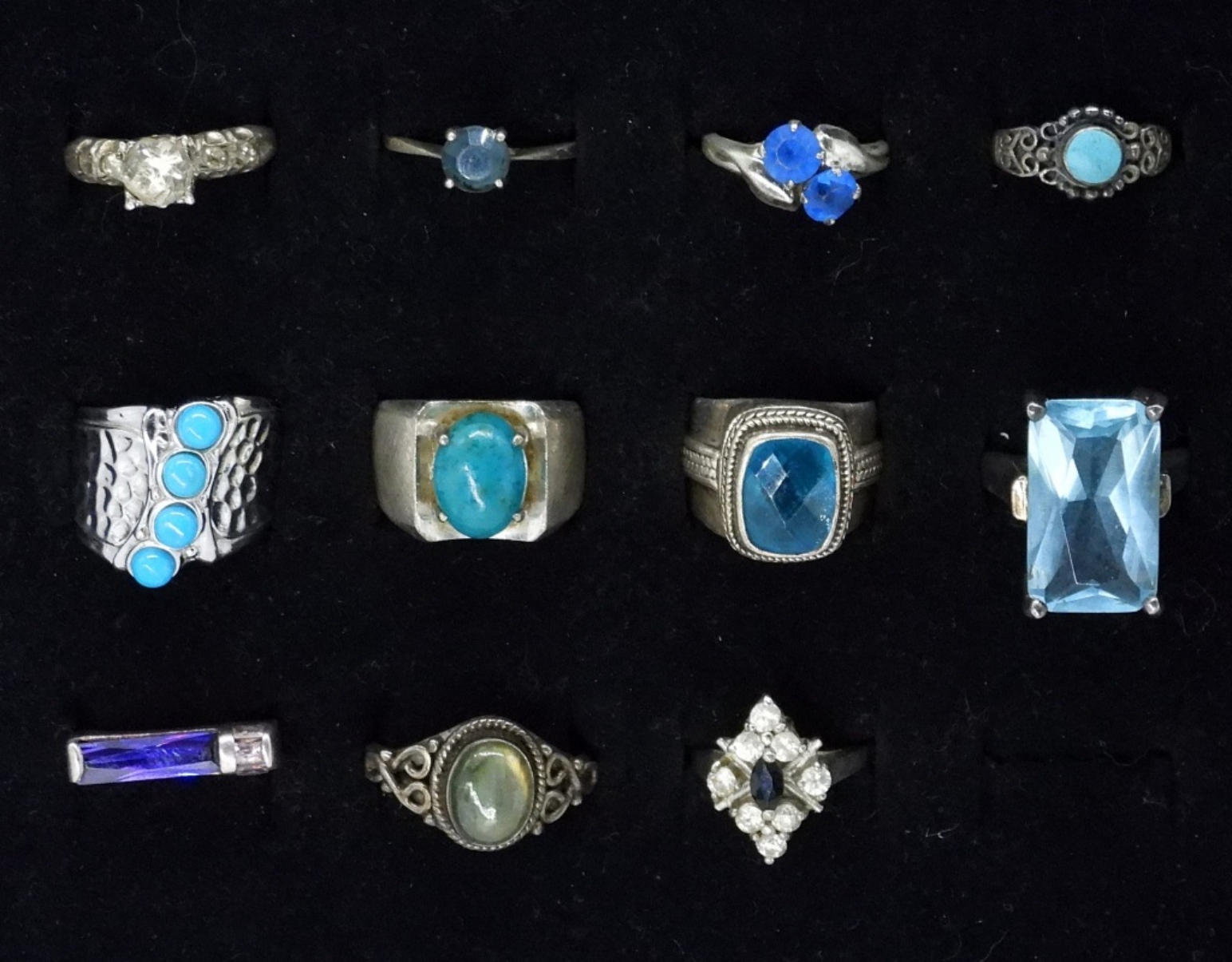 ELEVEN STERLING FASHION GEMSTONE RINGS. BLUE GEMSTONES. SIZES 5-10. 33 DWT