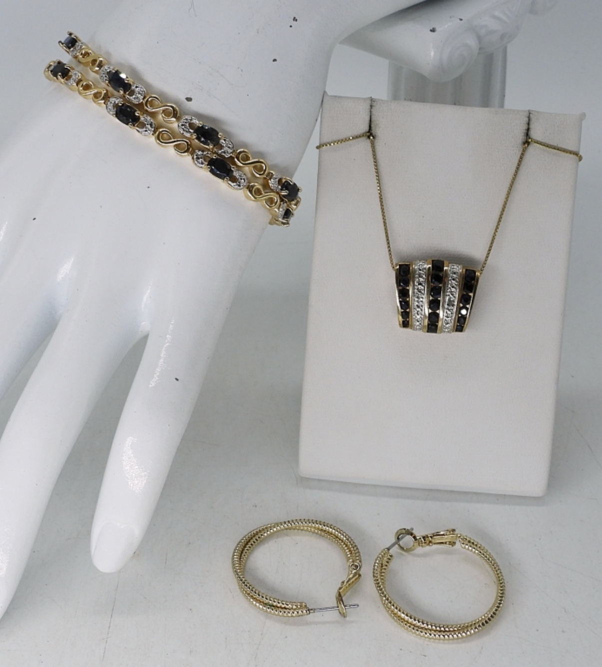 GOLD TONE STERLING SILVER GEMSTONE BRACELETS, 8″. PIERCED HOOP EARRINGS & NECKLACE 18″. 20.9 DWT