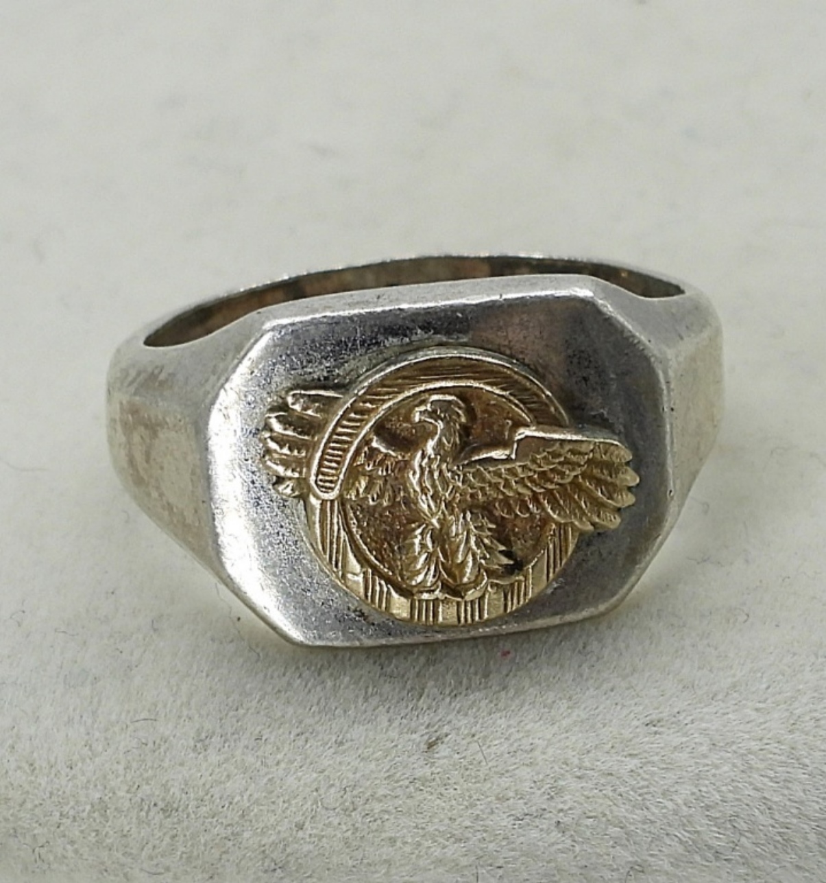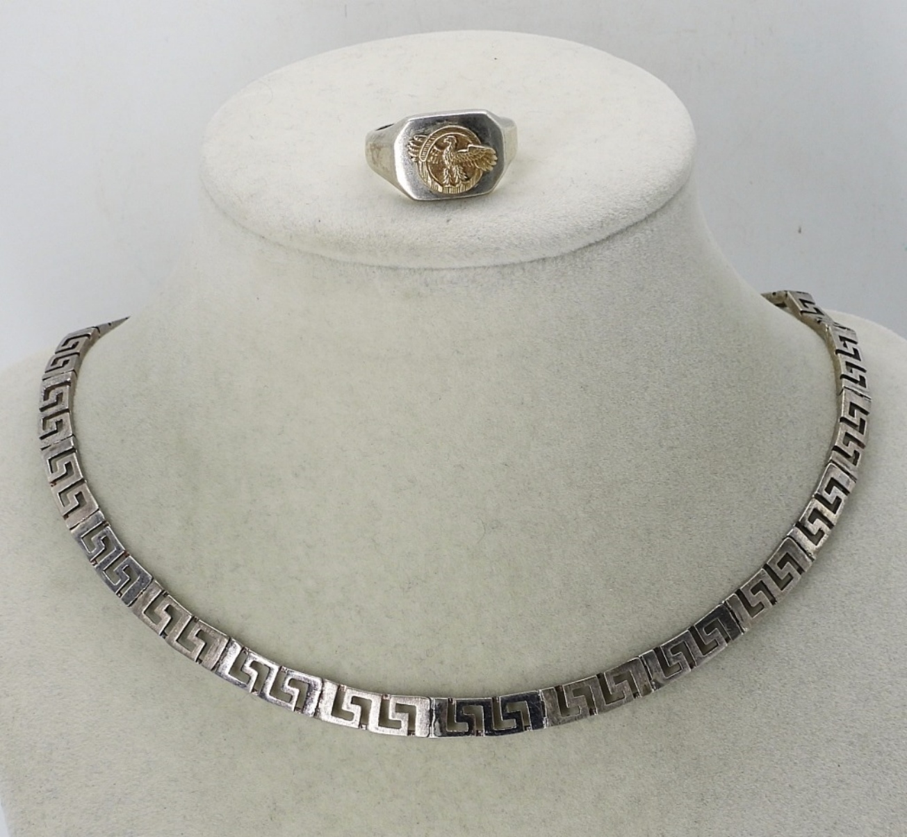 STERLING GREEK KEY NECKLACE, 16″. EAGLE RING SIZE 8. 22.6