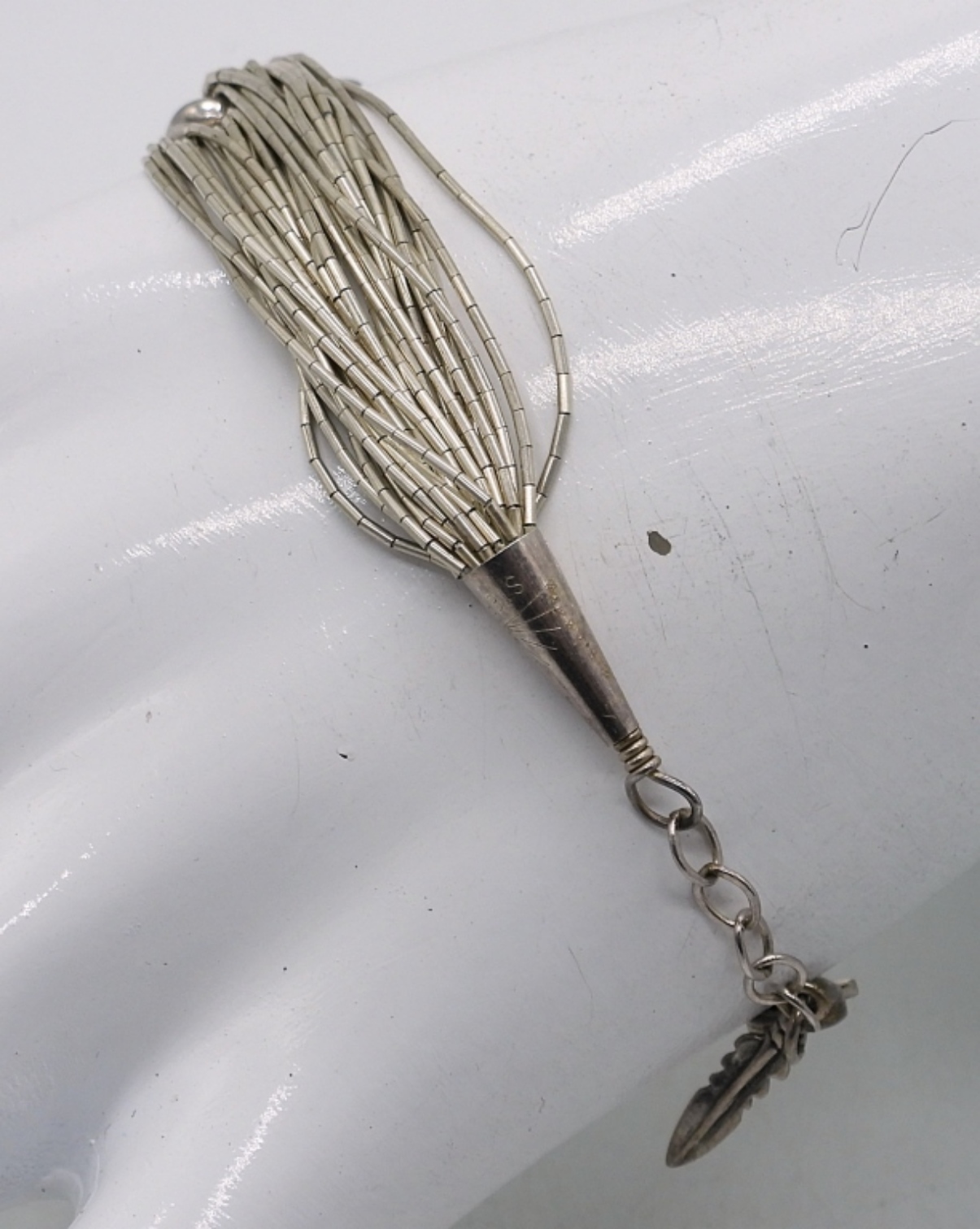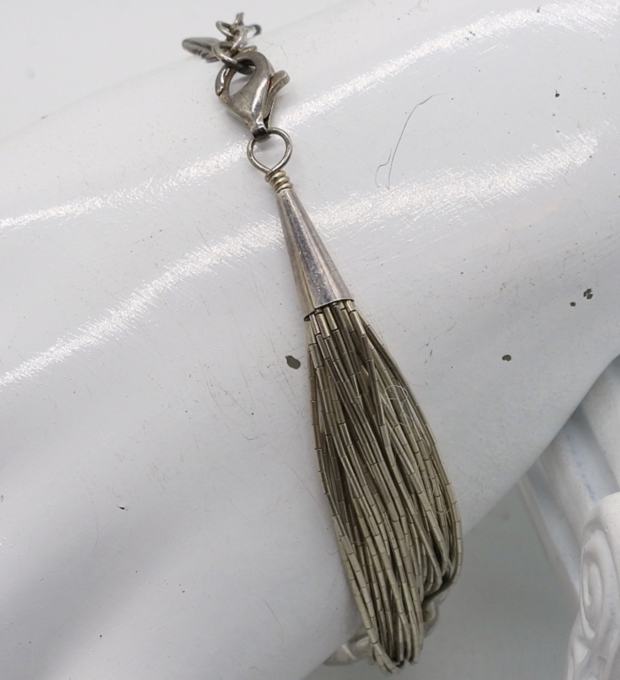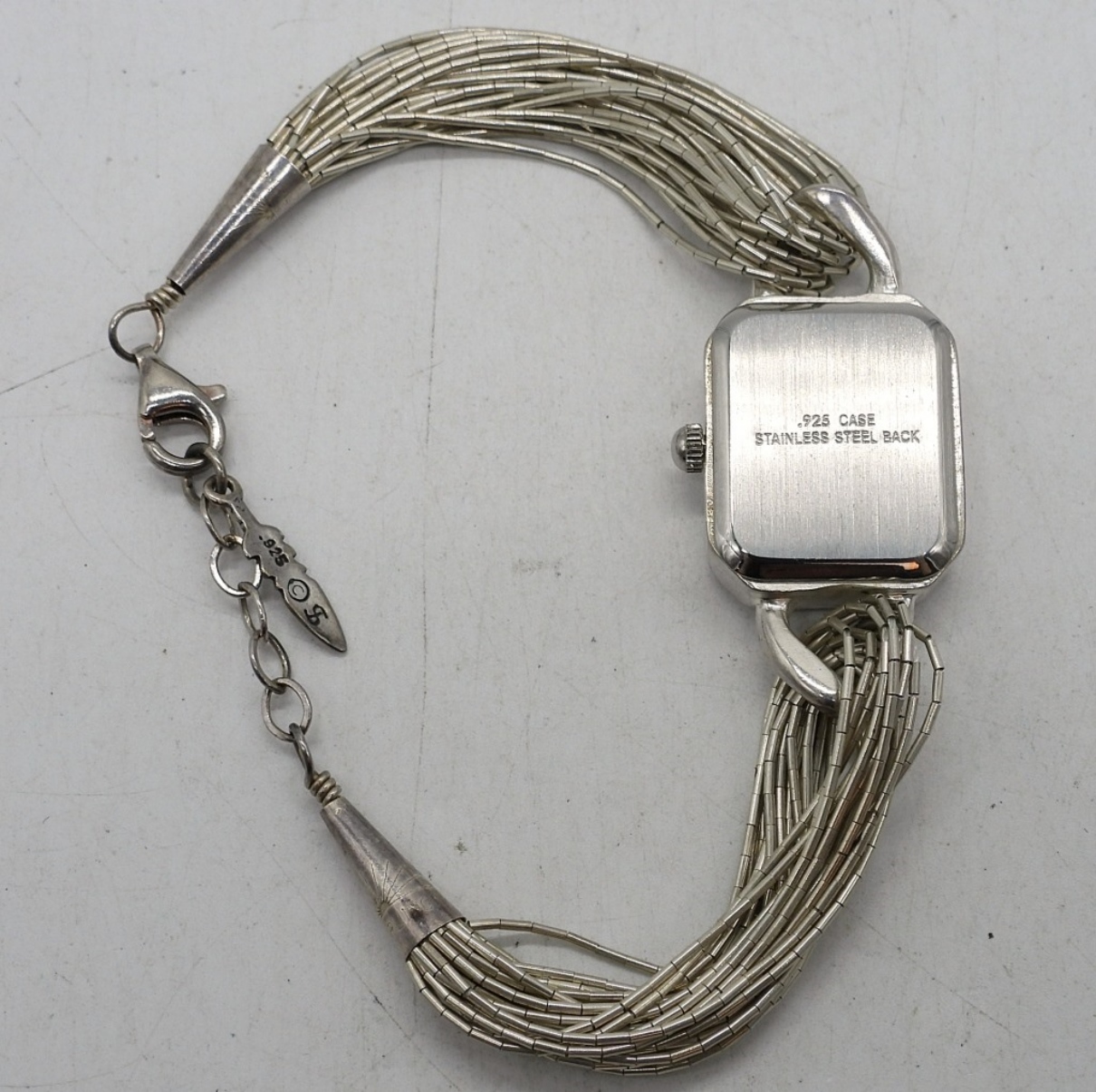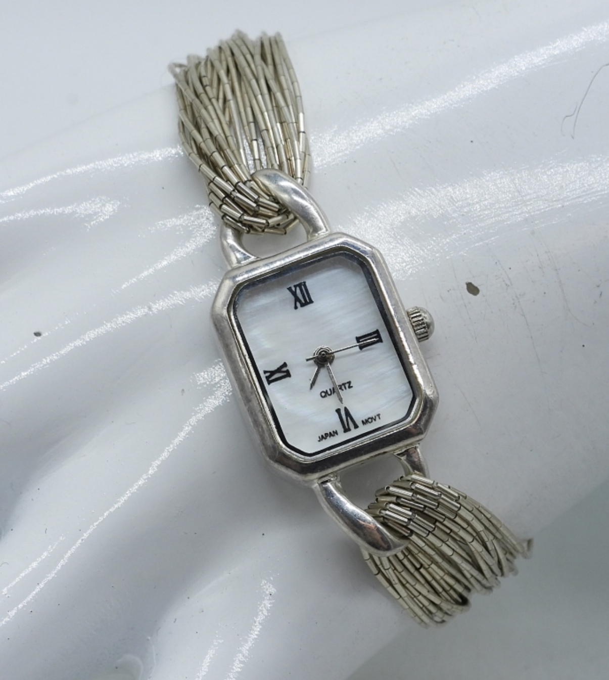 6.5-7.5″ ADJUSTABLE LIQUID STERLING BAND ON A QUARTZ WATCH WITH STERLING SILVER CASING. STAINLESS STELL BACKING. NOT TESTED AS TO WORKING, PROBABLY NEEDS A NEW BATTERY! 13 DWT