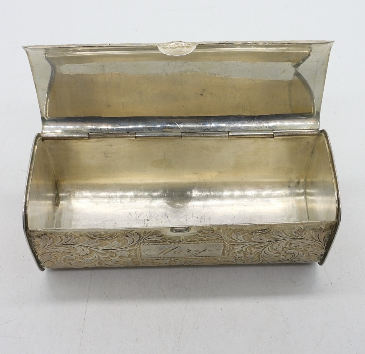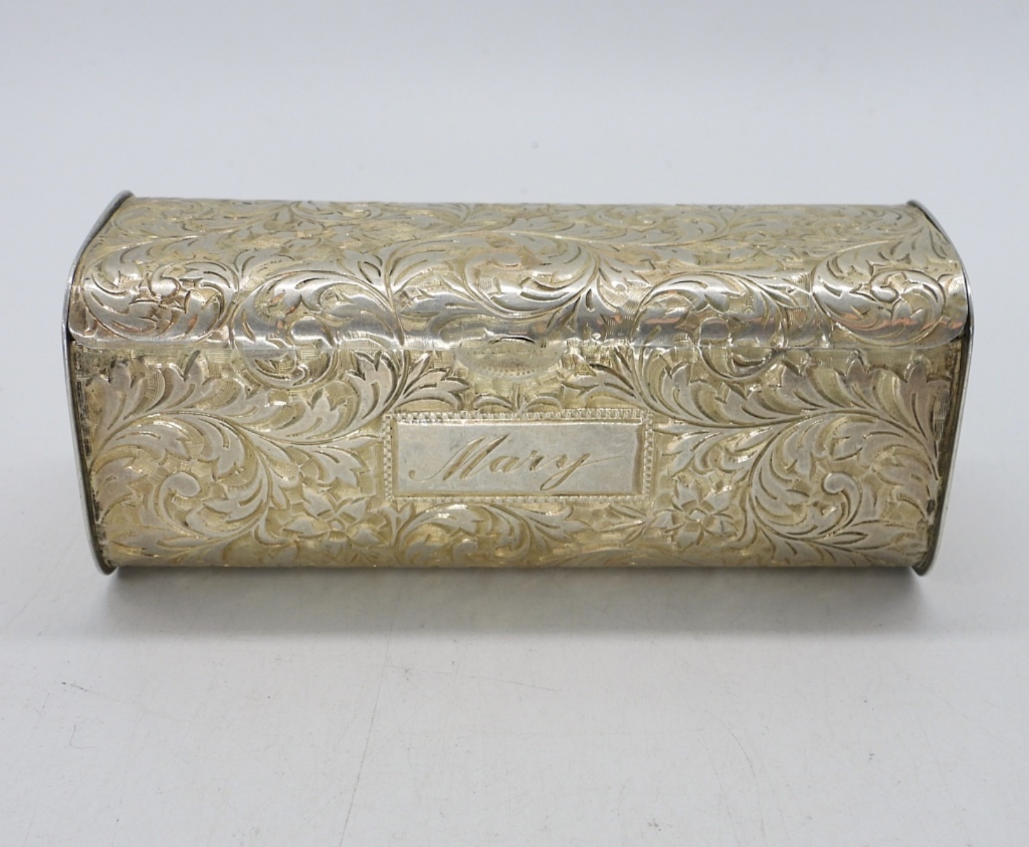 SMALL ANTIQUE ETCHED BOX, ENGRAVED “MARY”. MARKED SILVER 950. 67.5 DWT