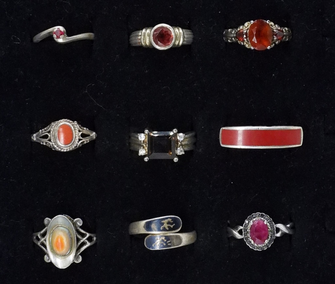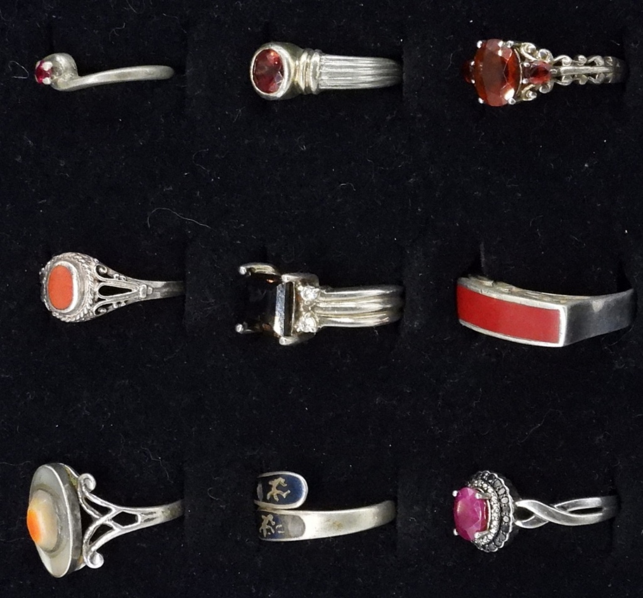 NINE STERLING GEMSTONE RINGS. SIZES 4.5-9. 18 DWT