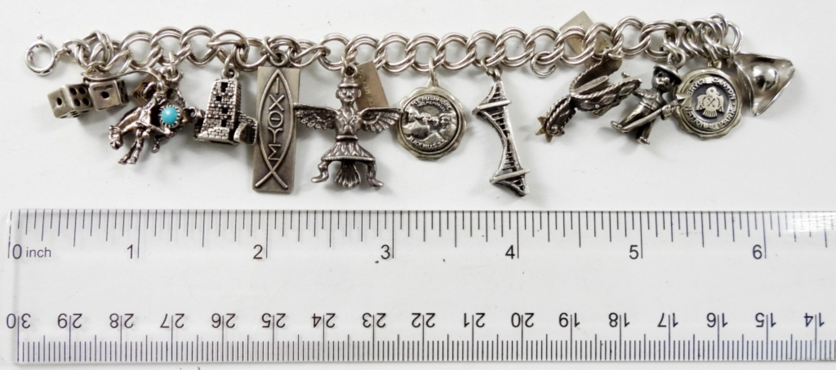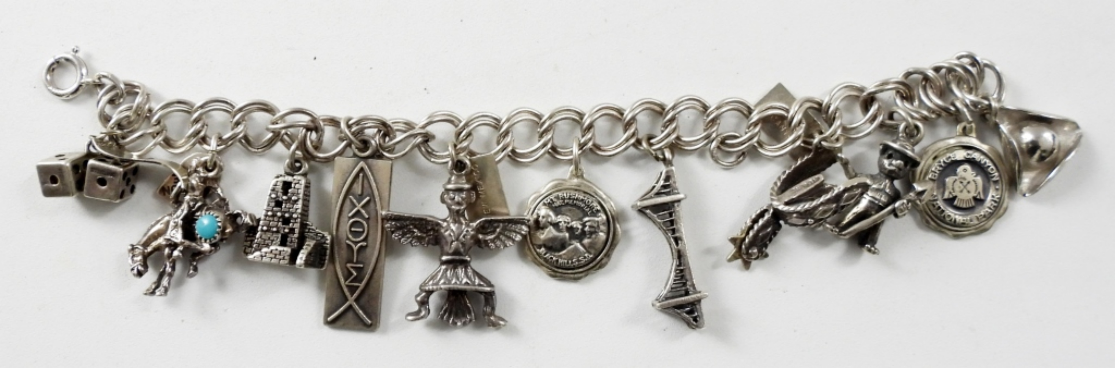 25.6 DWT, 11 CHARMS ALL MARKED STERLING, BRACELET MARKED STERLING AT CLASP 6IN LONG