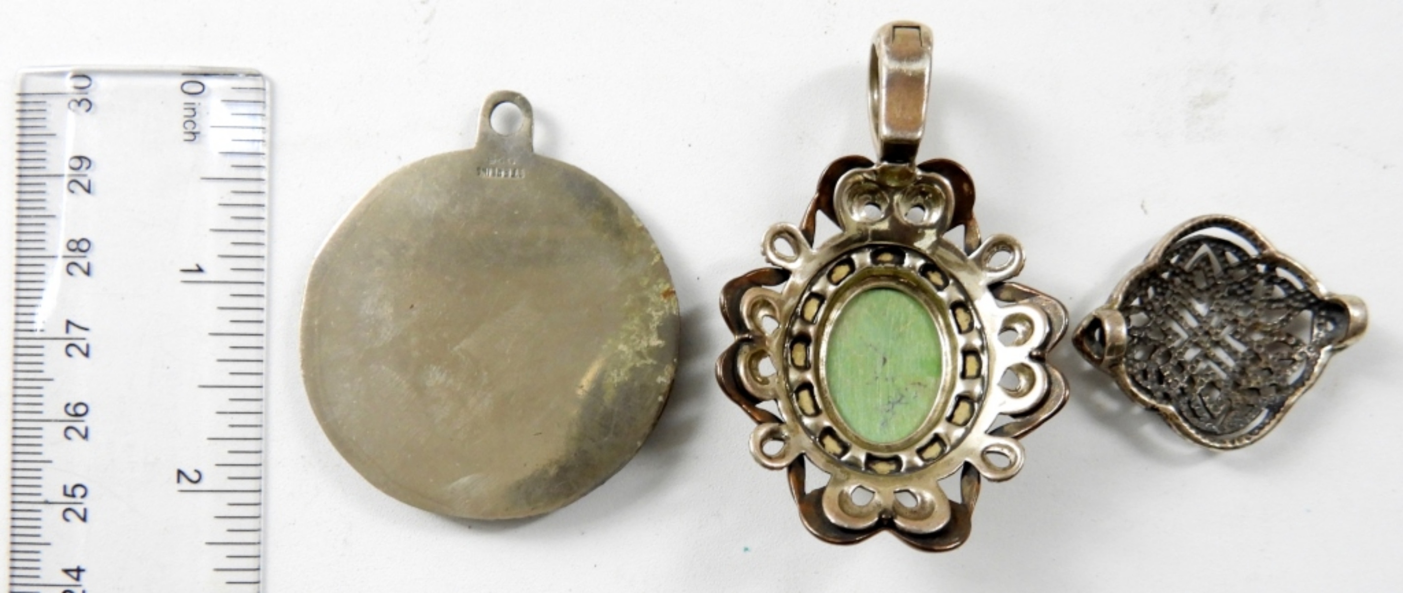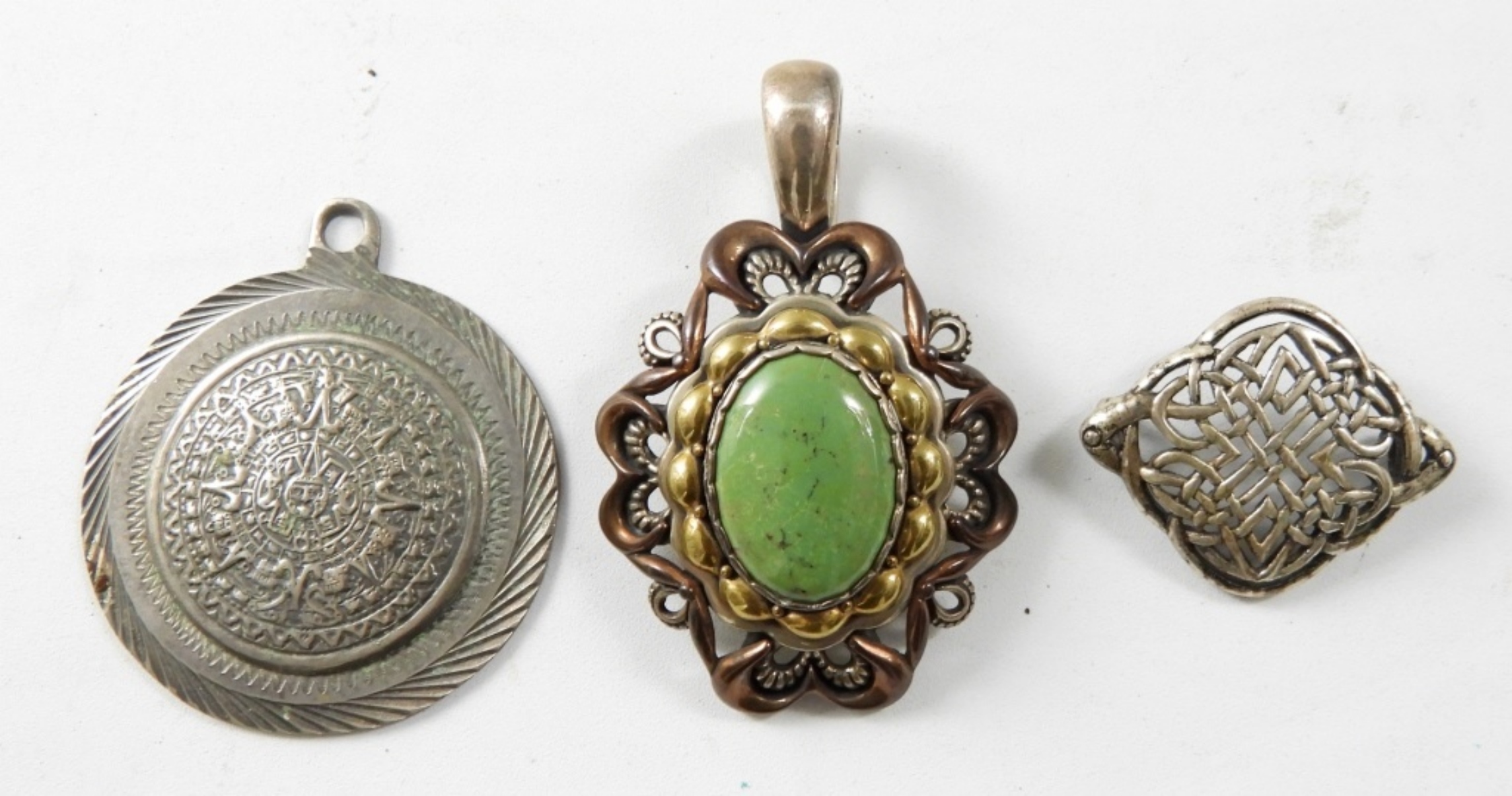 25DWT, 1 AZTEC STAMPED STERLING, 1- STERLING WITH CRASS AND COPPER AND GREEN STONE IN MIDDLE AND STAMPED, ALL 3 ARE 2IN OR UNDER