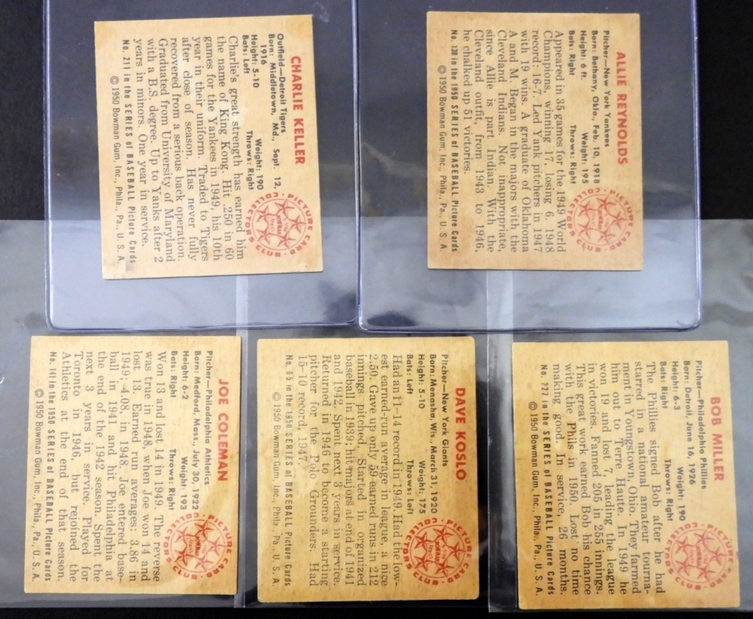FIVE 1950 BOWMAN BASEBALL CARDS. CHARLIE KELLER, DAVE KOSLO, JOE COLEMAN, ALLIE REYNOLDS, BOB MILLER.