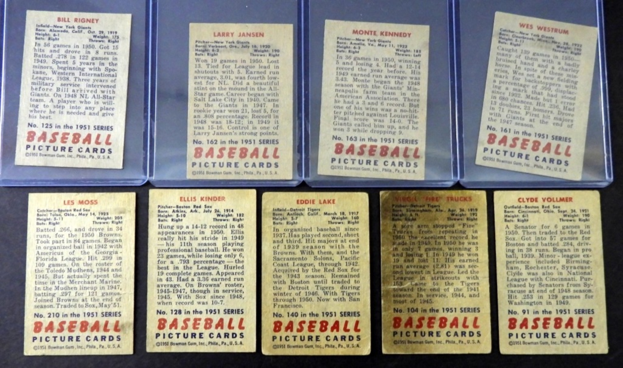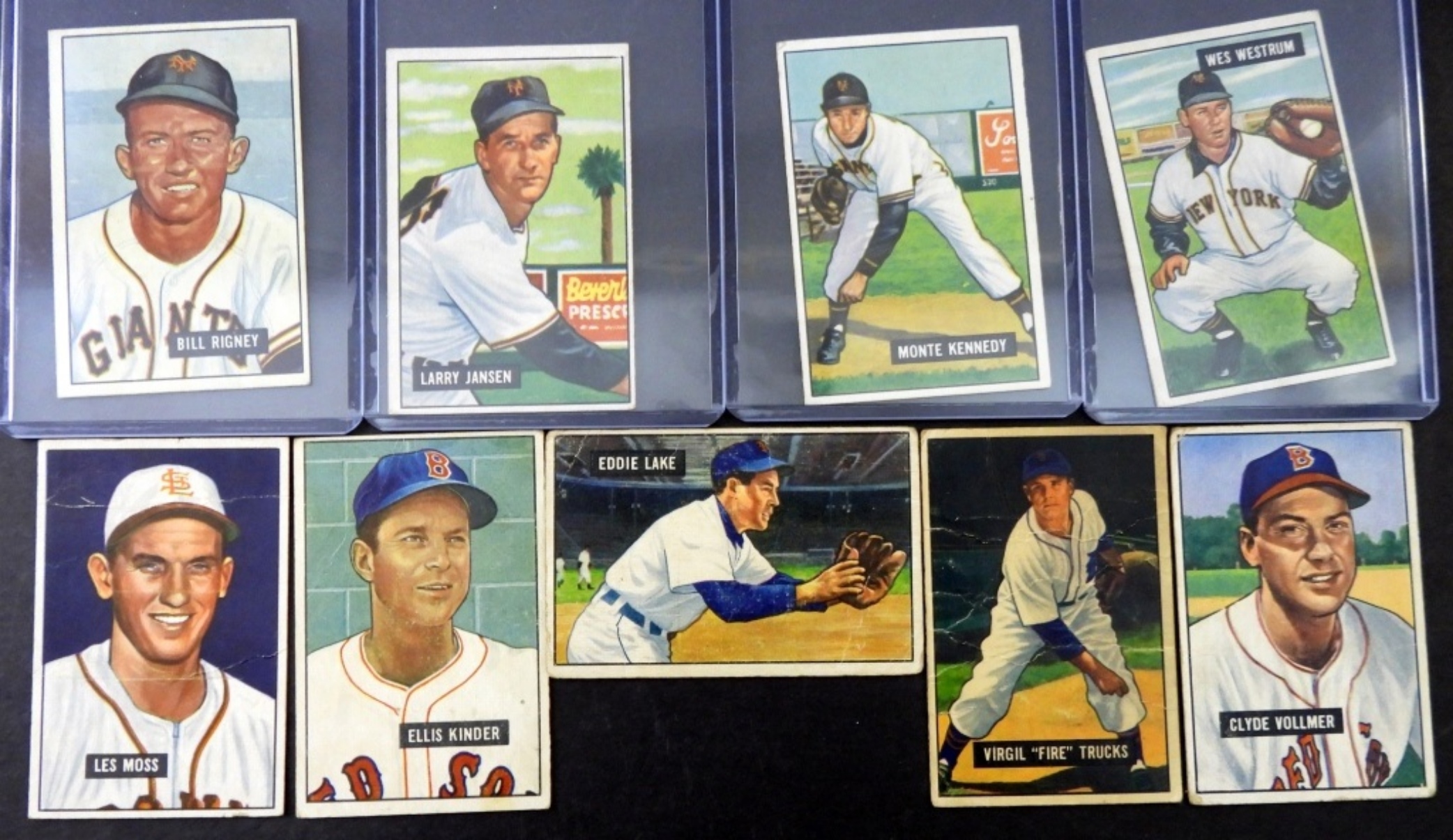 9 BOWMAN BASEBALL CARDS. ALL 1951, VG. MOSS, VOLLMER, KINDER, TRUCKS, LAKE, RIGNEY, JANSEN, KENNEDY, WESTRUM.