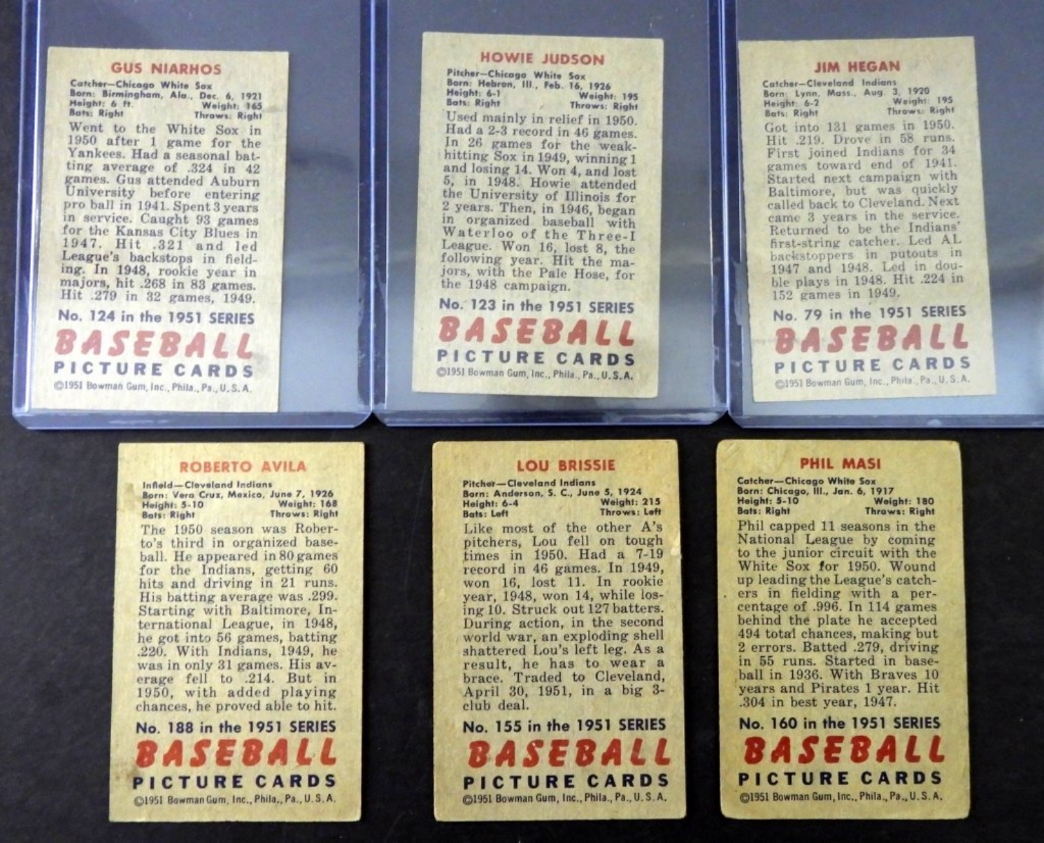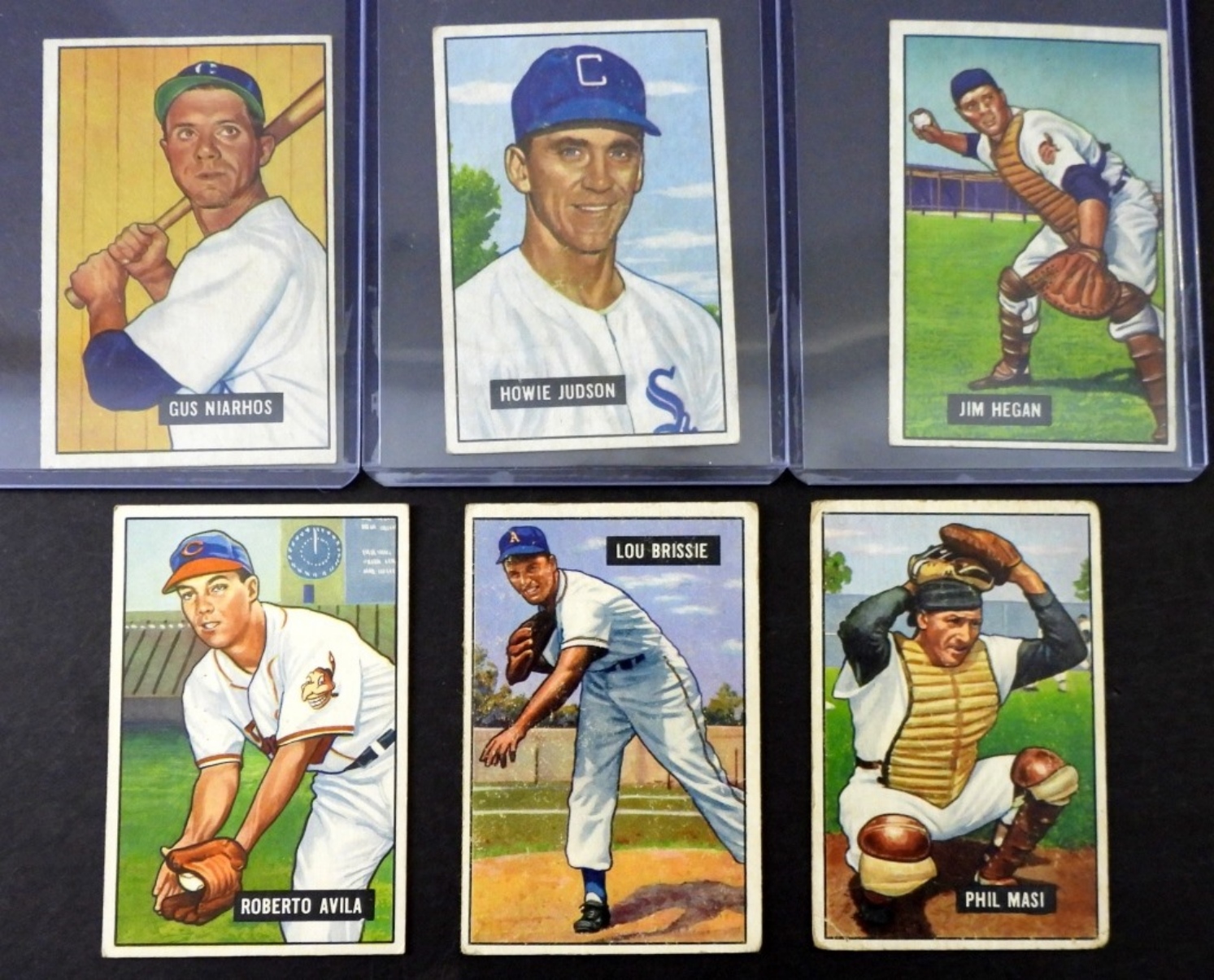 SIX 1951 BOWMAN BASEBALL CARDS. VG. ROBERTO AVILA, JIM HEGAN, HOWIE JUDSON, GUS NIARHOS, PHIL MASI, LOU BRISSIE.