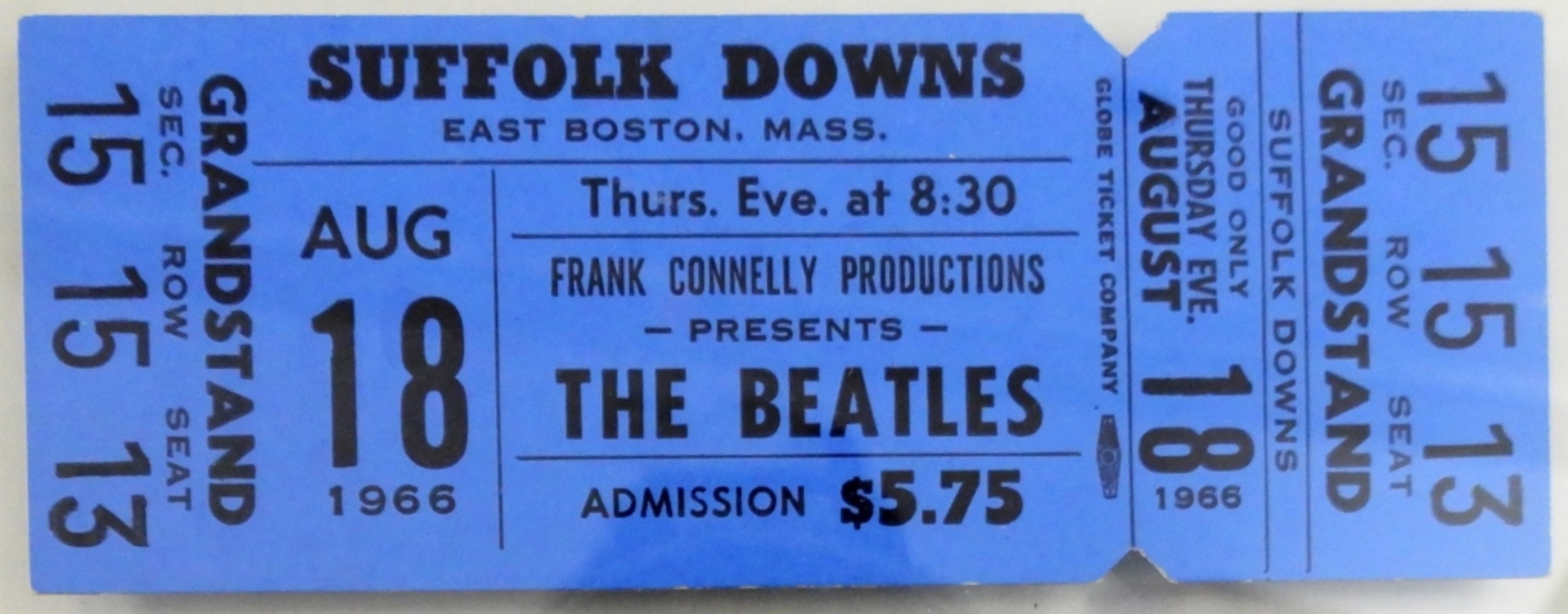 UNUSED, THE BEATLES AT SUFFOLK DOWN AUGUST 18 1966. WITH LETTER FROM GERALD ROBERTS. TICKET IS SIGNED BY UNKNOWN PERSON.