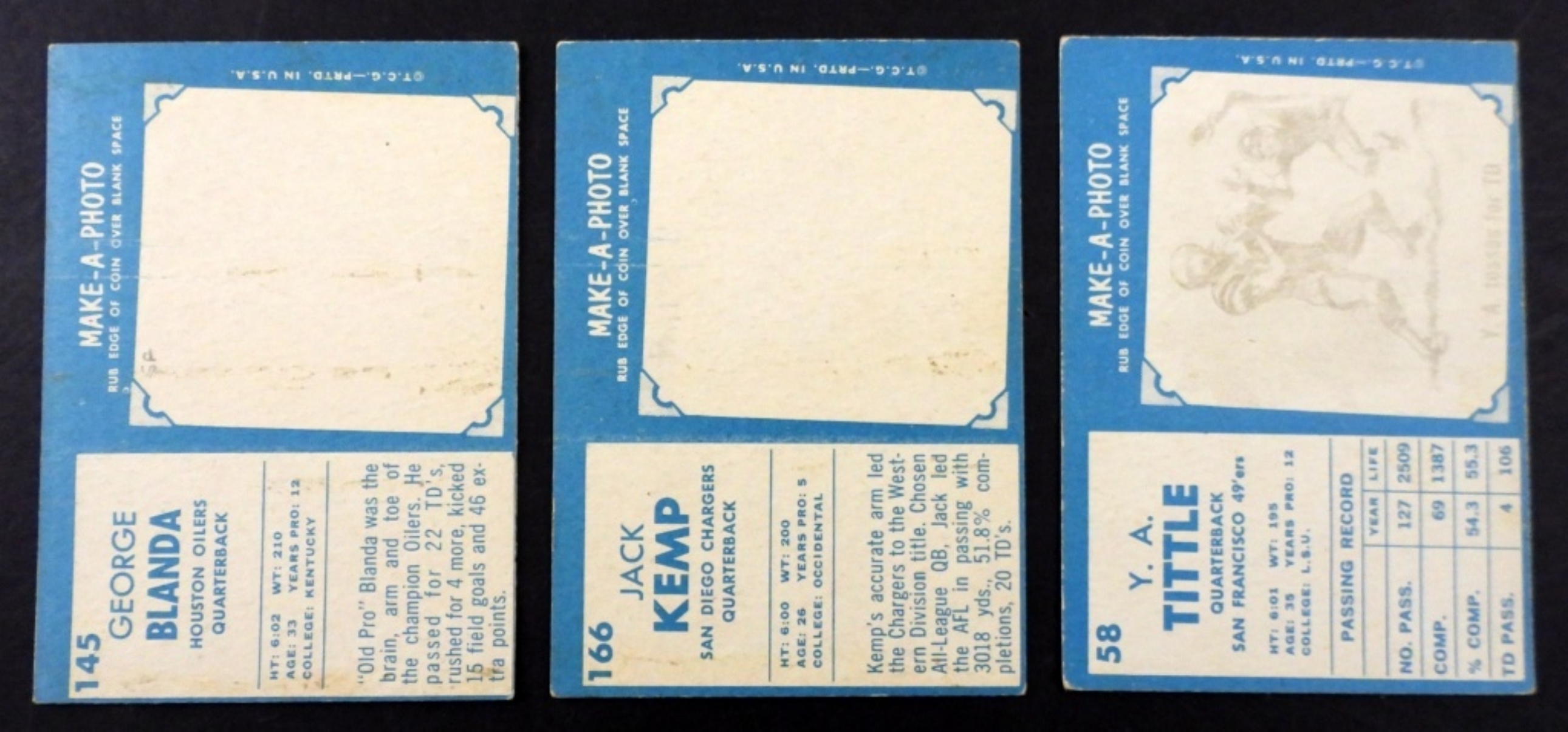 EX NICE COLOR #166 JACK KEMP 10/90, #58 Y.A TITTLE 10/90, #145 GEORGE BLANDA 10/90