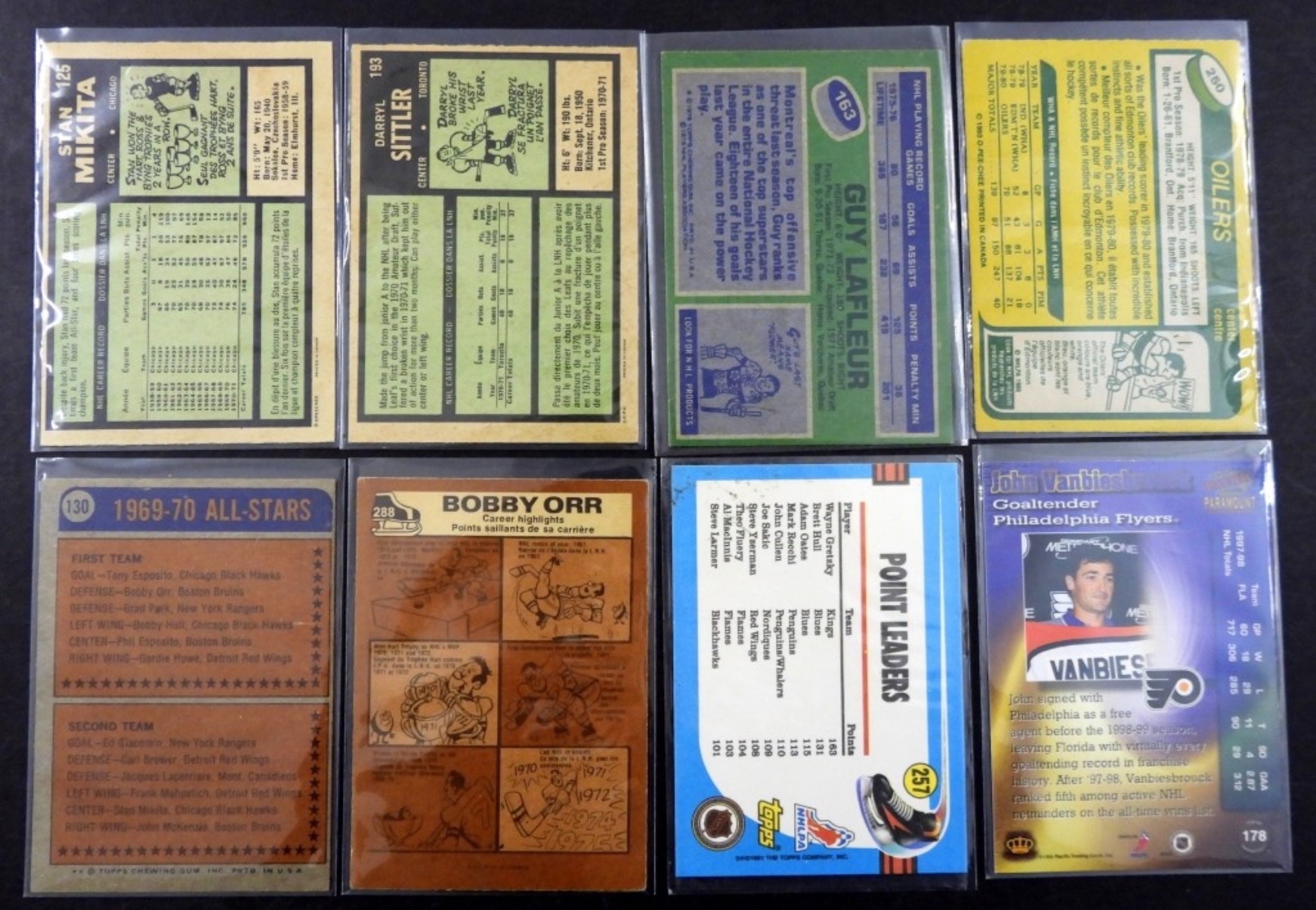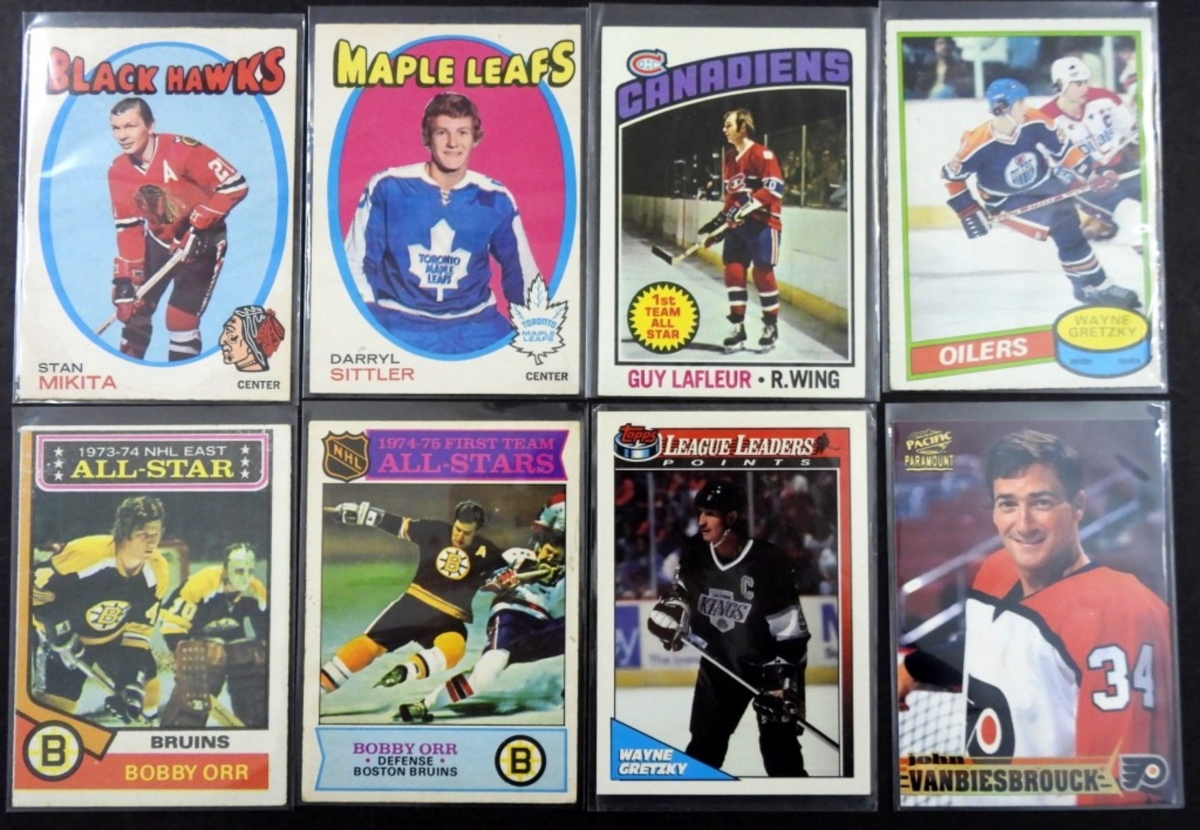 GUY LAJLEUR ROOKIE 1976/77 TOPPS, DARRYL SITTLER 1971/72 OPC ROOKIE, 71/72 TOPPS STAN MIKITA, 1980/81 OPC GRETZY #250, (2) BOBBY ORR & MORE – NICE LOT