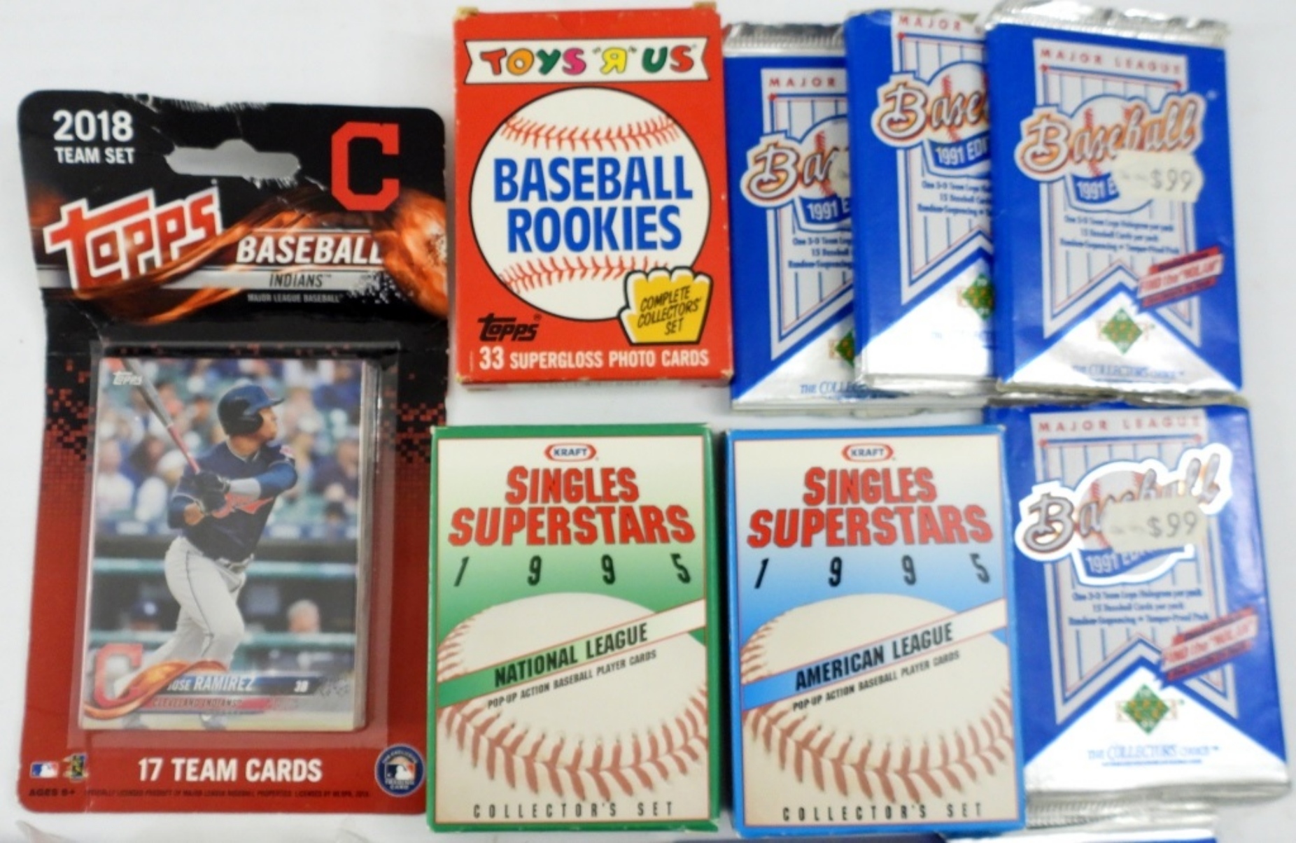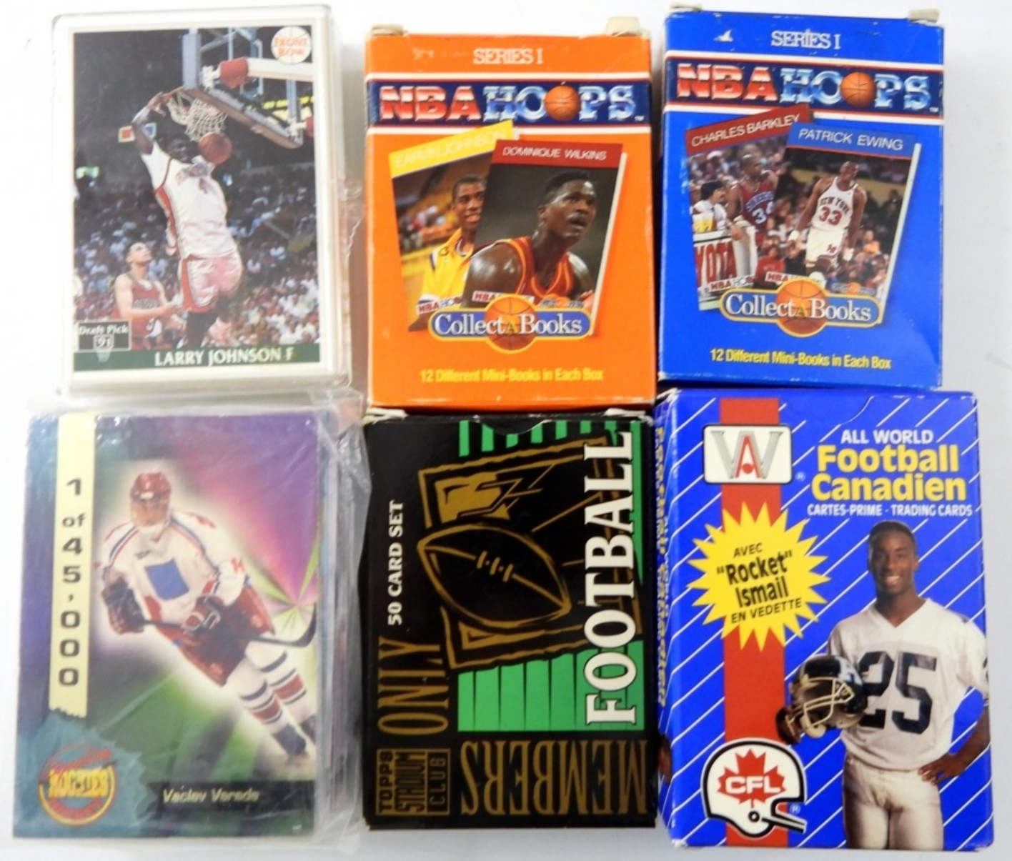SPORTS GRAB BAG OF TRADING CARDS. 9 PACKS OF BASEBALL CARDS – SOME OPENED, UNVERIFIED. 1 BAG OF HOCKEY CARDS, UNVERIFIED. 3 PACKS OF BASKETBALL CARDS, EARLY 1990’s. UNSEARCHED/UNVERIFIED. 2 PACKS OF FOOTBALL