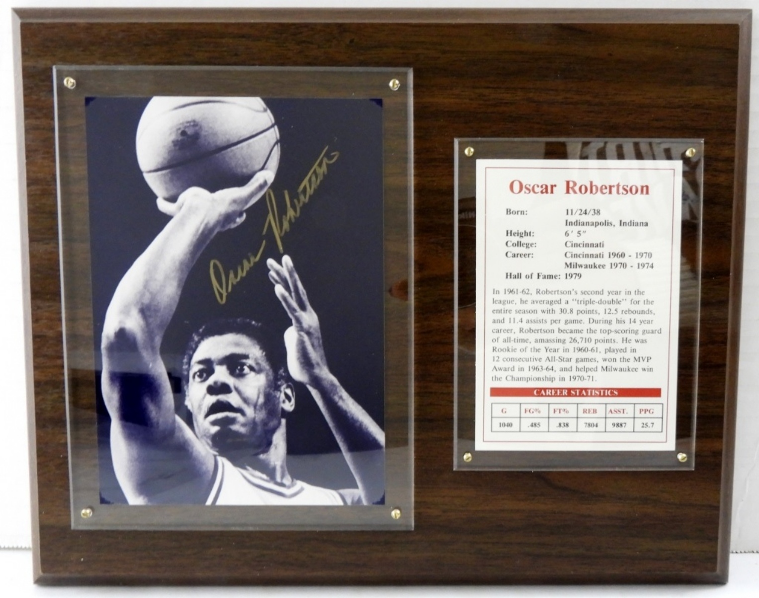 OSCAR ROBERTSON AUTOGRAPHED VINTAGE 1995 SPORTS PLAQUE, 10×13″. IN ORIGINAL BOX! NO COA