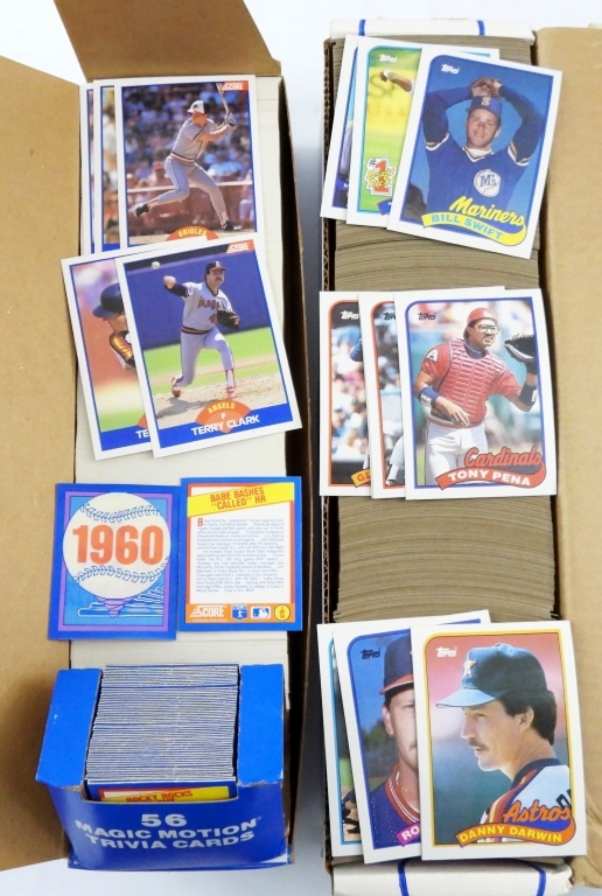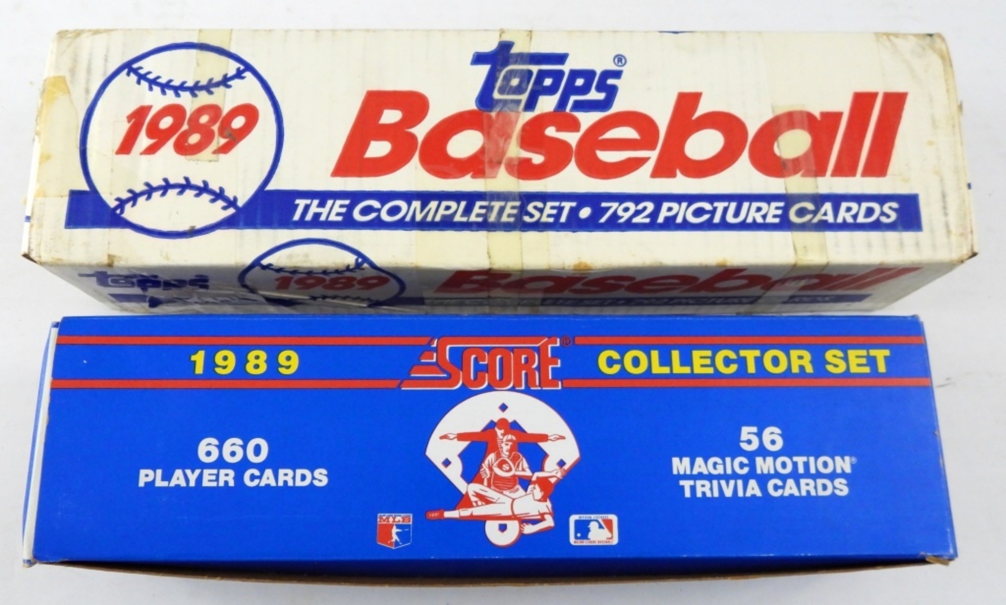 TWO 1989 COLLECTORS BASEBALL CARD SETS. TOPPS UNSEALED, CARDS UNVERIFIED! SCORE 1989 SET, 660 CARDS (UNVERIFIED) WITH 56 MAGIC MOTION TRIVIA CARDS (UNVERIFIED).