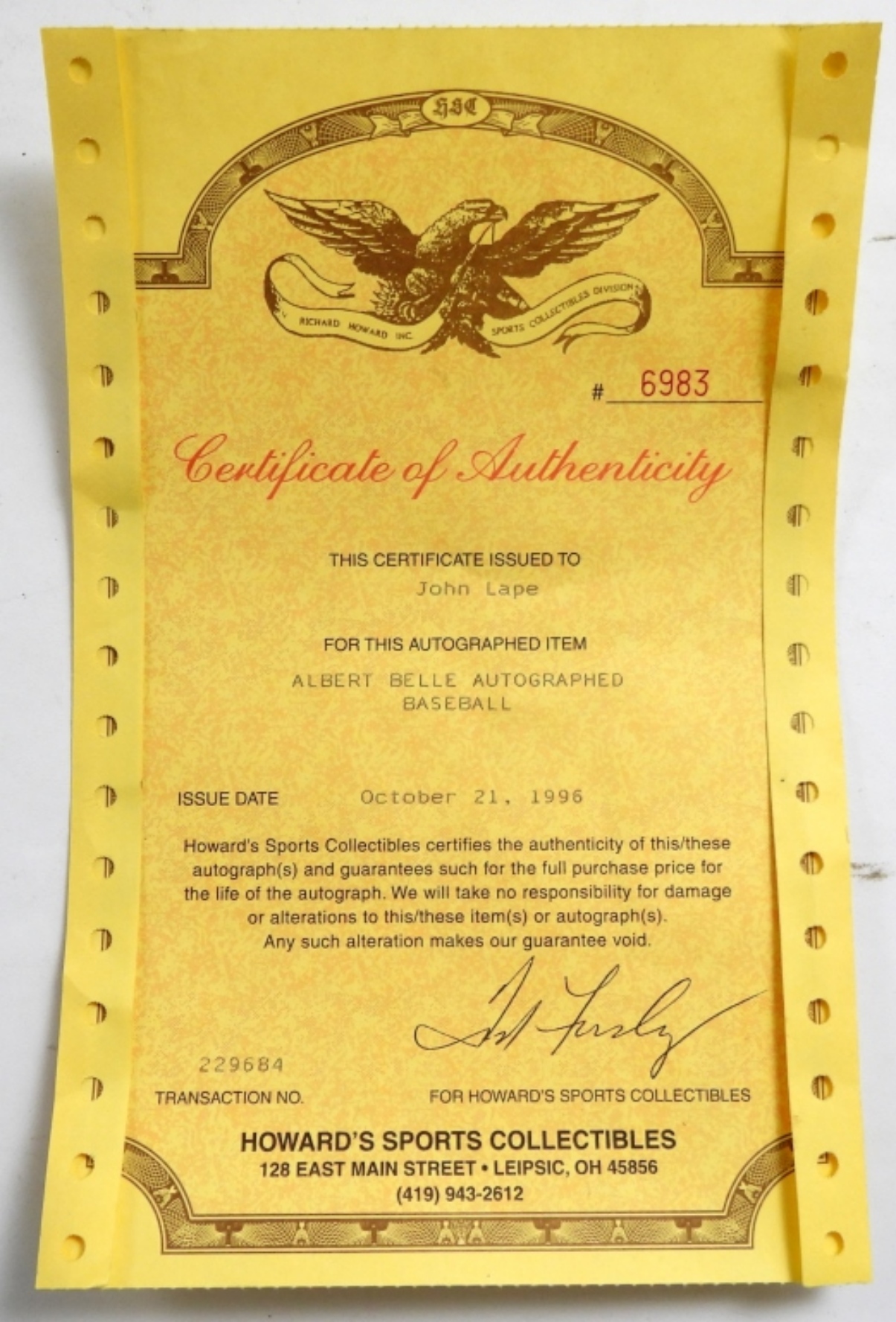 UNVERIFIED COA FROM HOWARDS SPORTS COLLECTIBLES, SIGNED ON OFFICIAL AMERICAN LEAGUE BASEBALL