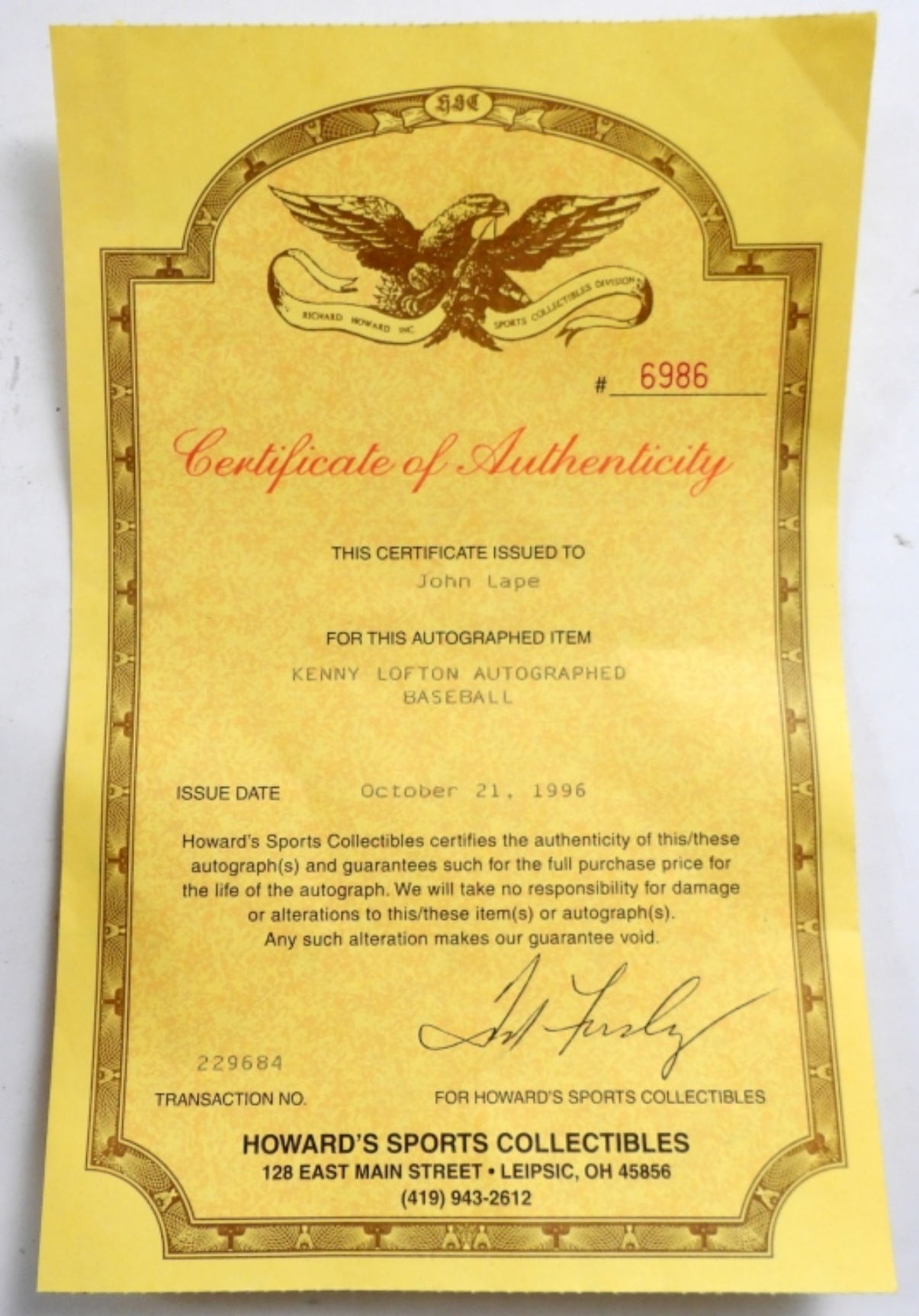 UNVERIFIED COA FROM HOWARDS SPORTS COLLECTIBLES, SIGNED ON OFFICIAL AMERICAN LEAGUE BASEBALL