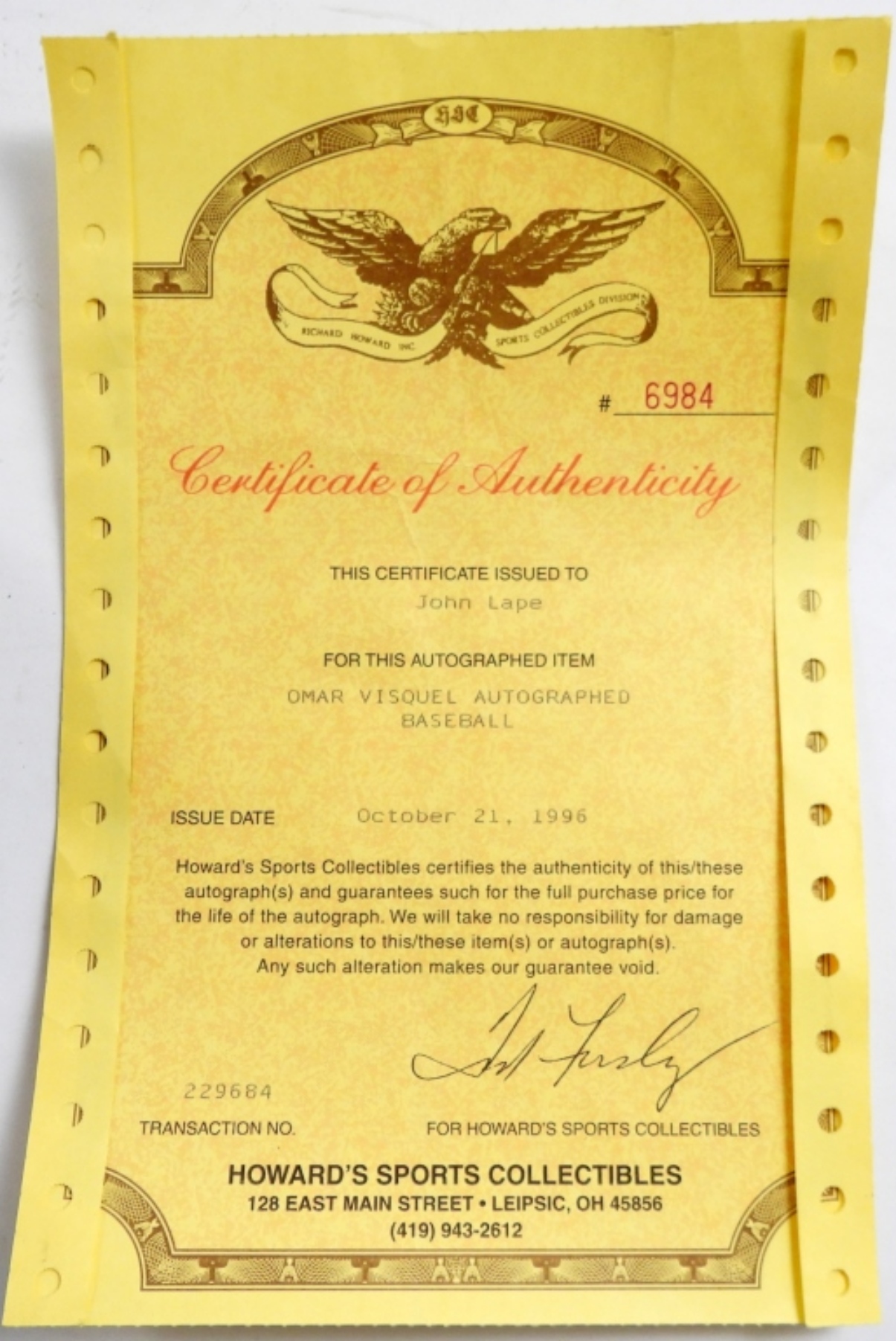 UNVERIFIED COA FROM HOWARDS SPORTS COLLECTIBLES, SIGNED ON OFFICIAL AMERICAN LEAGUE BASEBALL