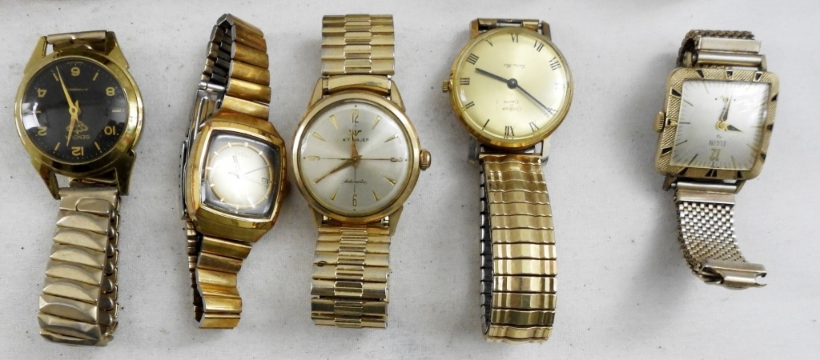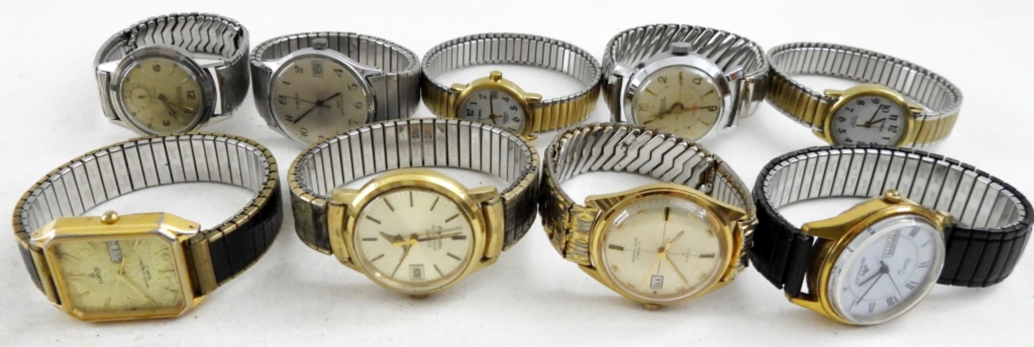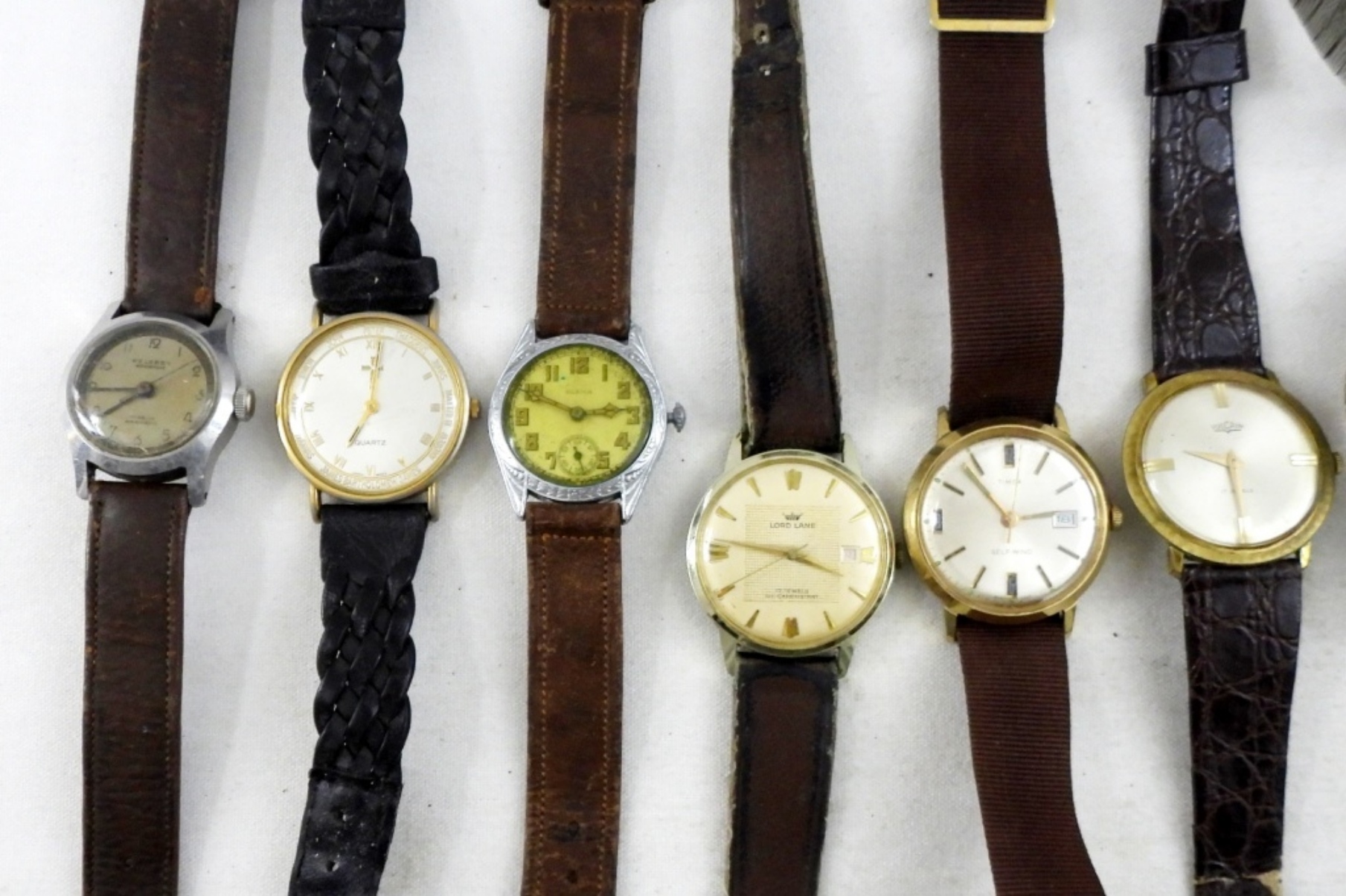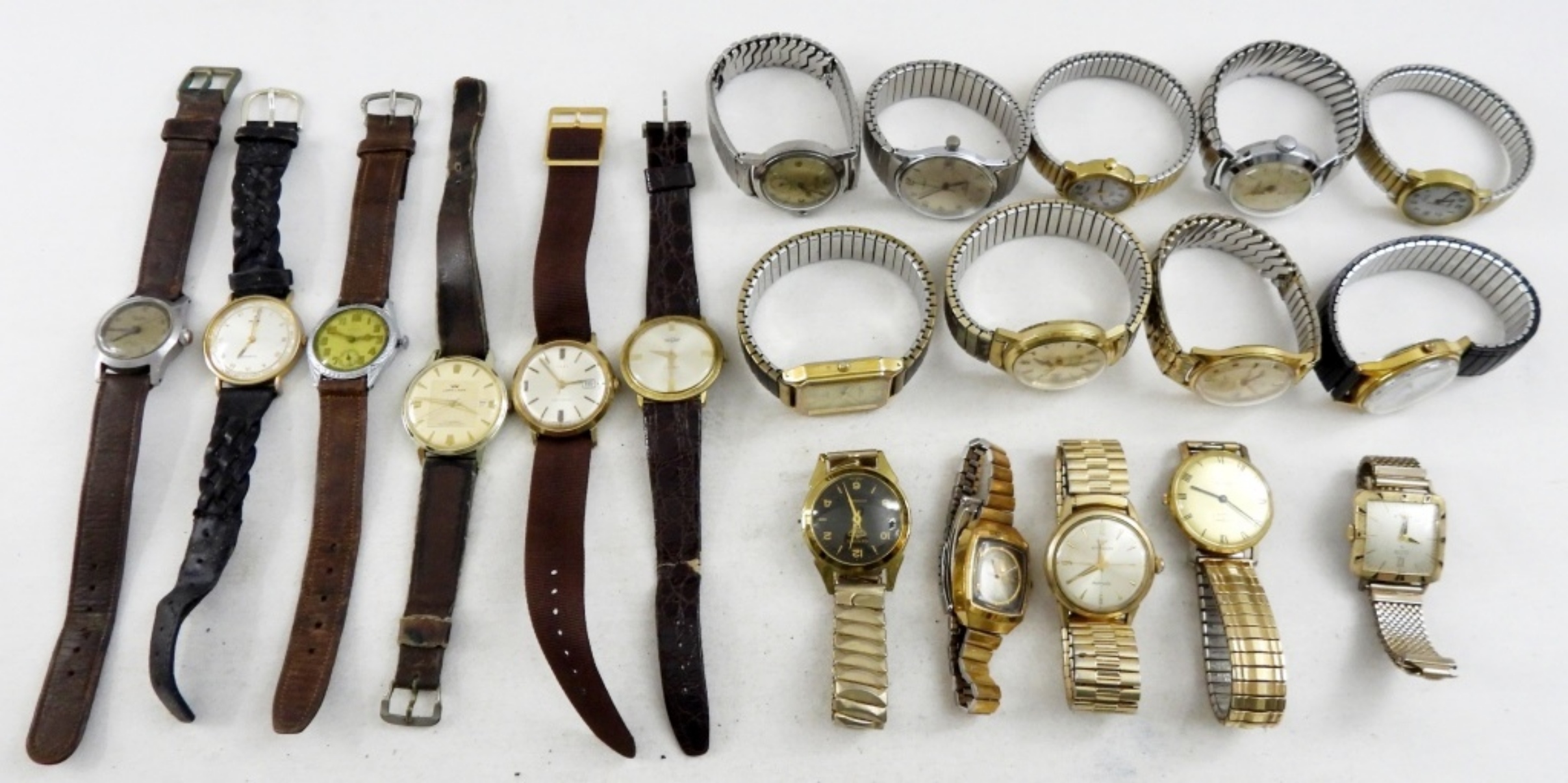 20 MEN’S VINTAGE WRIST WATCHES. GOLD & SILVER TONE, LEATHER BANDS. LORD LANE, OMEGA, WITTNAUER, ELGIN, TIMEX, GRUEN, LORUS & MORE -NOT TESTED AS TO WORKING OR NOT-