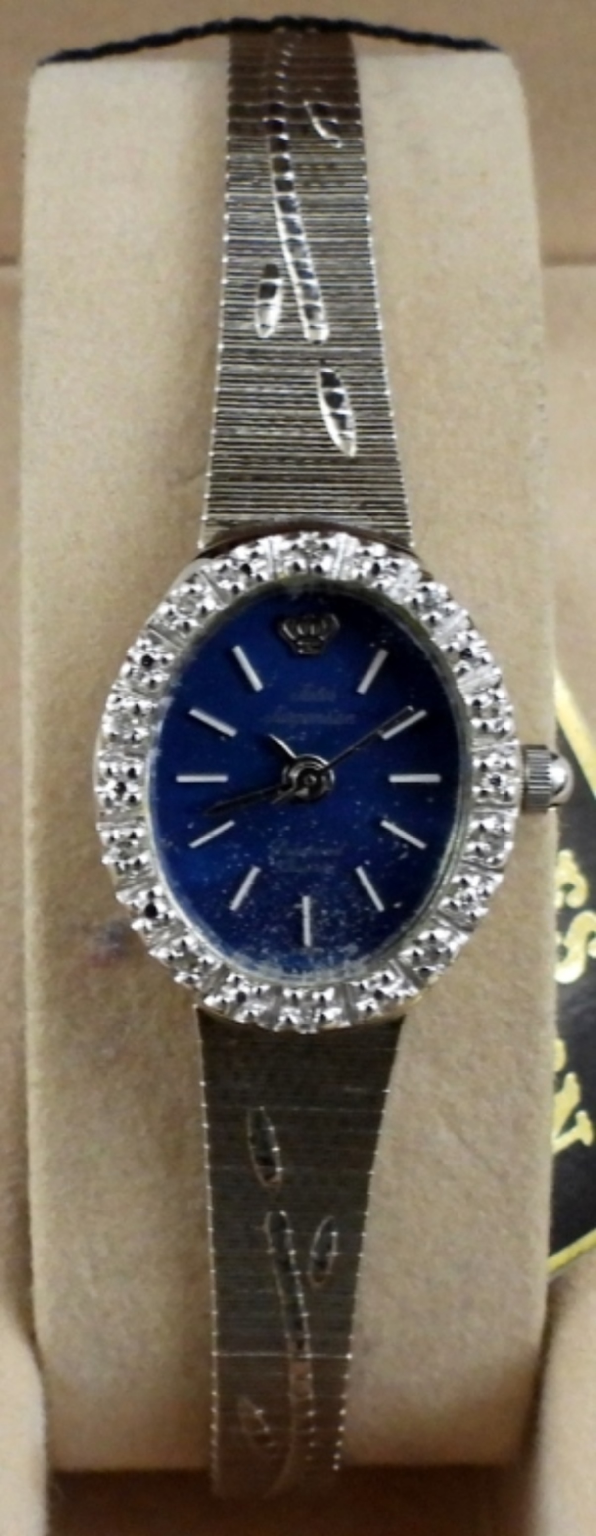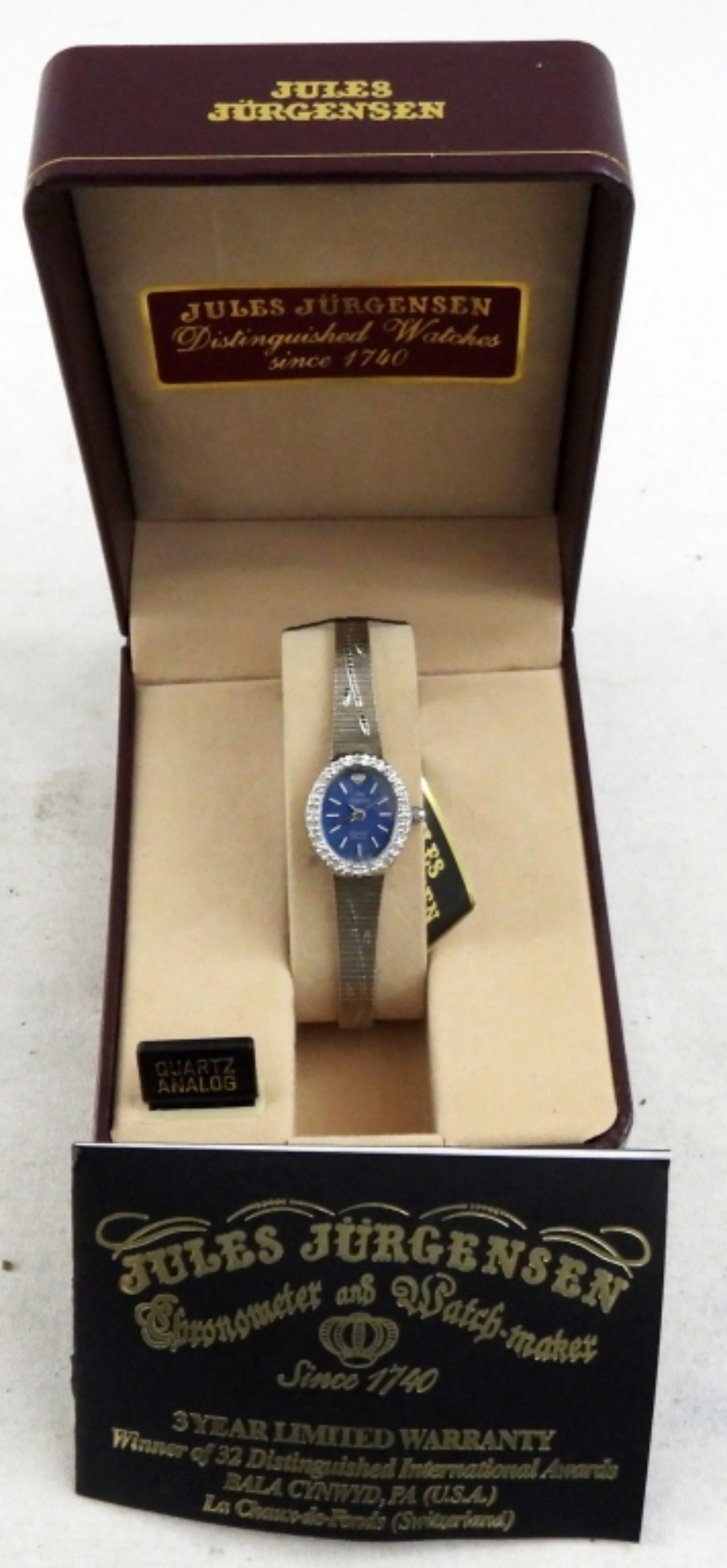 JULES JURGENSEN, SILVER TONE BRACELET WATCH, BLUE FACE. ORIGINAL RETAIL PRICE $180.00, COMES IN ORIGINAL BOX & ORIGINAL PAPERWORK. -NOT TESTED AS TO WORKING OR NOT-