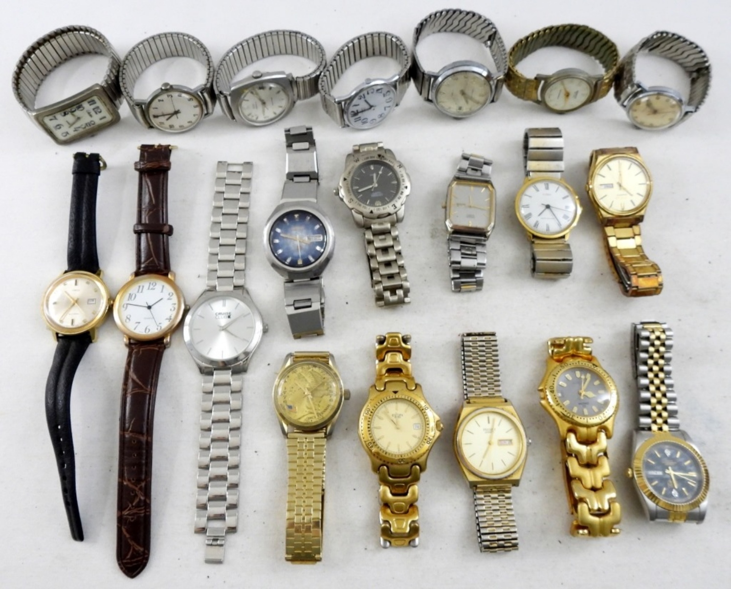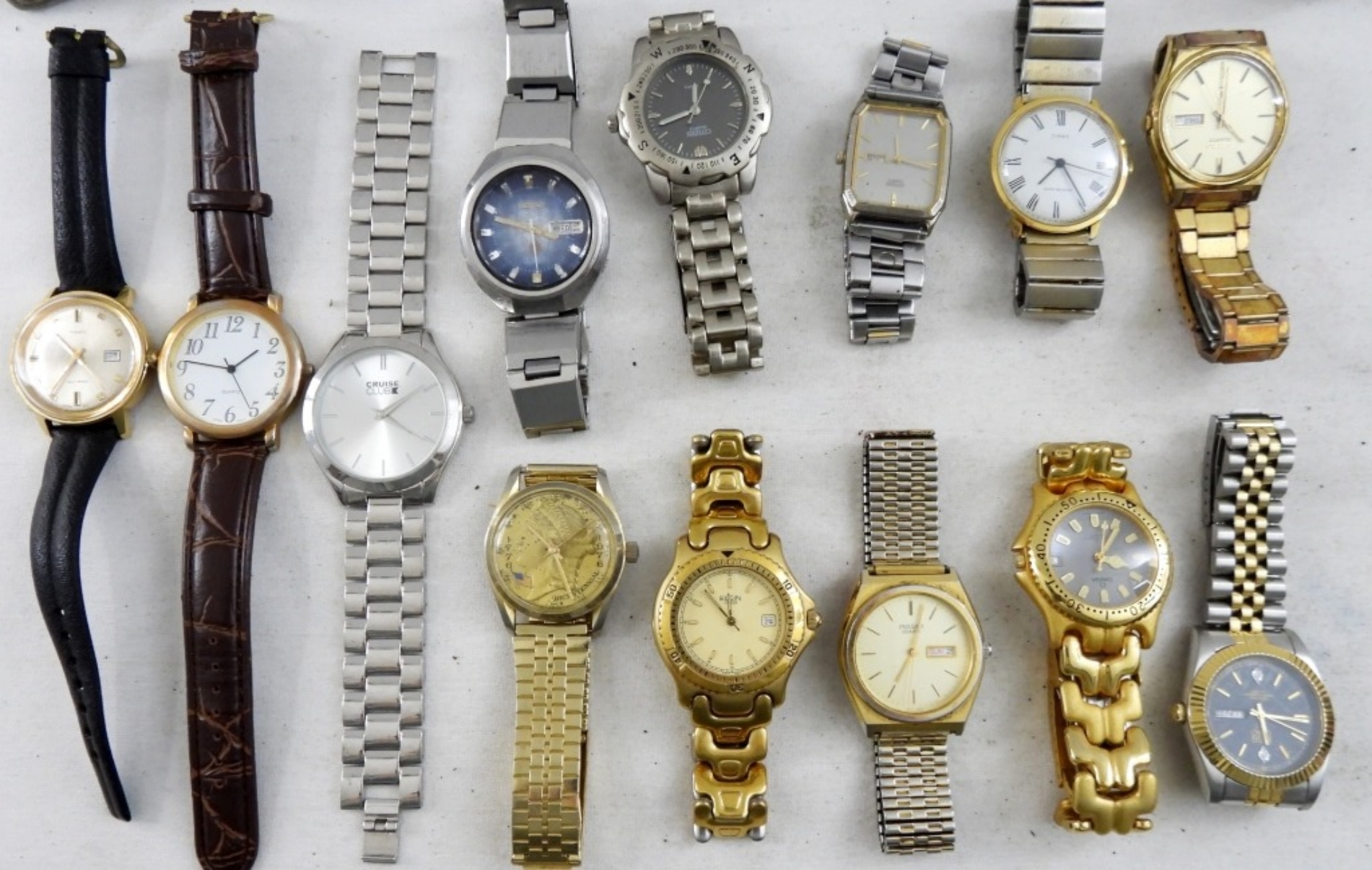 20 MEN’S SILVER & GOLD TONE WRIST WATCHES. PULSAR, TIMEX, ELGIN, SEIKO, CITIZEN, OMEGA & MORE -NOT TESTED AS TO WORKING OR NOT-
