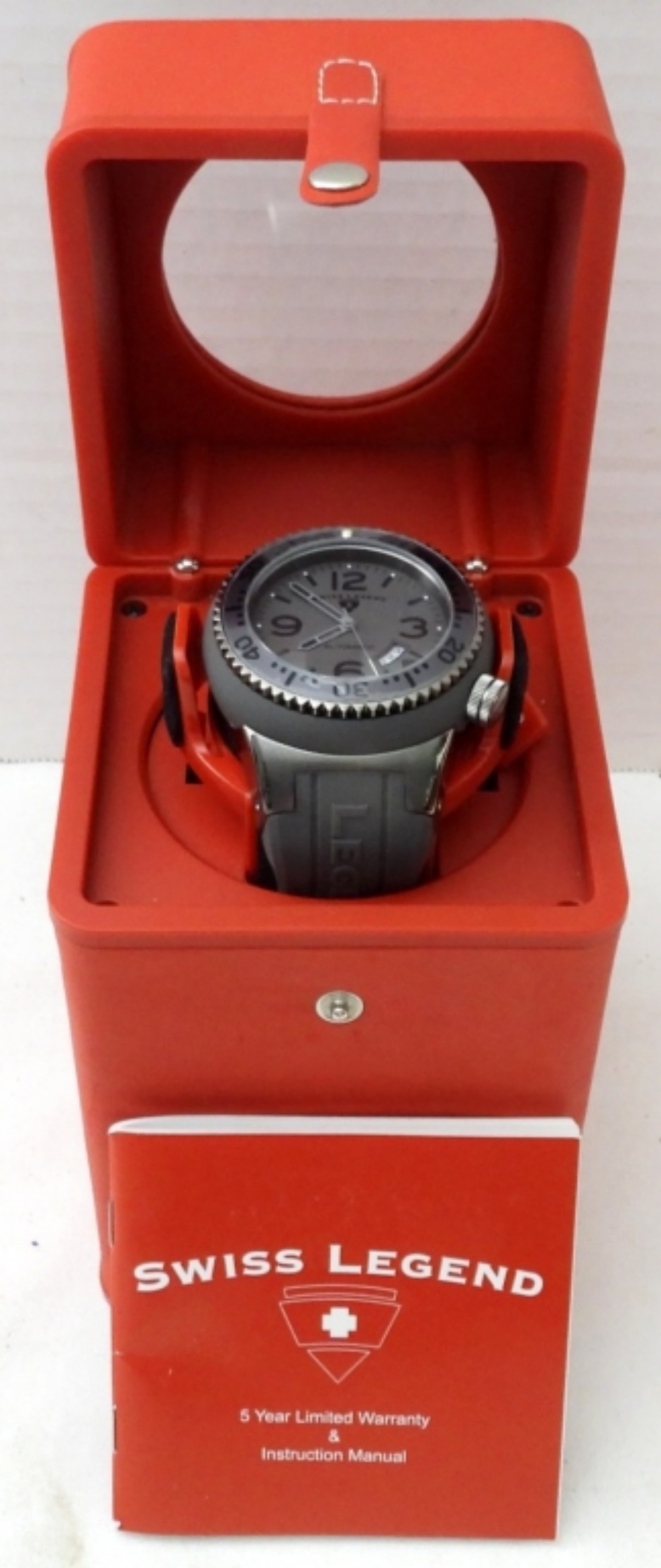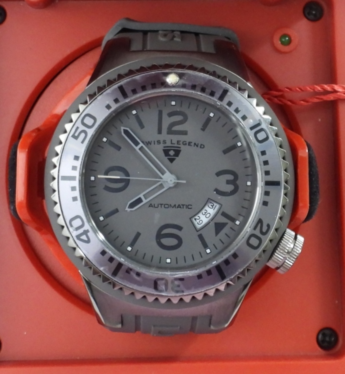 MEN’S SWISS LEGEND NEPTUNE WATCH SL-11819A,STAINLESS STEEL, WATER RESISTANT , SWISS MOVEMENT,GREY FACE AND BAND ,( RUNNING BUT NOT TESTED AT TO WORKING OR NOT) AND A SWISS LEGEND SINGLE WATCH WINDER IN BOX WITH