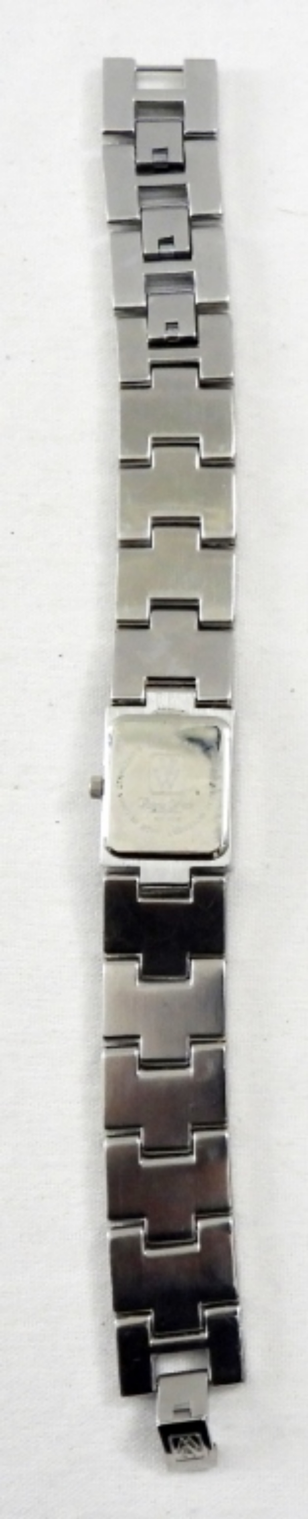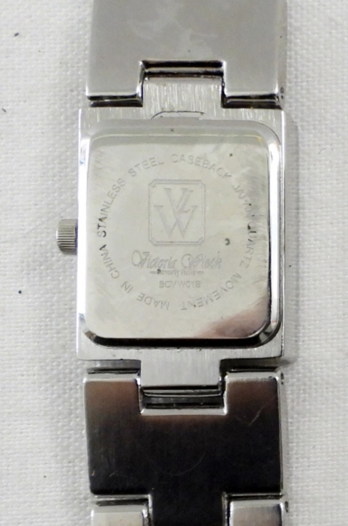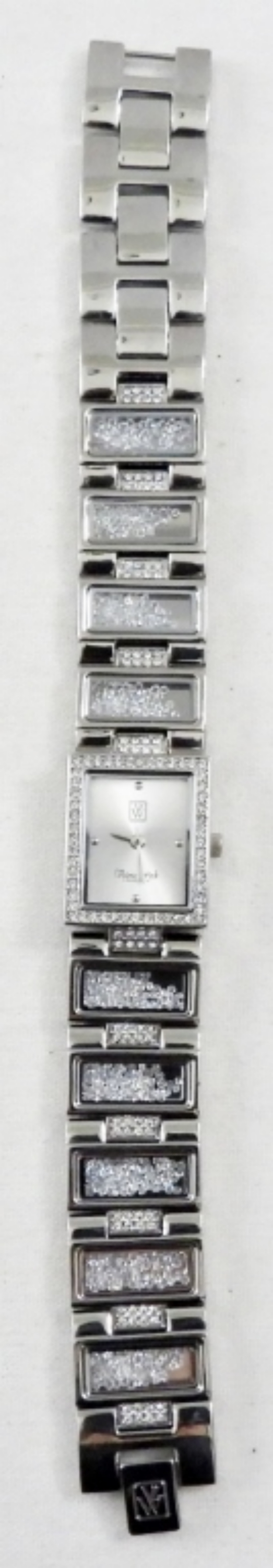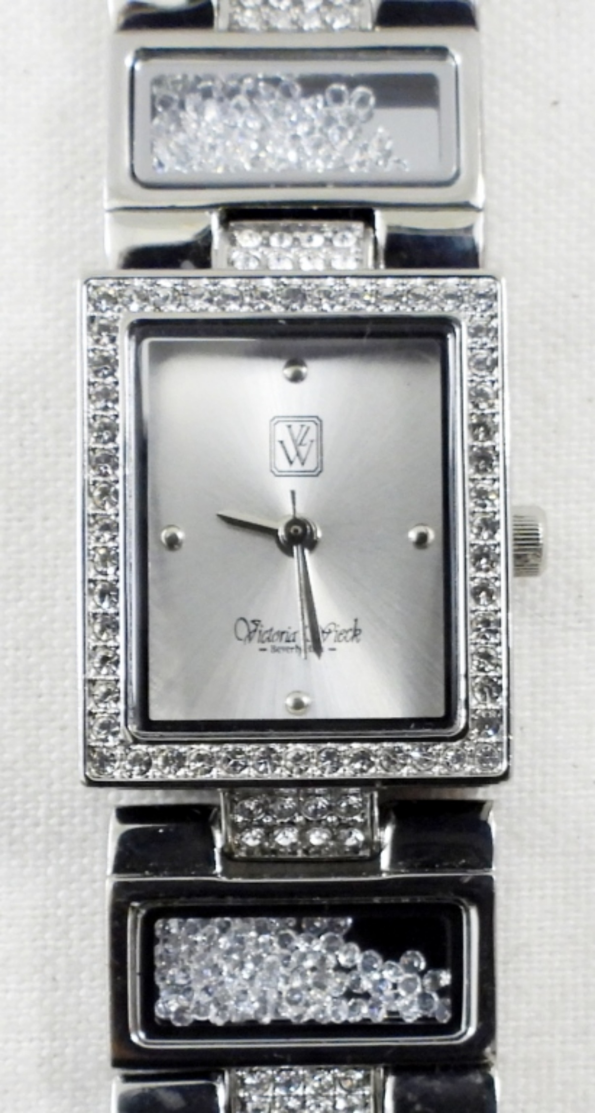 GORGEOUS SILVER TONE, FAUX DIAMOND ENCRUSTED LADIES WRIST WATCH. ONE LINK HAS A SMALL CRACK, STILL FUNCTIONS! BACK IS MARKED “VICTORIA WIECK BEVERLY HILLS – BCVW01B”. 7-9″ WITH REMOVABLE LINKS. -NOT TESTED AS