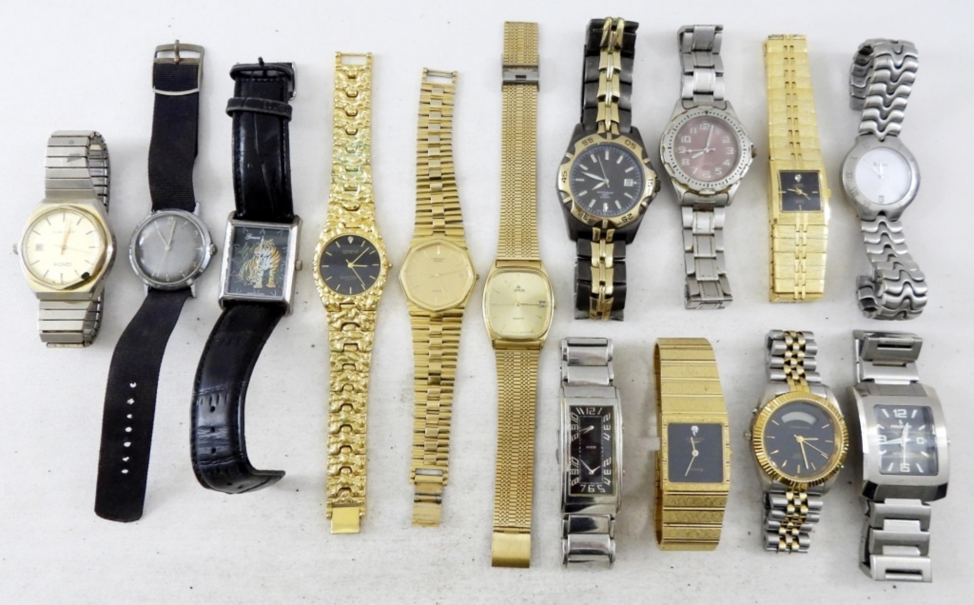 15 MEN’S WATCHES IN GOLD, SILVER TONES & LEATHER BANDS. LONGINES, BULOVA, GUESS, LORUS, SEIKO & MORE -NOT TESTED AS TO WORKING OR NOT!-