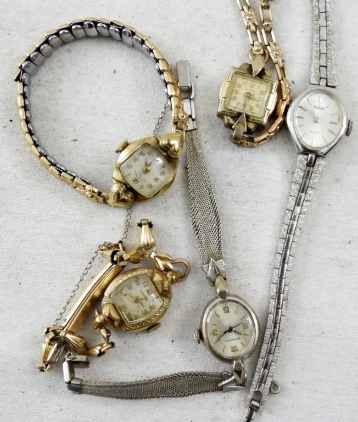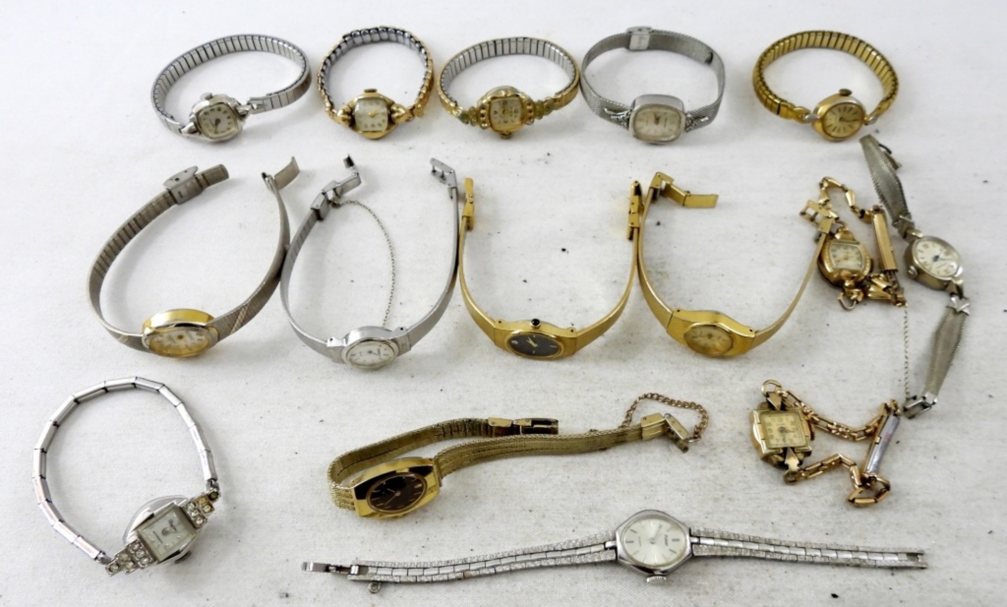 15 LADIES GOLD & SILVER TONE PETITE VINTAGE WATCHES. CARAVELLE, LATHAM, PULSAR, WITTNAUER -NOT TESTED AS TO WORKING OR NOT!-