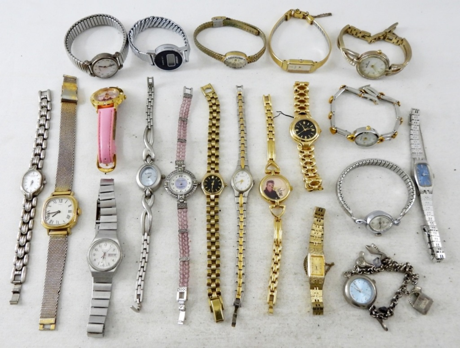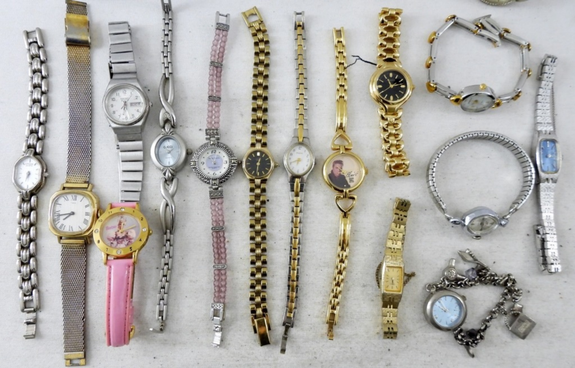 20 MODERN & VINTAGE FASHION LADIES WATCHES. ELVIS, BARBIE, CITIZEN, PULSAR, WALTHAM, SEIKO & MORE -NOT TESTED AS TO WORKING OR NOT!-
