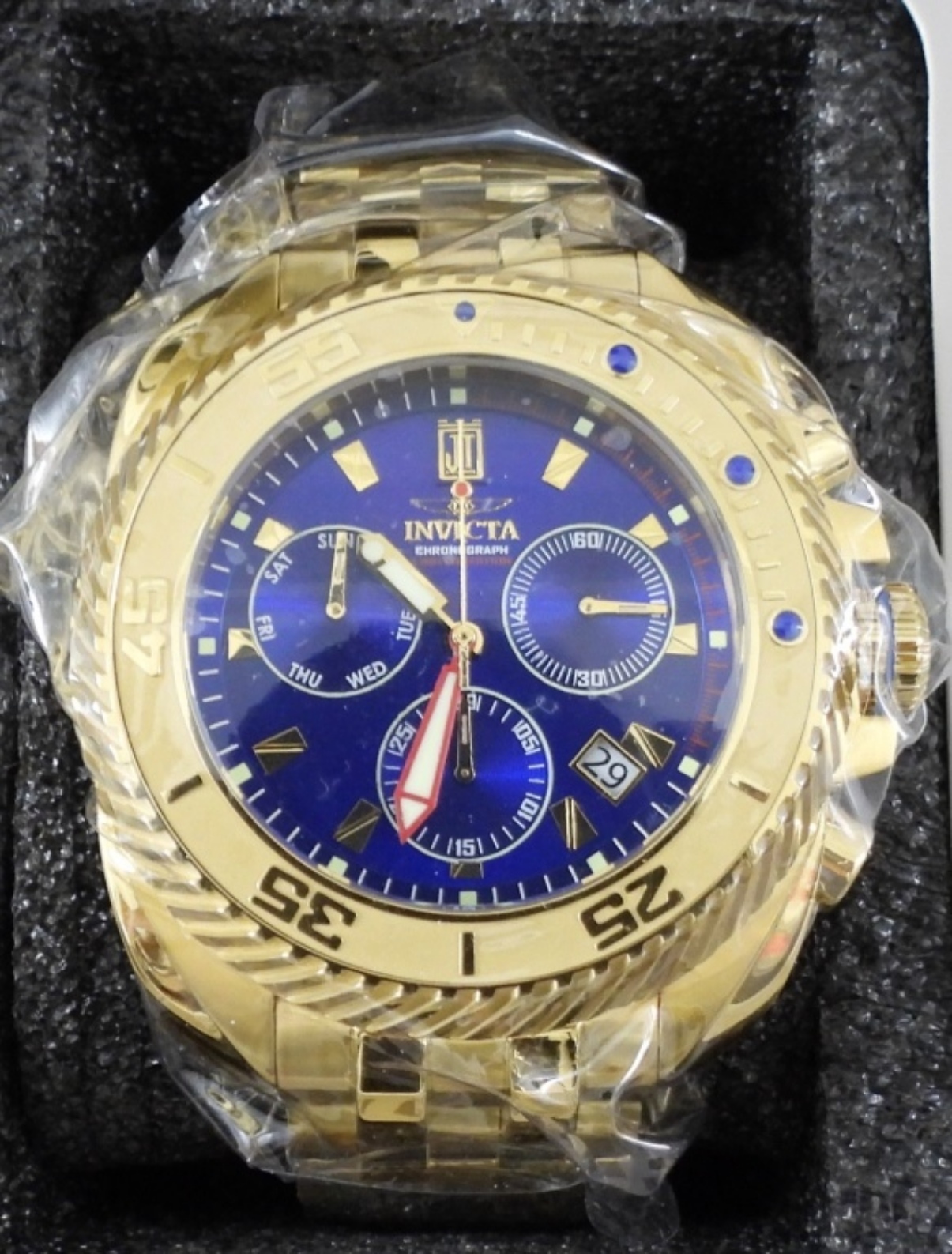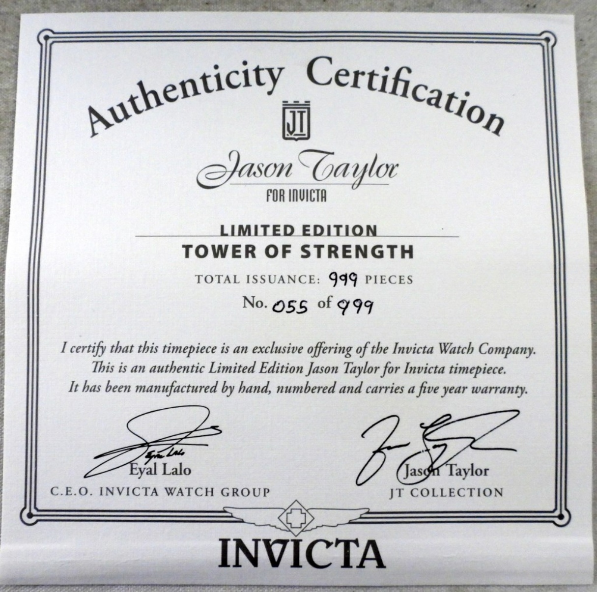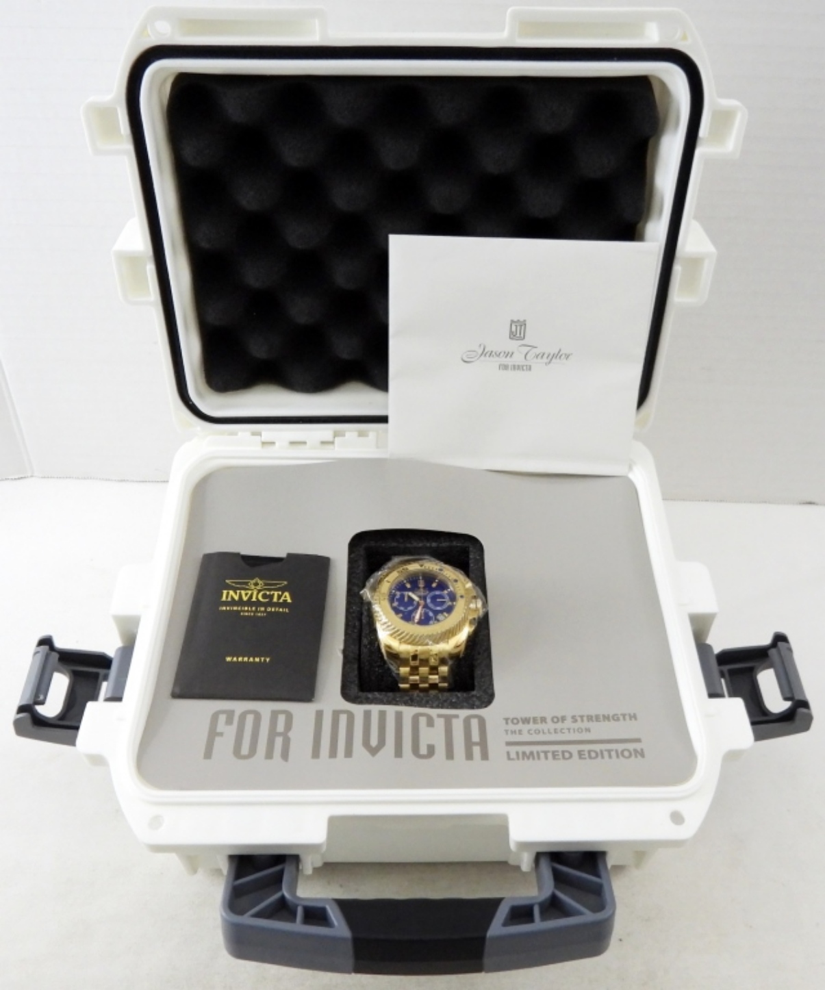 INVICTA JASON TAYLOR LIMITED EDITION 055/999 WITH CERTIFICATE. COMES IN AN INVICTA CARRYING CASE THAT FITS 3 WATCHES. GOLD TONE WATCH, VERY LARGE AND VERY HEAVY! MODEL # 26421. PRICE TAG $2095.00, STILL WRAPPED IN