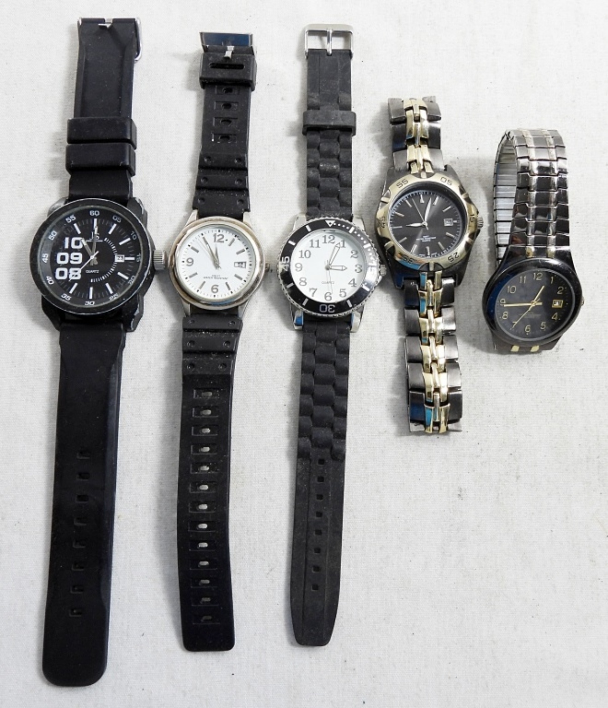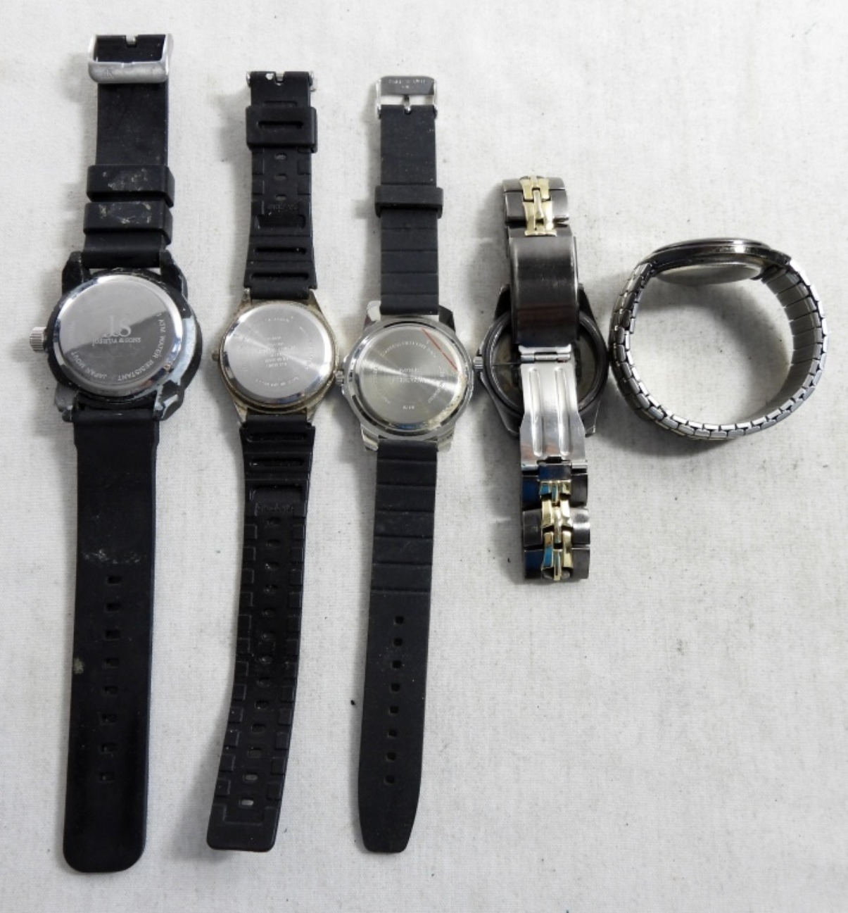 (5) MENS BLACK DATE WATCHES, ASSORTED BANDS AND FACE STYLES .QUARTZ & MORE. NOT TESTED AS TO WORKING OR NOT
