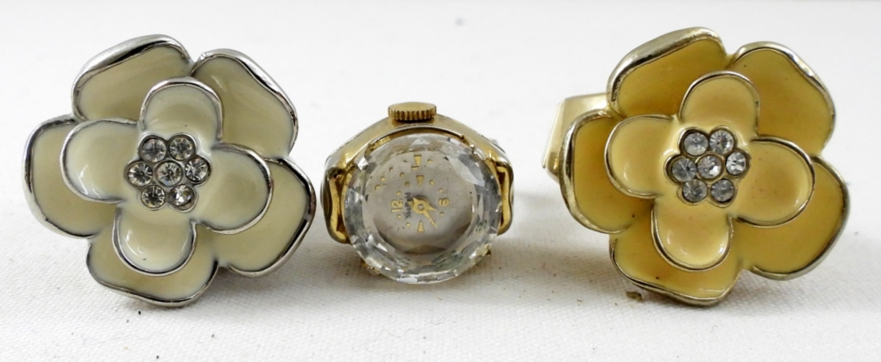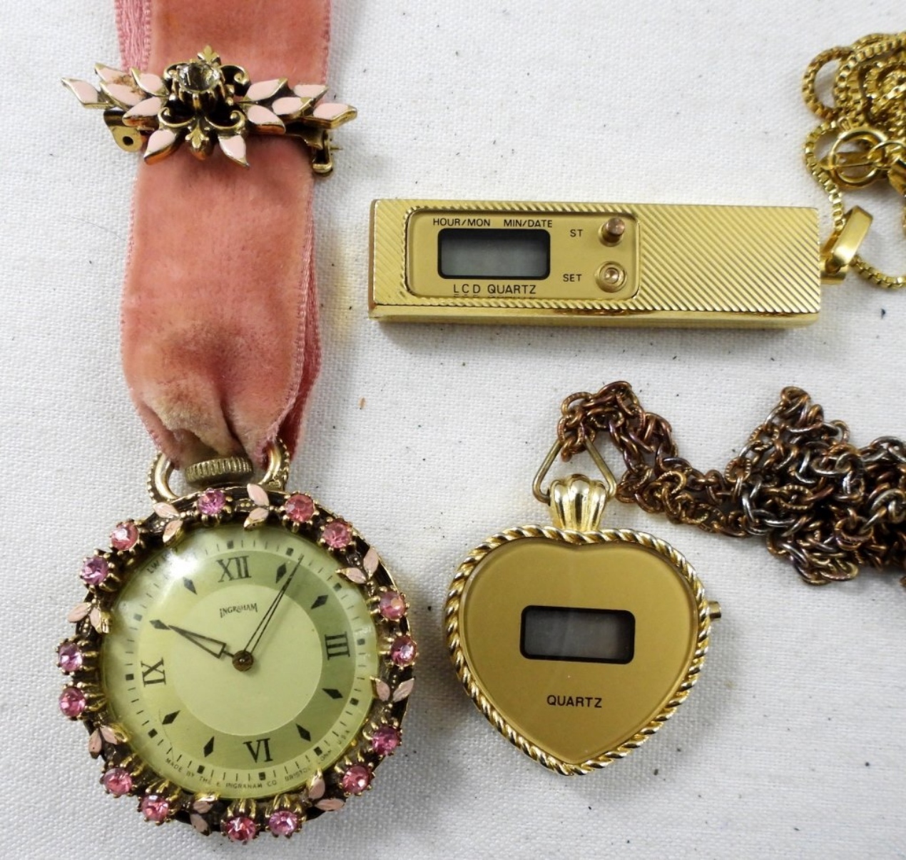 3 LADIES WATCH RINGS. ONE WATCH PIN. TWO DIGITAL WATCH PENDANTS. -NOT TESTED AS TO WORKING OR NOT!-
