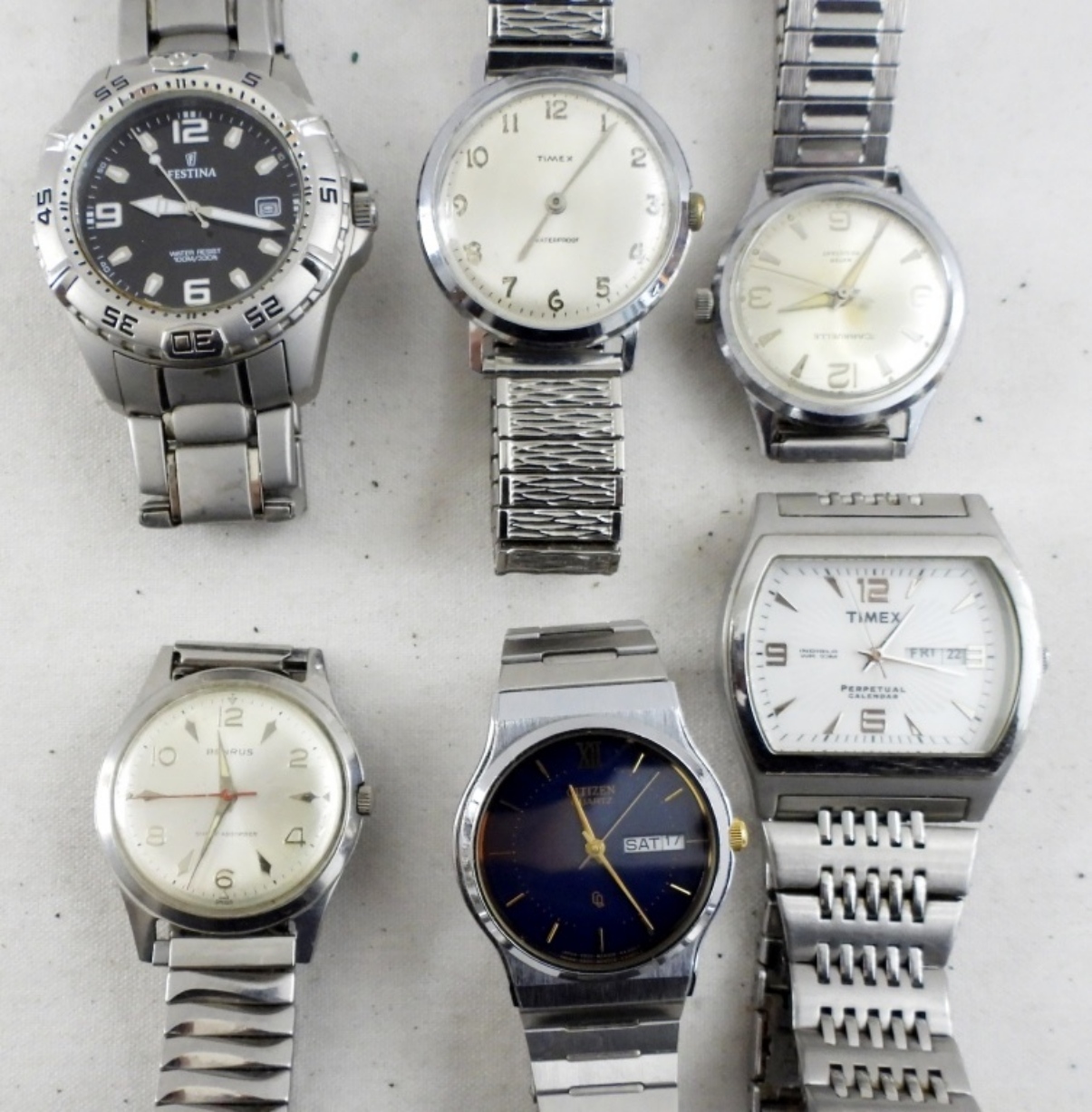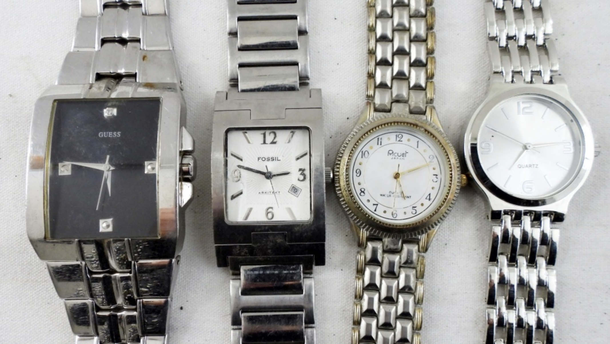 TEN SILVER TONE MEN’S WRIST WATCHES. VINTAGE & MODERN. LARGE GUESS WATCH HAS A BROKEN BAND! CARAVELLE, BENRUS, TIMEX, FOSSIL, GUESS & MORE. -NOT TESTED AS TO WORKING OR NOT!-