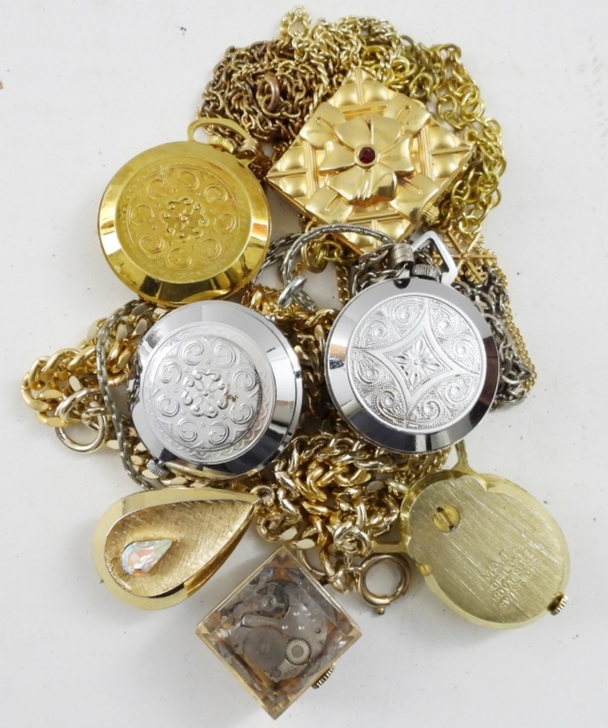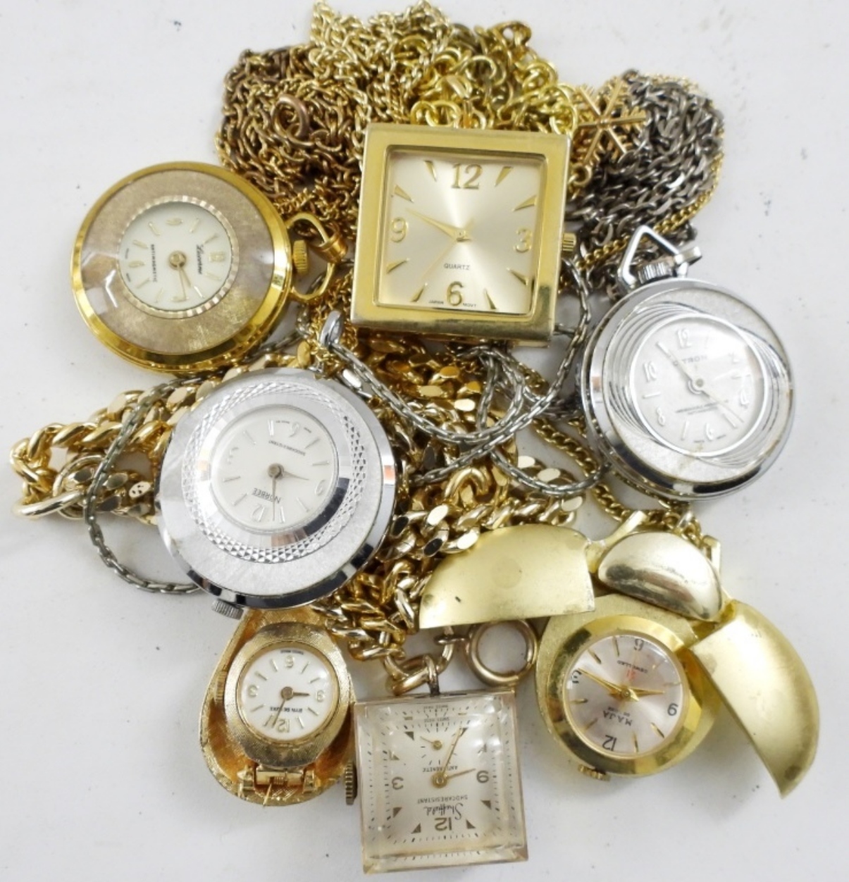 7 GOLD & SILVER TONE PENDANT WATCHES. WITH VARYING LENGTH OF CHAINS. CITRON, SHEFFIELD, LUCERNE & MORE -NOT TESTED AS TO WORKING OR NOT-