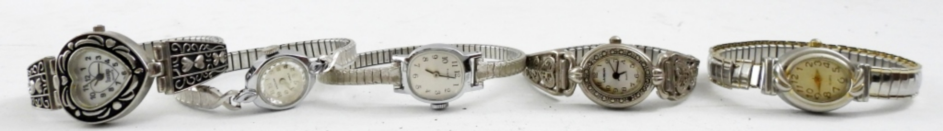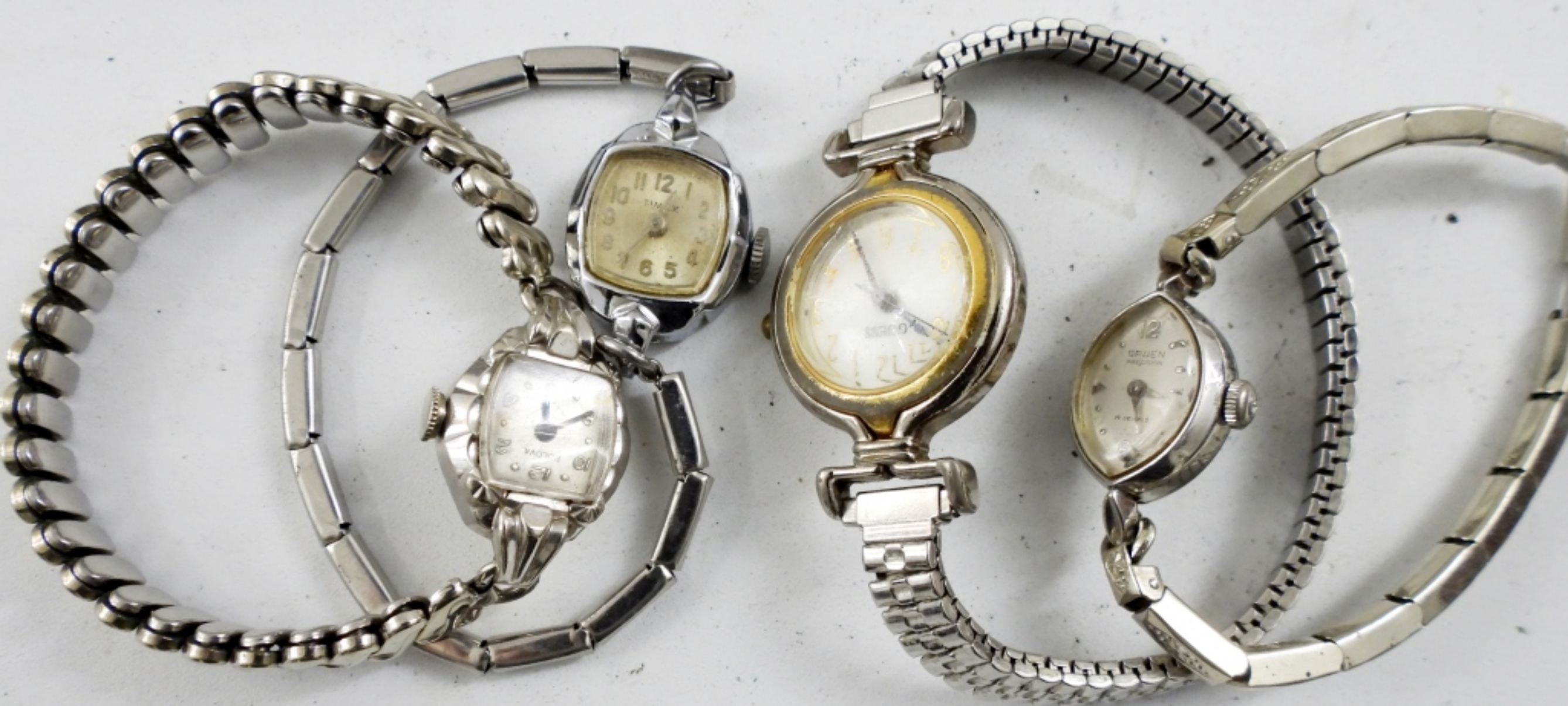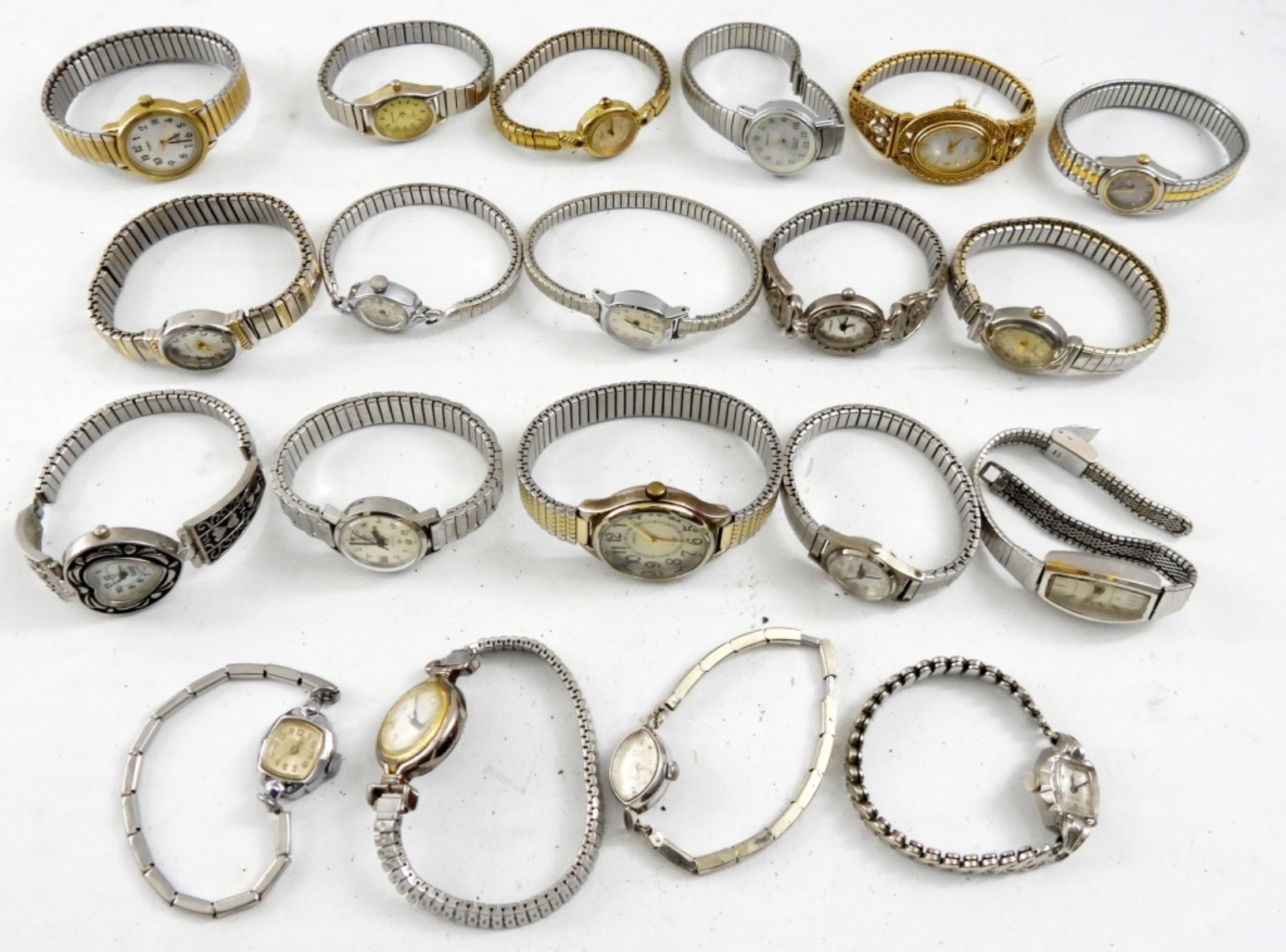 20 LADIES GOLD & SILVER TONE STRETCHY BAND WATCHES. TIMEX, WALTHAM, BULOVA, HELBROS, GRUEN, SHARP. -NOT TESTED AS TO WORKING OR NOT-