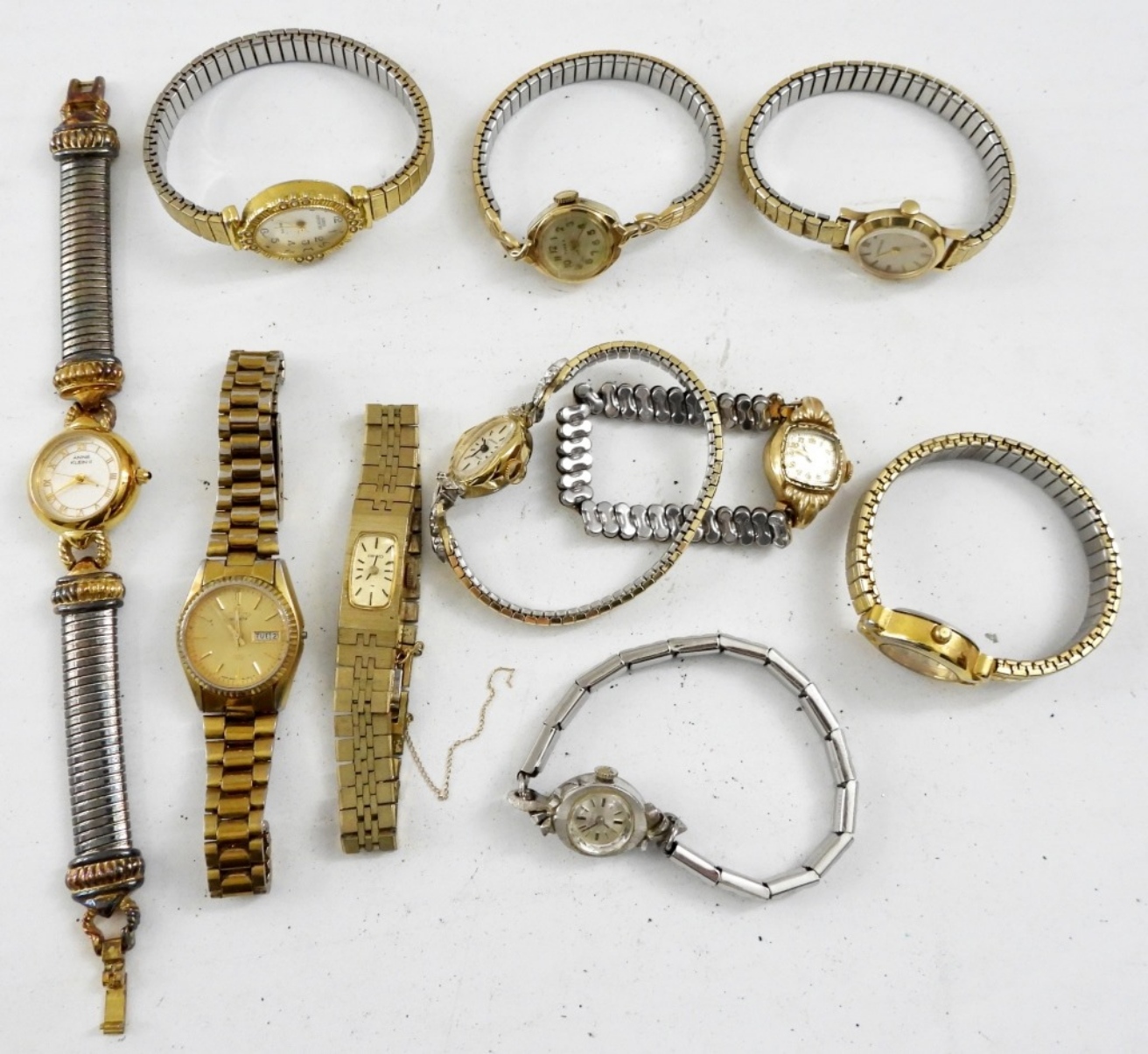 TEN VINTAGE LADIES WATCHES. SEIKO, LONGINES, SARAH COVENTRY, WITTNAUER, BULOVA -NOT TESTED AS TO WORKING OR NOT-