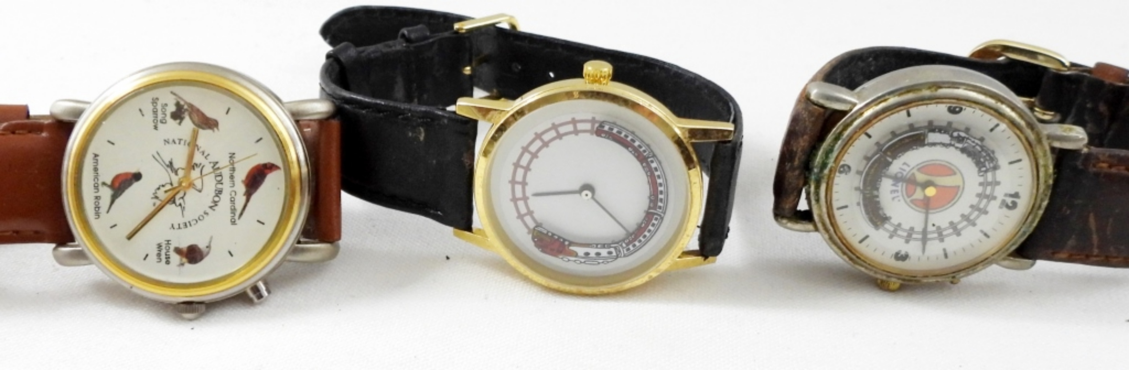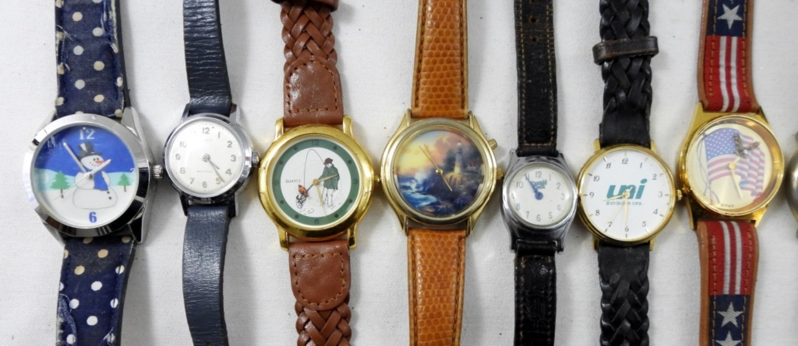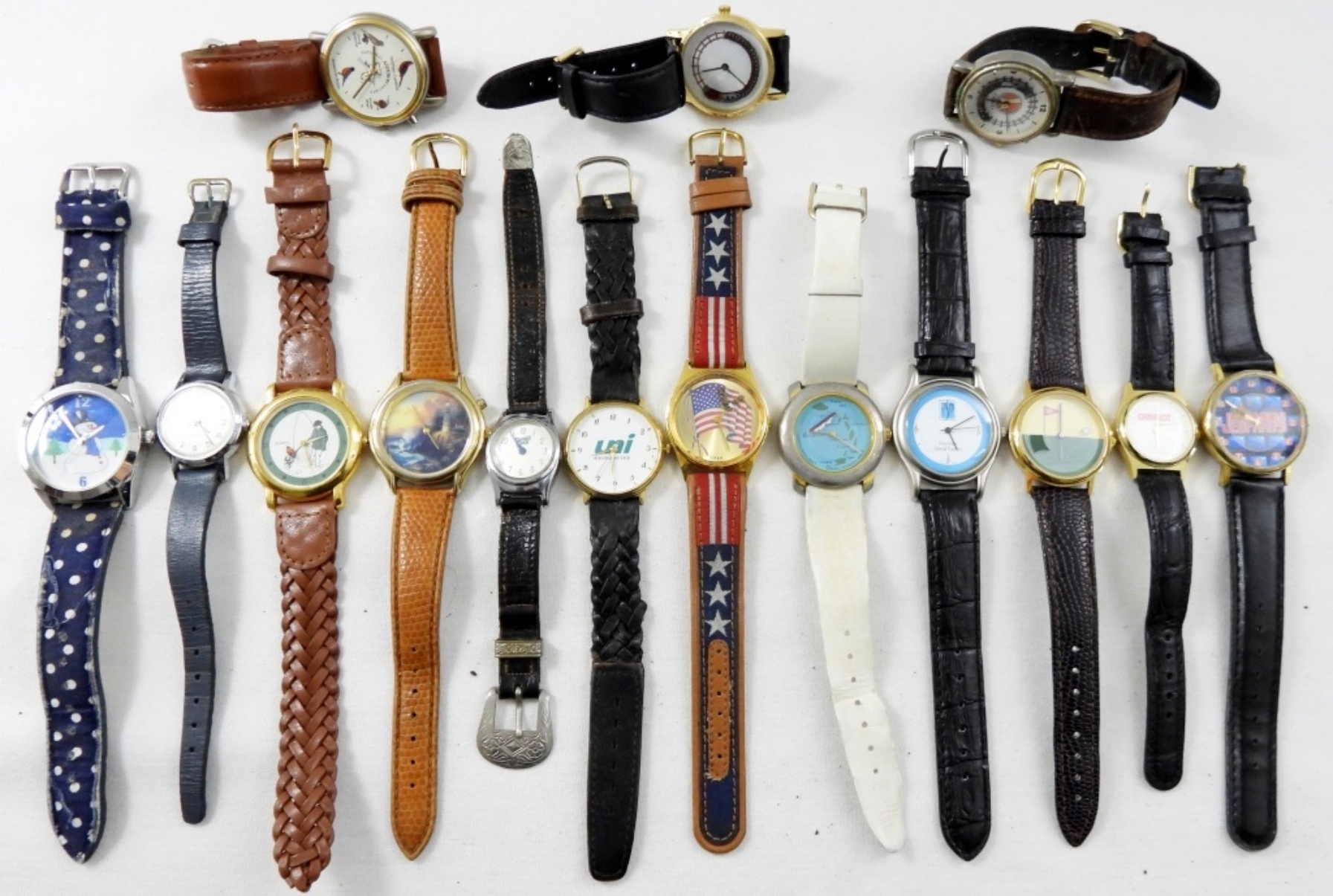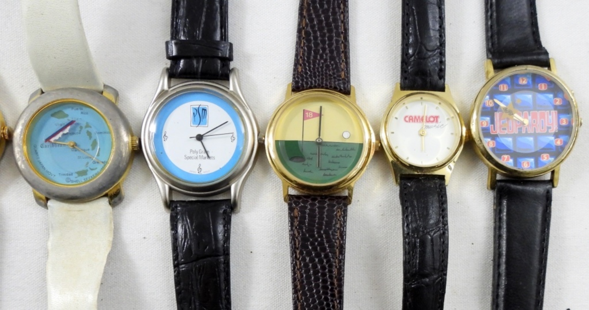 15 VINTAGE NOVELTY WRIST WATCHES. SNOWMAN, JEOPARDY, GOLF, COMPANY BRANDINGS -NOT TESTED AS TO WORKING OR NOT!-