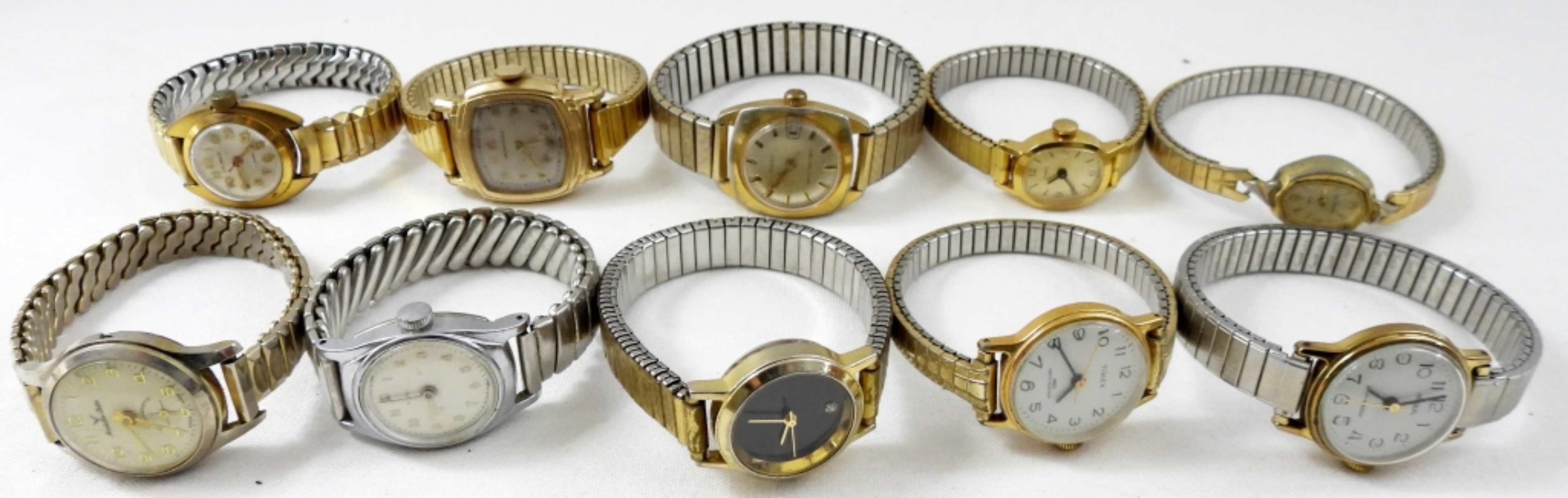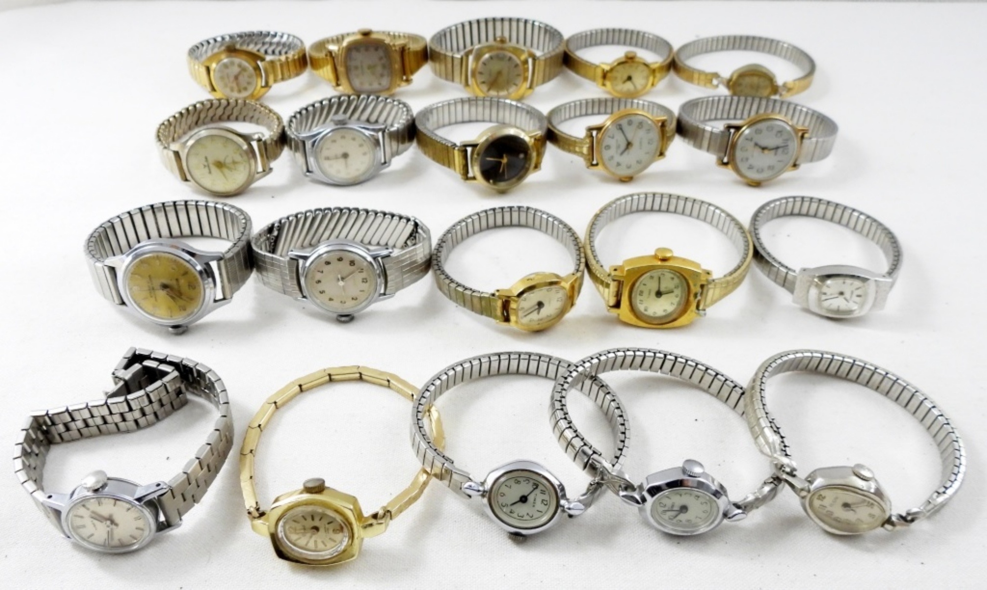 20 STRETCHY BAND WATCHES. GOLD & SILVER TONES. MANHATTAN ELECTRA, TIMEX, WESTCLOX, ELGIN & MORE -NOT TESTED AS TO WORKING OR NOT!-