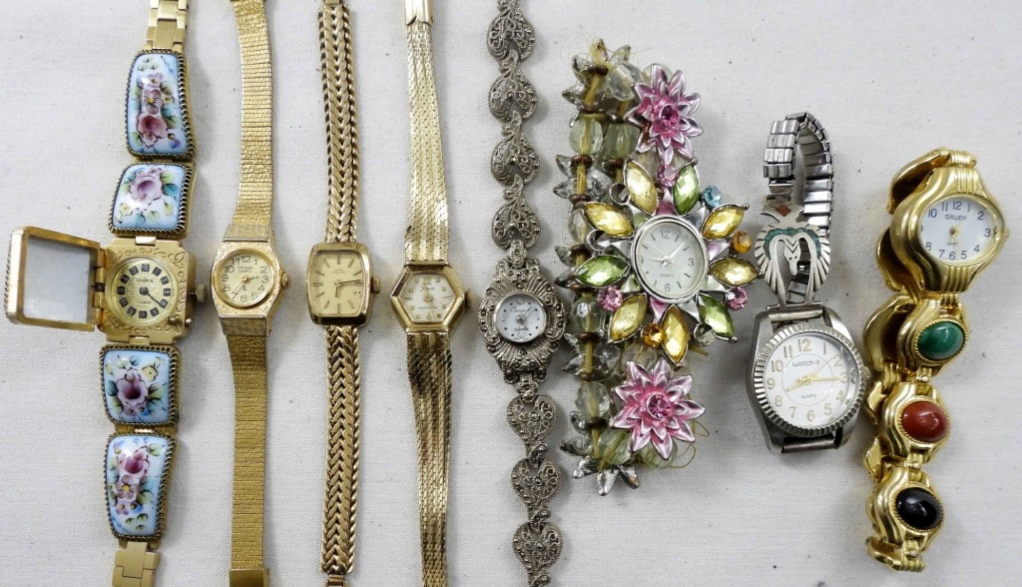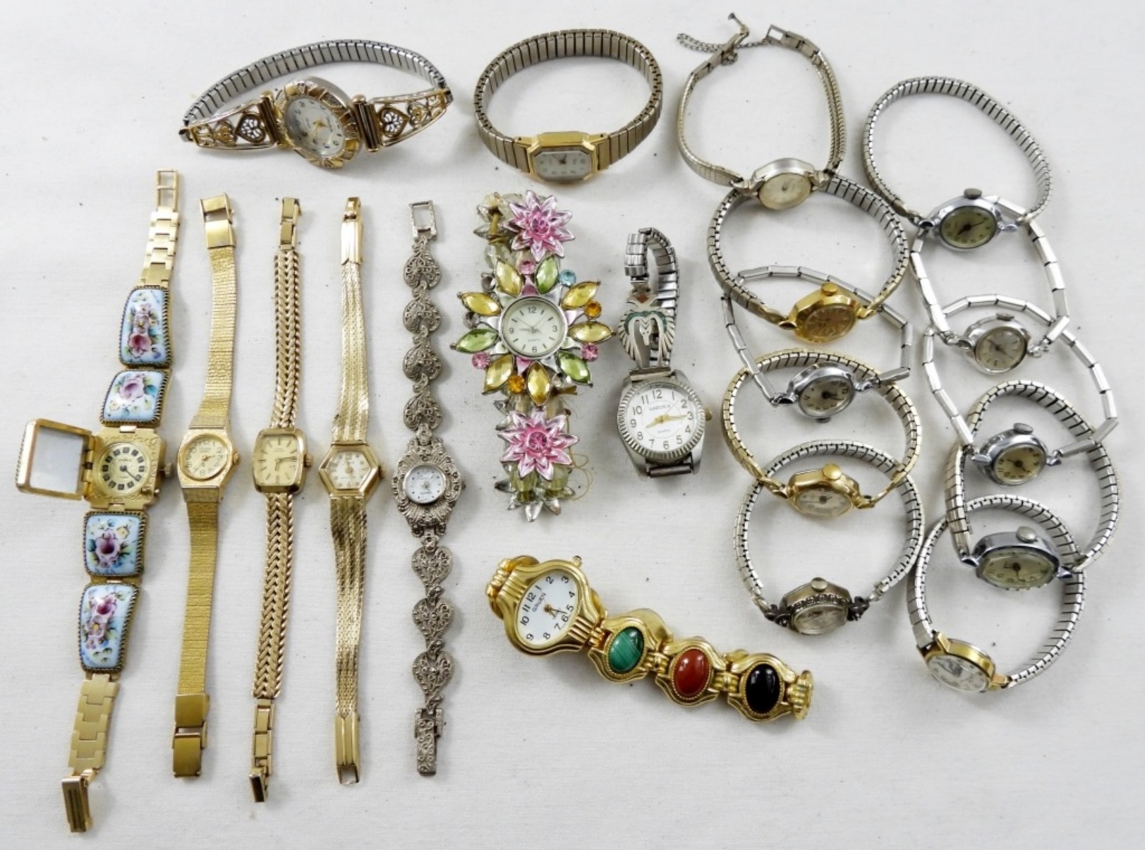 20 FANCY VINTAGE TO MODERN LADIES WRIST WATCHES. TIMEX, WATCHIT, GRUEN, SHEFFIELD, CITIZEN & MORE -NOT TESTED AS TO WORKING OR NOT!-