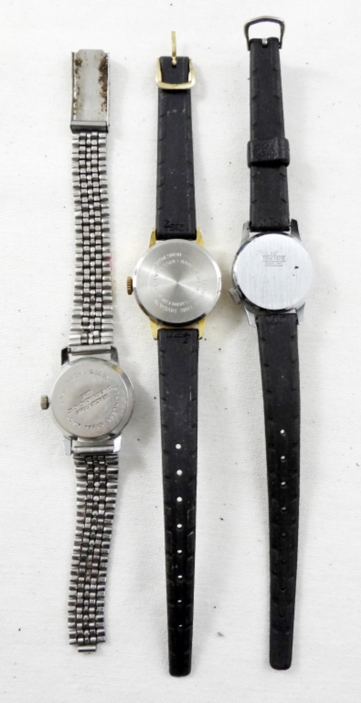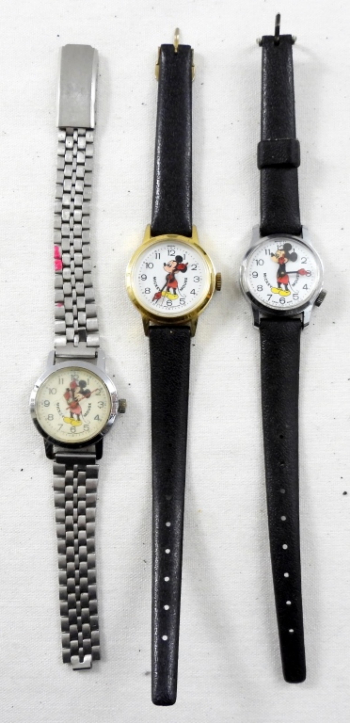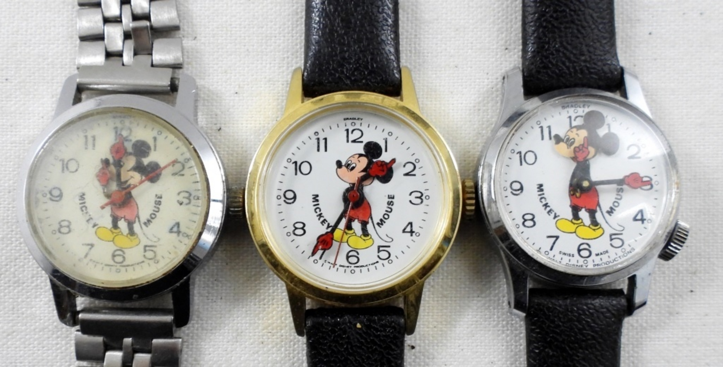 3 VINTAGE BRADLEY MICKEY MOUSE WATCHES, RED GLOVES. METAL BAND BROKEN. -NOT TESTED AS TO WORKING OR NOT!-