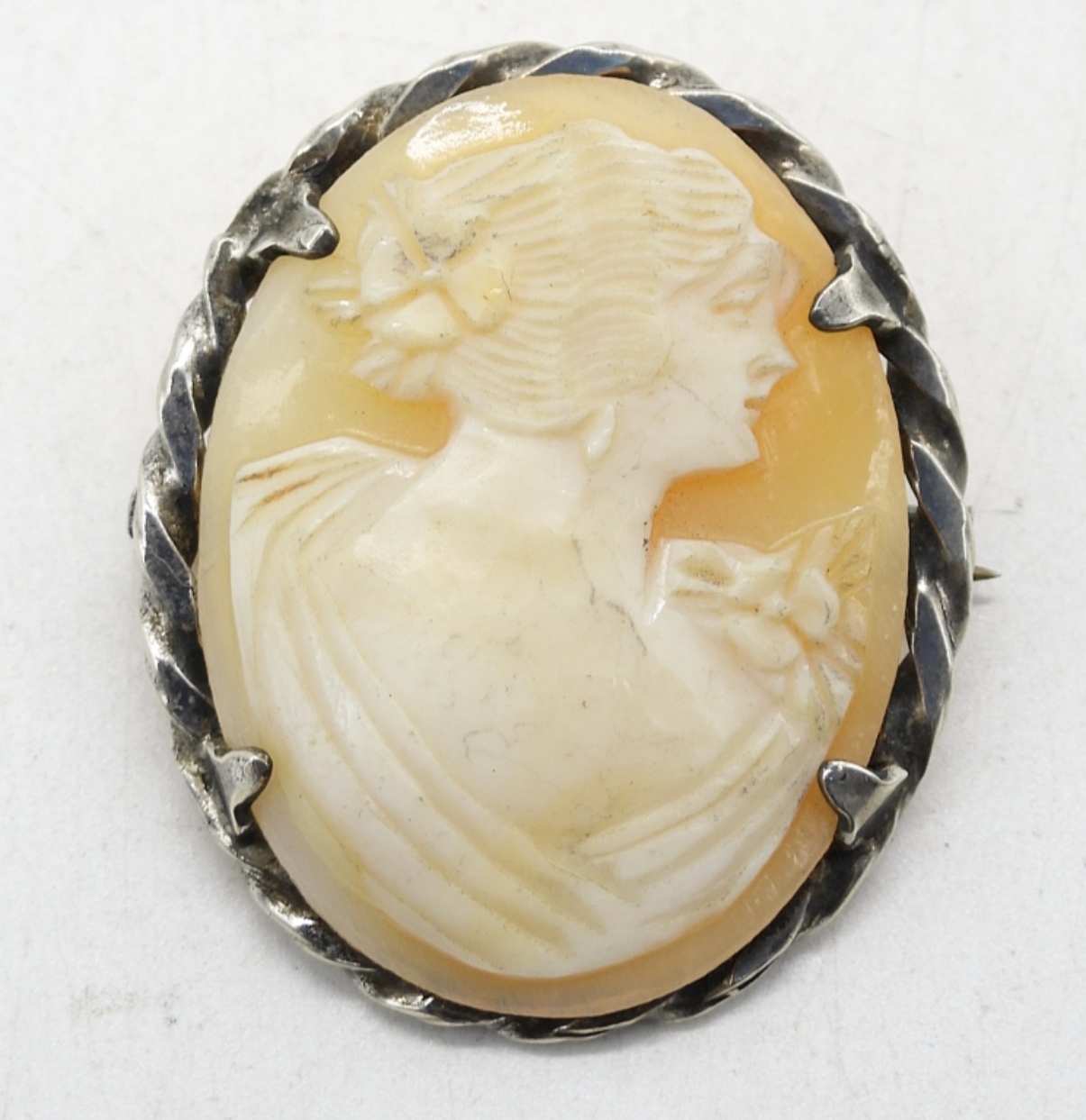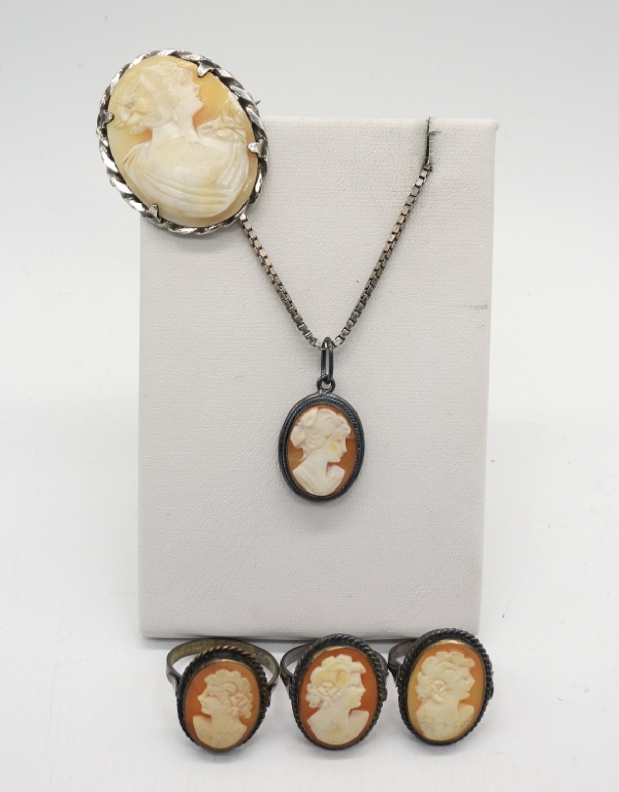 3 STERLING SILVER CAMEO RINGS, SIZES 5, 6, 7. STERLING CAMEO PENDANT ON A STERLING 20″ CHAIN. VINTAGE STERLING BROOCH WITH A LIGHT COLORED CAMEO. 13.6 DWT