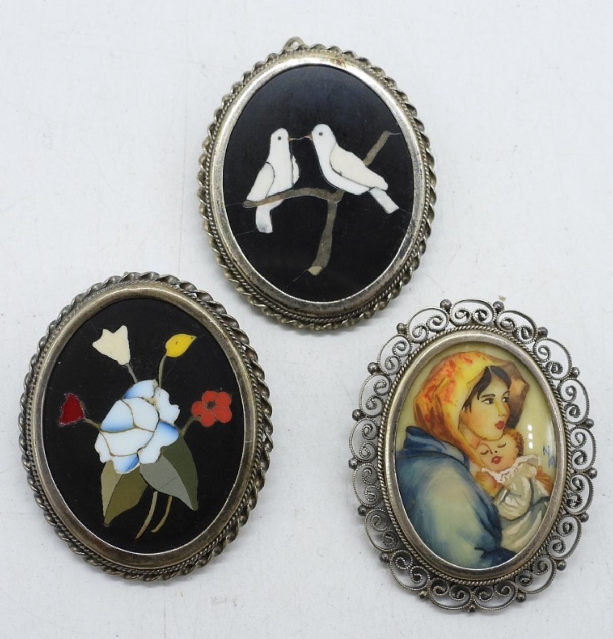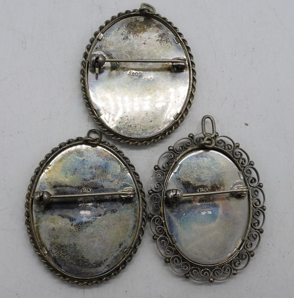 THREE MOSAIC / PORTRAIT BROOCH PENDANTS. BACKS ARE MARKED “ITALY 800” & “STAR 281 FI”. NOT STAMPED 925! STAMPED 800! 17 DWT