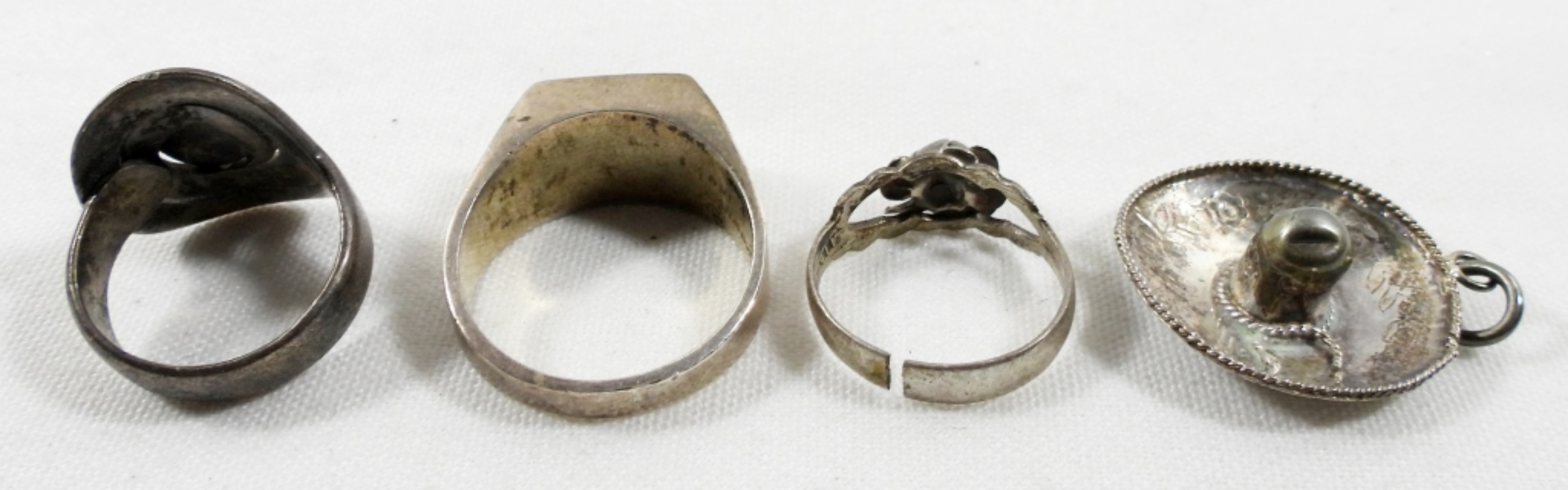 VINTAGE MEXICO GREEN STONE RING SIZE 10, HAT PENDANT FOR A NECKLACE ( NECKLACE NOT INCLUDED), 1 MULTICOLOR STONE RING SIZE 6, & OPAL STONE RING SIZE 6 STERLING SILVER 925 12.3 DWT