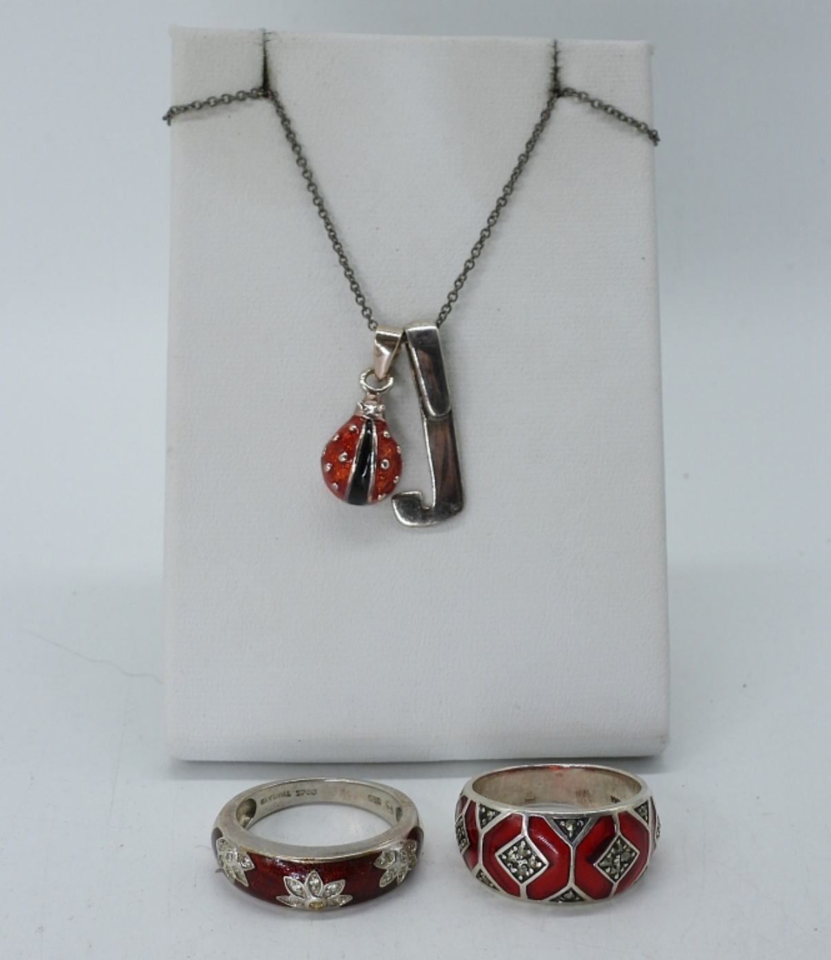 TWO STERLING RINGS, SIZES 7. LADYBUG & J PENDANTS ON A 18″ CHAIN. 8.5 DWT