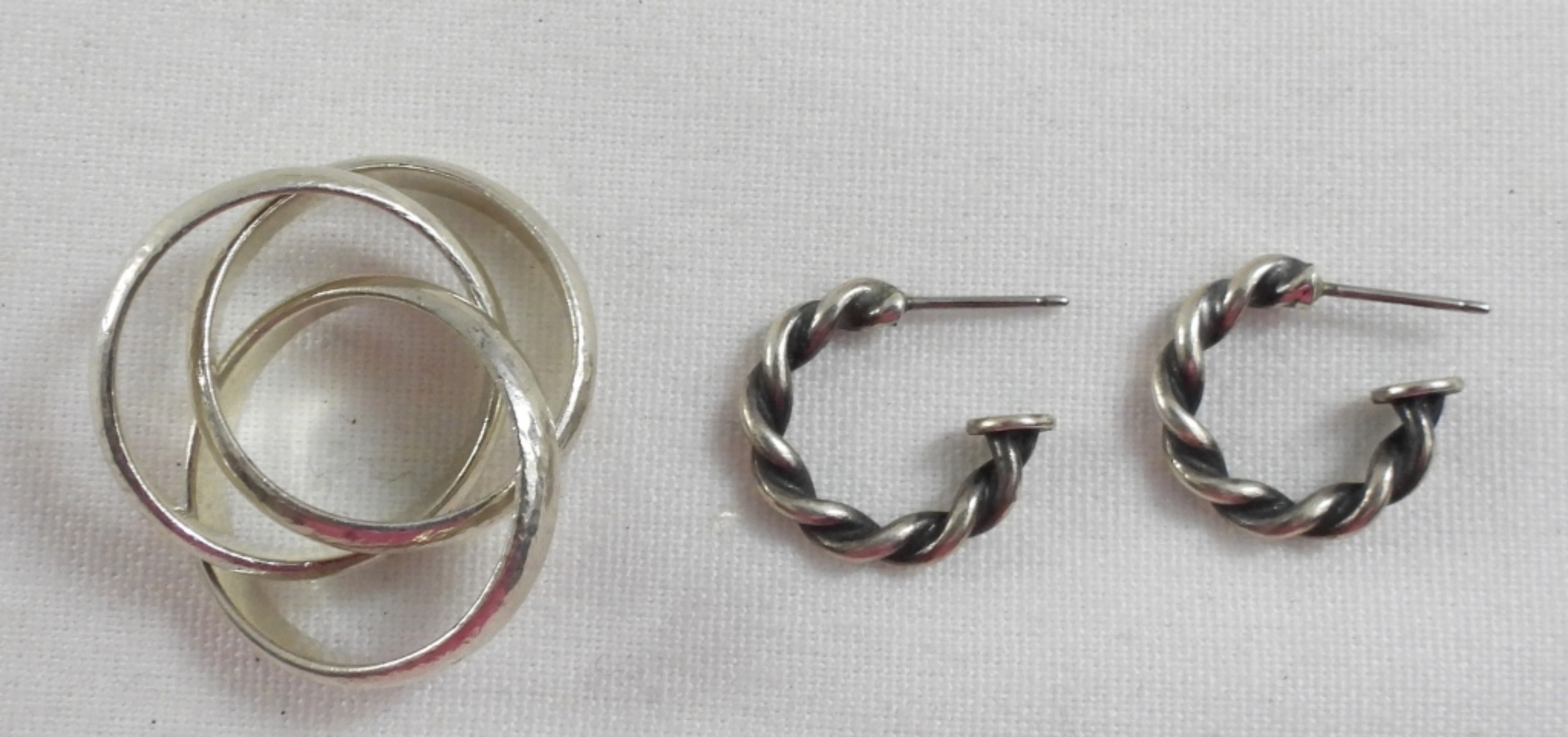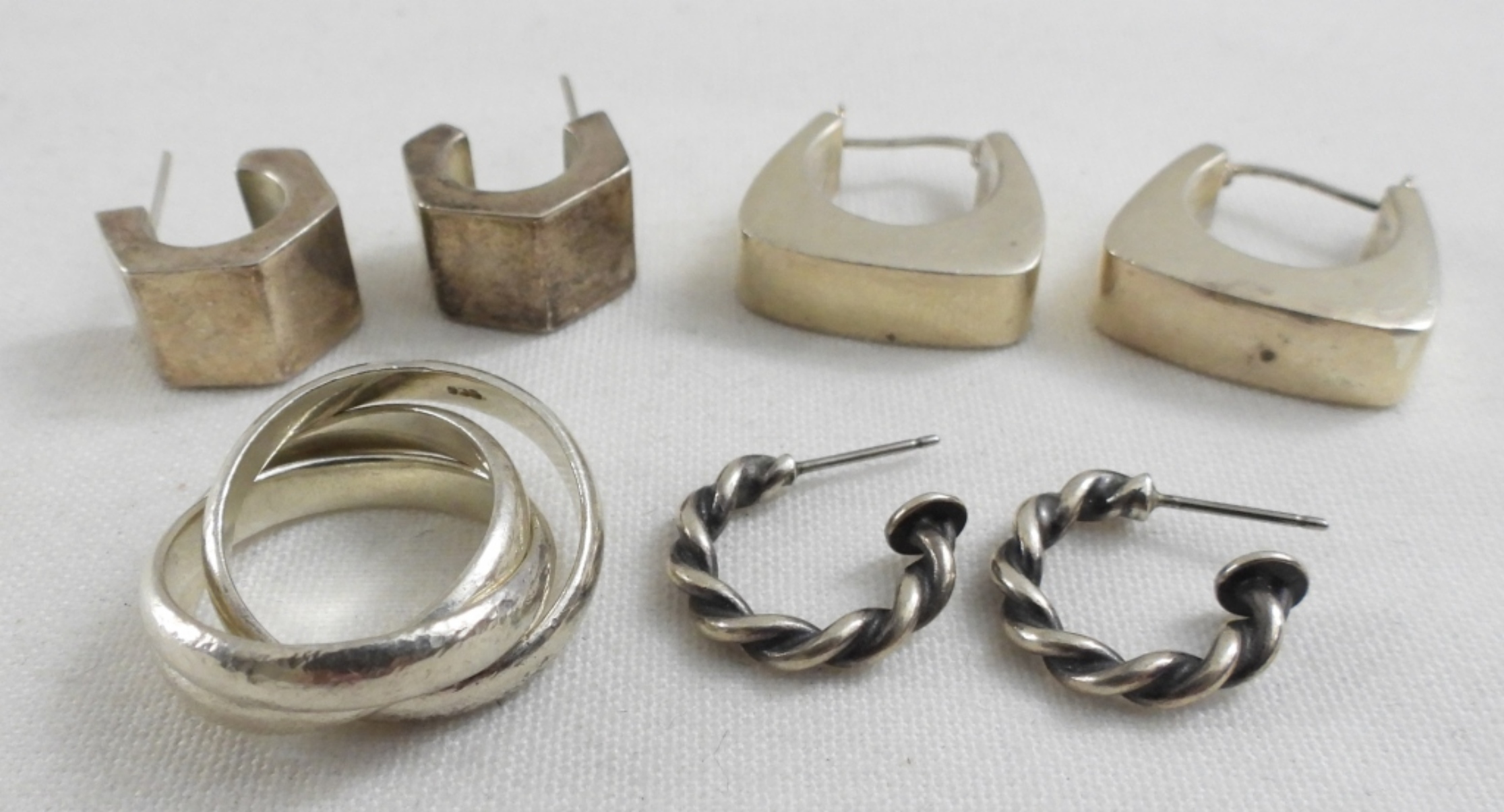 3 EARRINGS, 1 STACKING RING SIZED 5, 14.6 DWT